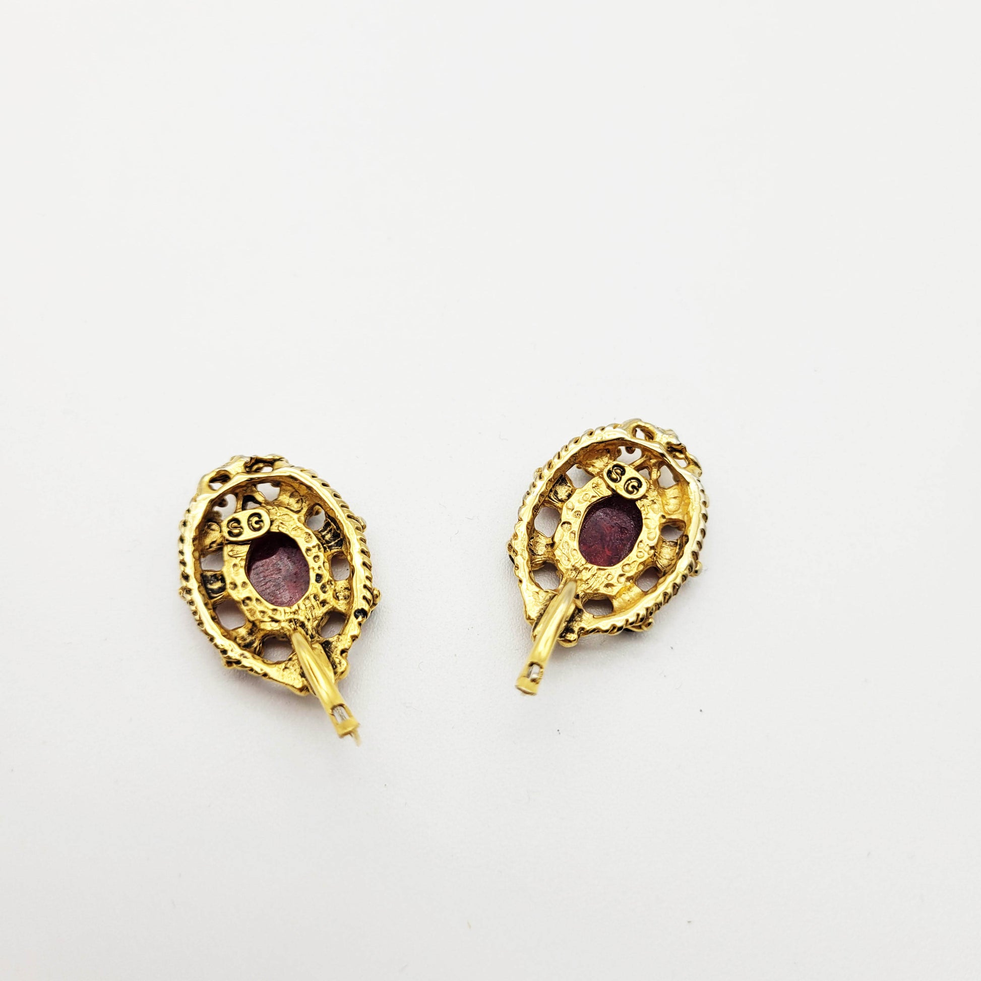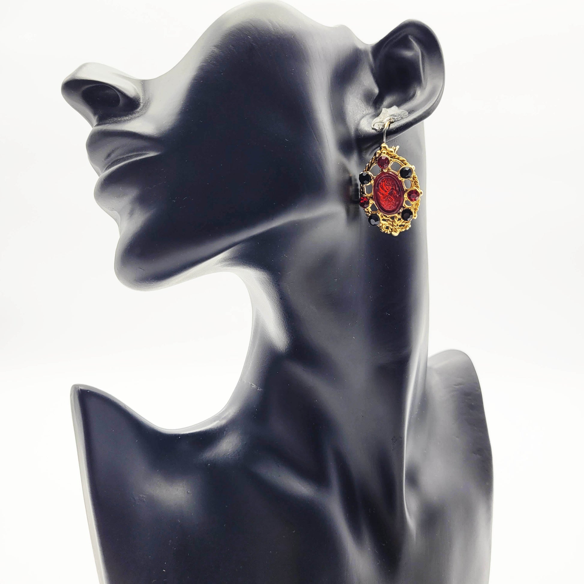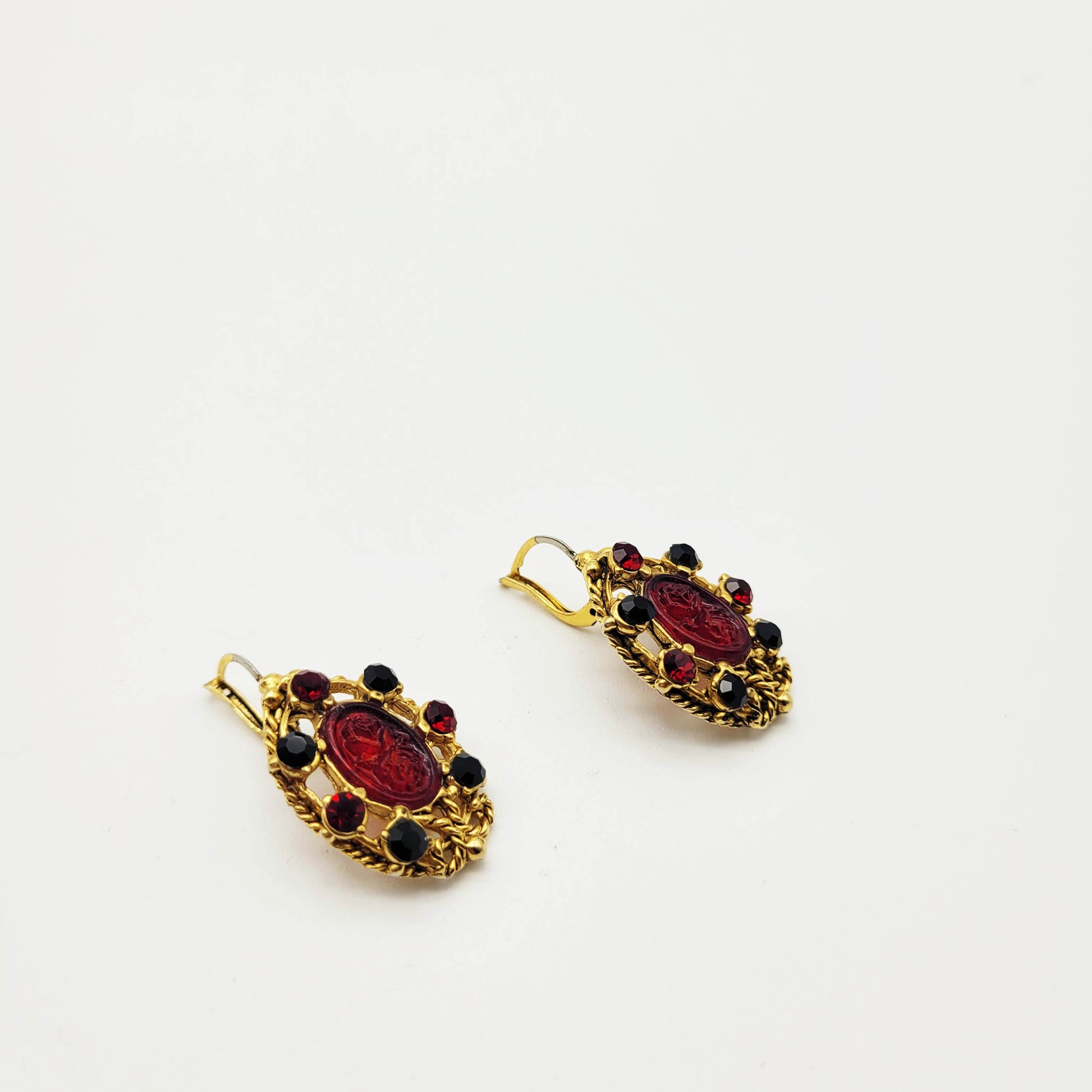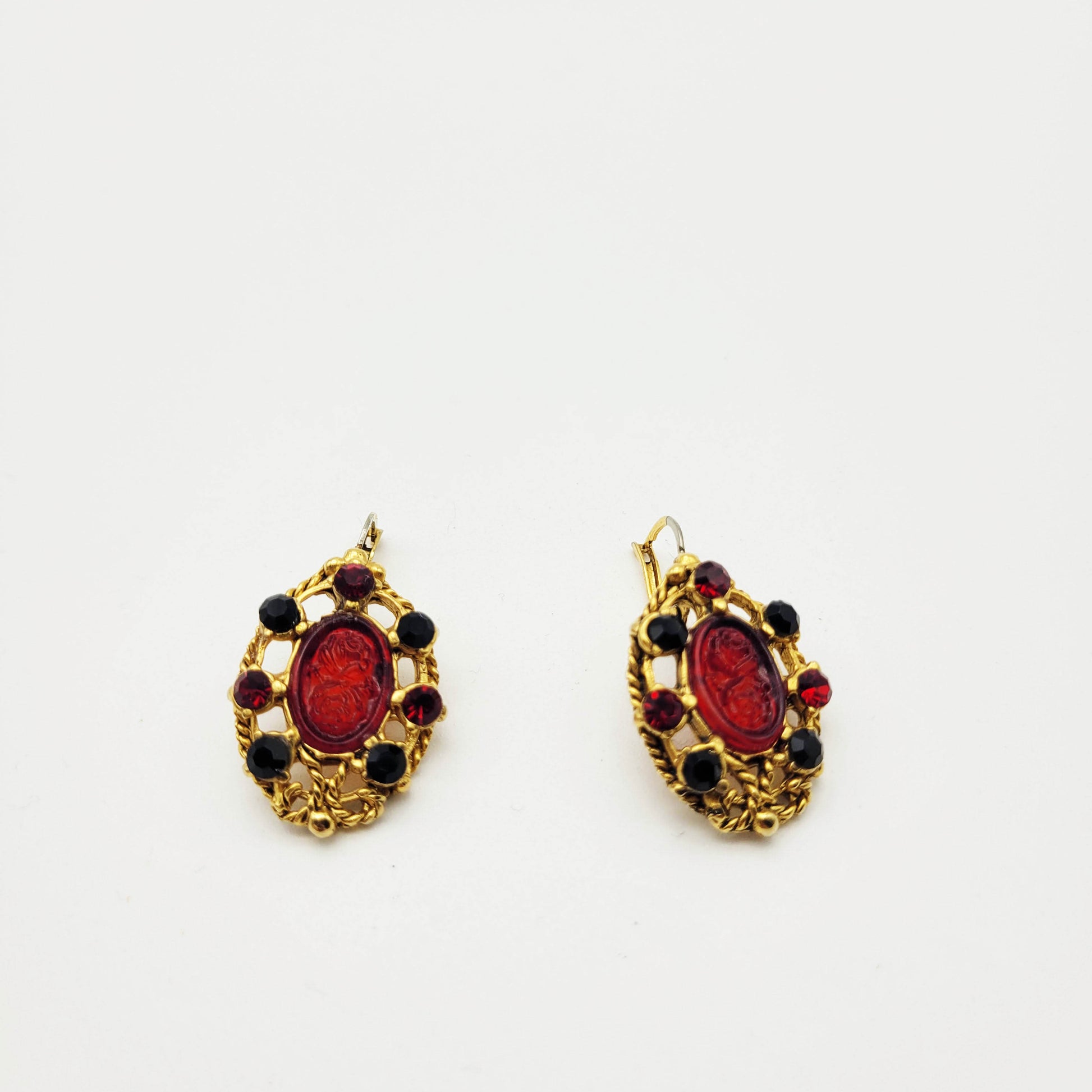 Check out these elegant vintage red oval earrings. These unique earrings feature an oval shape with beautiful flower details crafted in resin, surrounded by red and black rhinestones. You can wear them everyday to add some sophistication to your outfit.