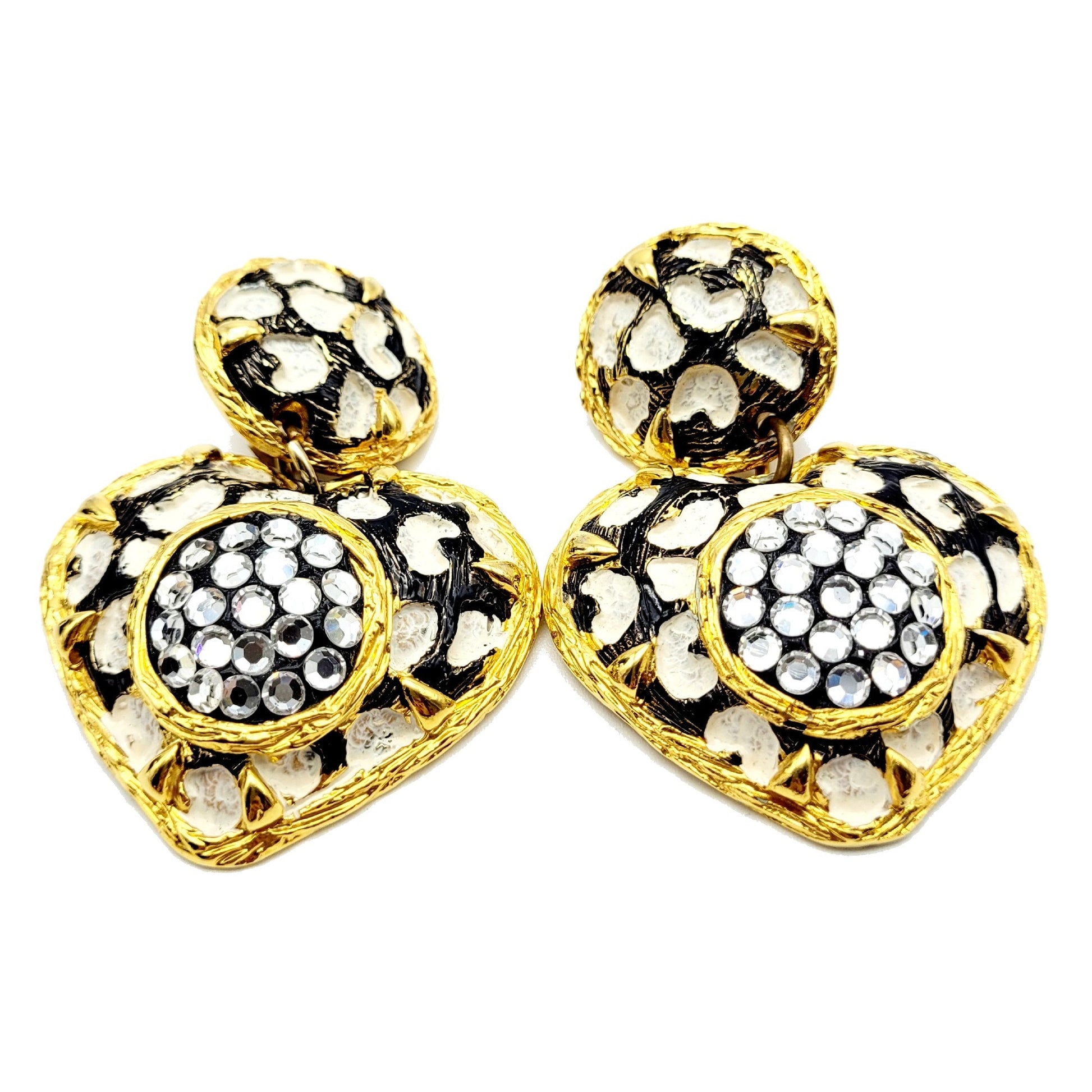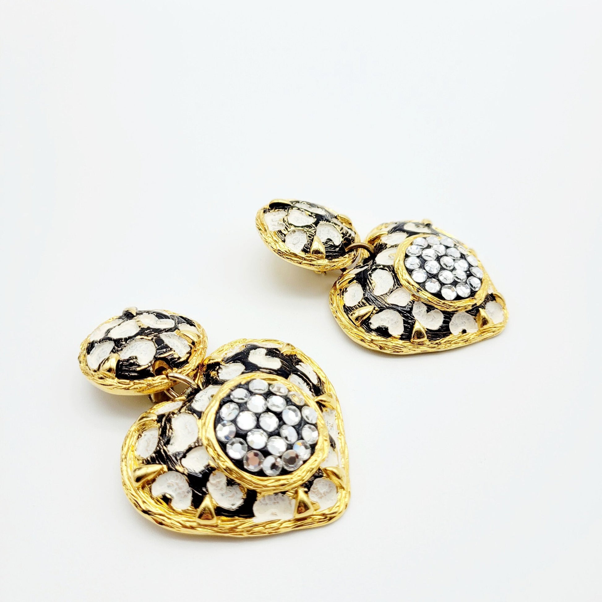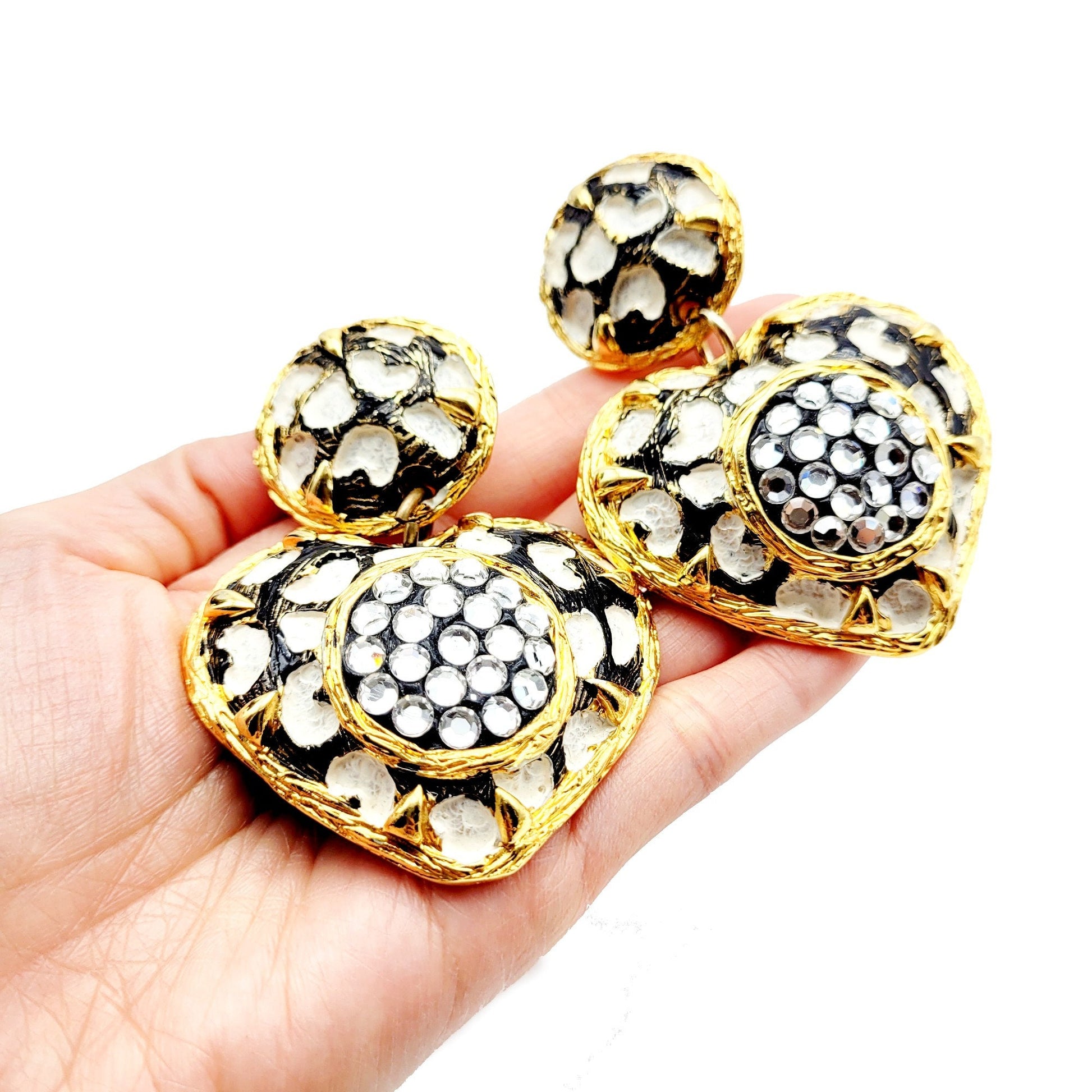 Brand: Jacky De G Color: Black, white and goldtoneMaterial: Goldtone metal and strasses, resinCondition: The front is in excellent condition. The back has scratches and imperfections (zoom in photos for details). Since the model's earrings are stiff, I added the 3rd photo to see how the earrings drop when put onMeasurements: Height 8.2 cm x Width 5.7 cmAccessories:
