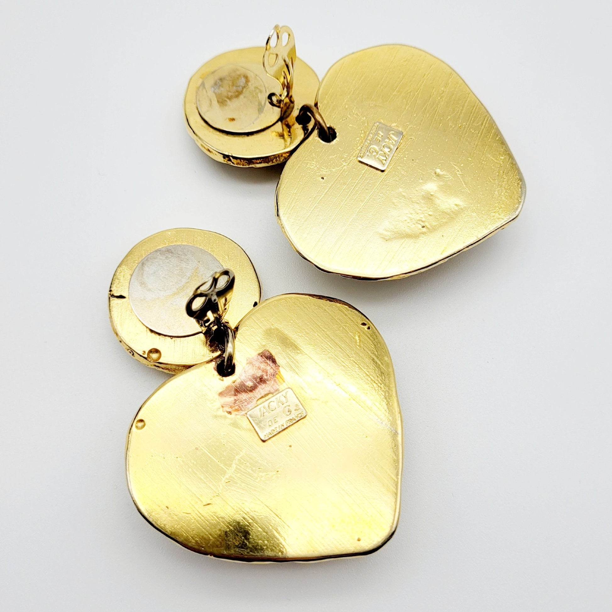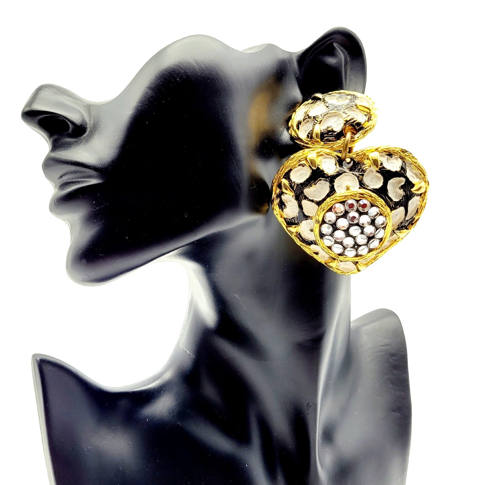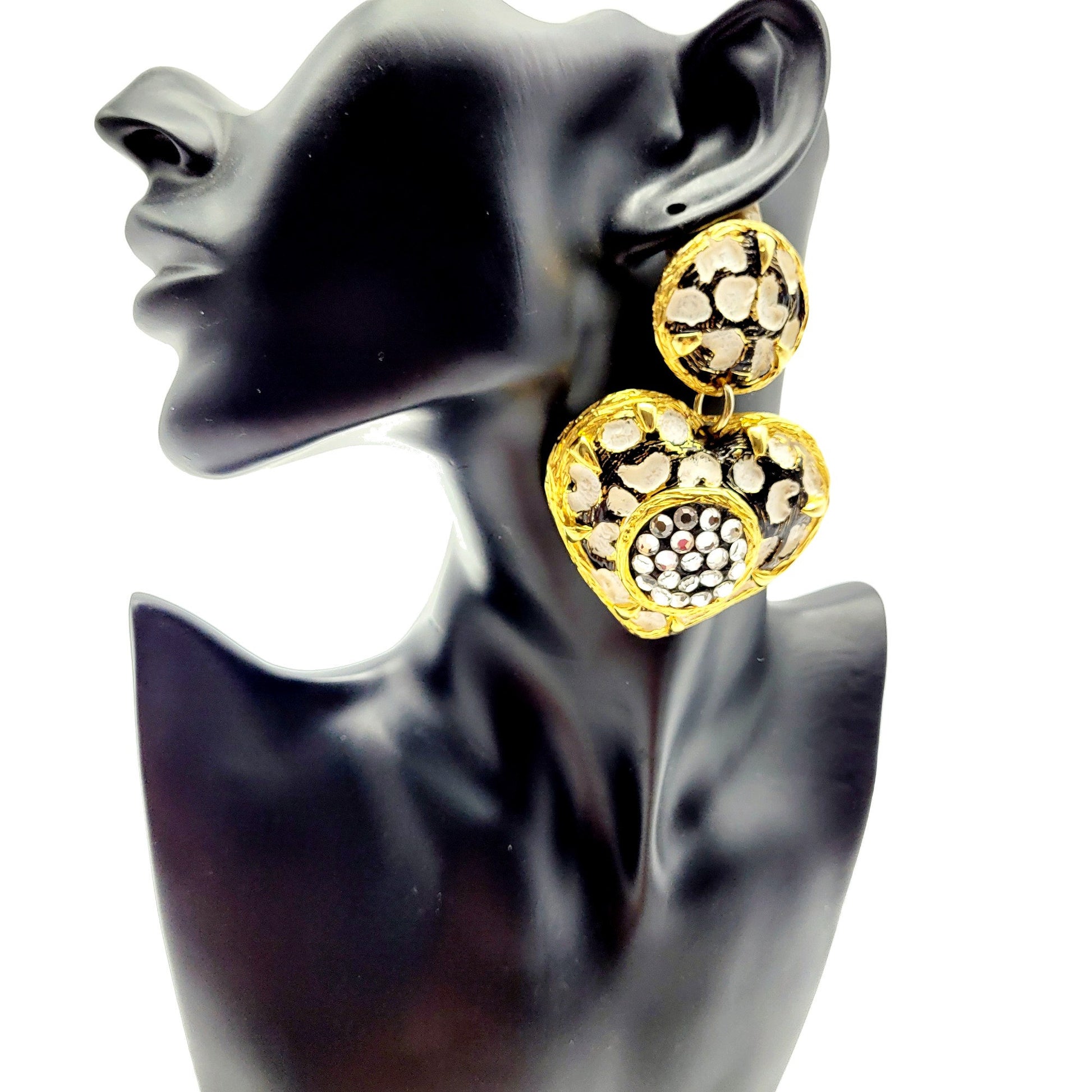 Brand: Jacky De G Color: Black, white and goldtoneMaterial: Goldtone metal and strasses, resinCondition: The front is in excellent condition. The back has scratches and imperfections (zoom in photos for details). Since the model's earrings are stiff, I added the 3rd photo to see how the earrings drop when put onMeasurements: Height 8.2 cm x Width 5.7 cmAccessories: