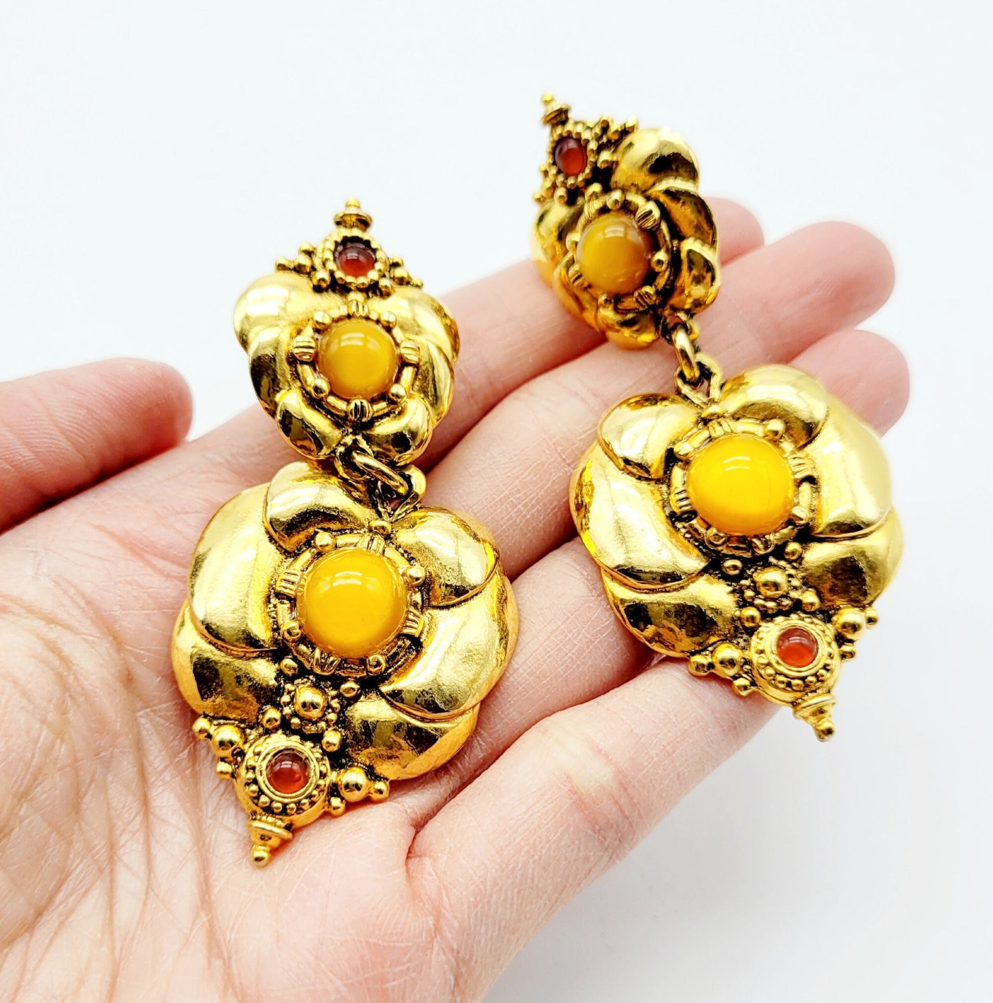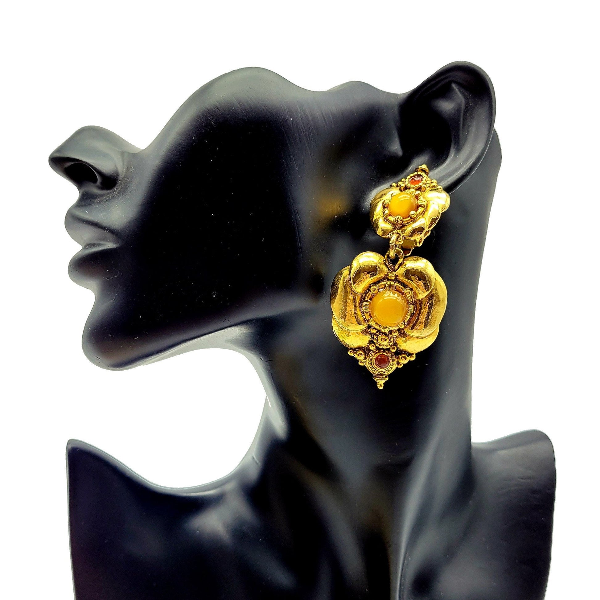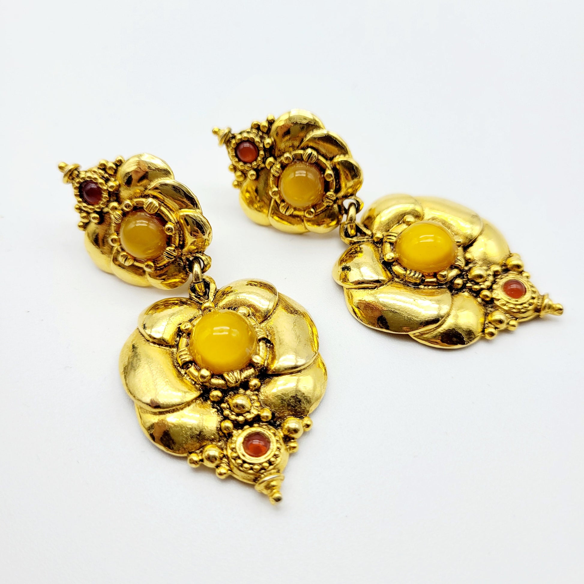 Check out these exquisite vintage dangle earrings! They are crafted in a nice goldtone finish. These French designer earrings feature intricate design work for a truly unique look. They are the perfect finishing touch to any outfit. If you love collecting collectible jewelry, these unique earrings will be a nice addition. They will surely turn heads and make you proud.