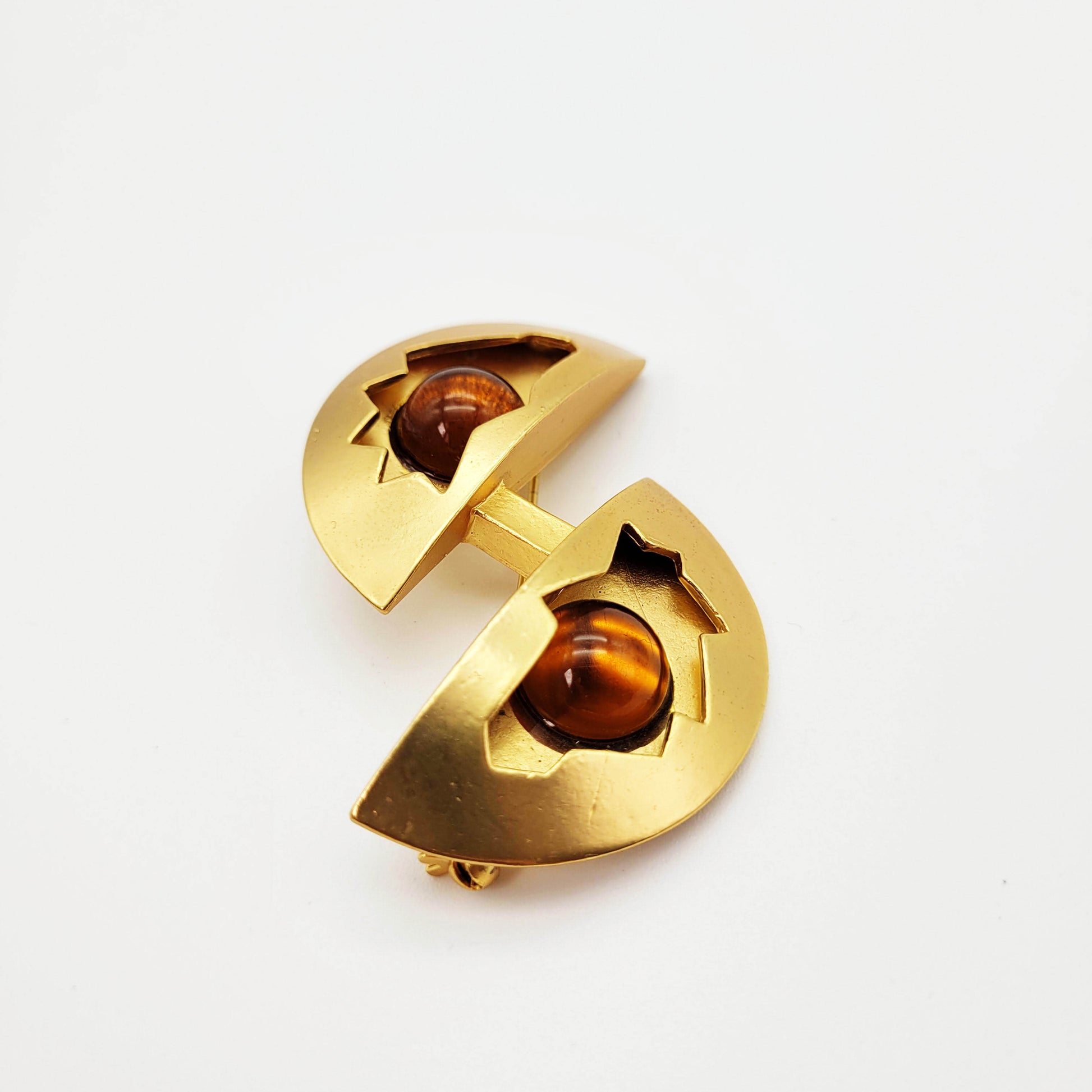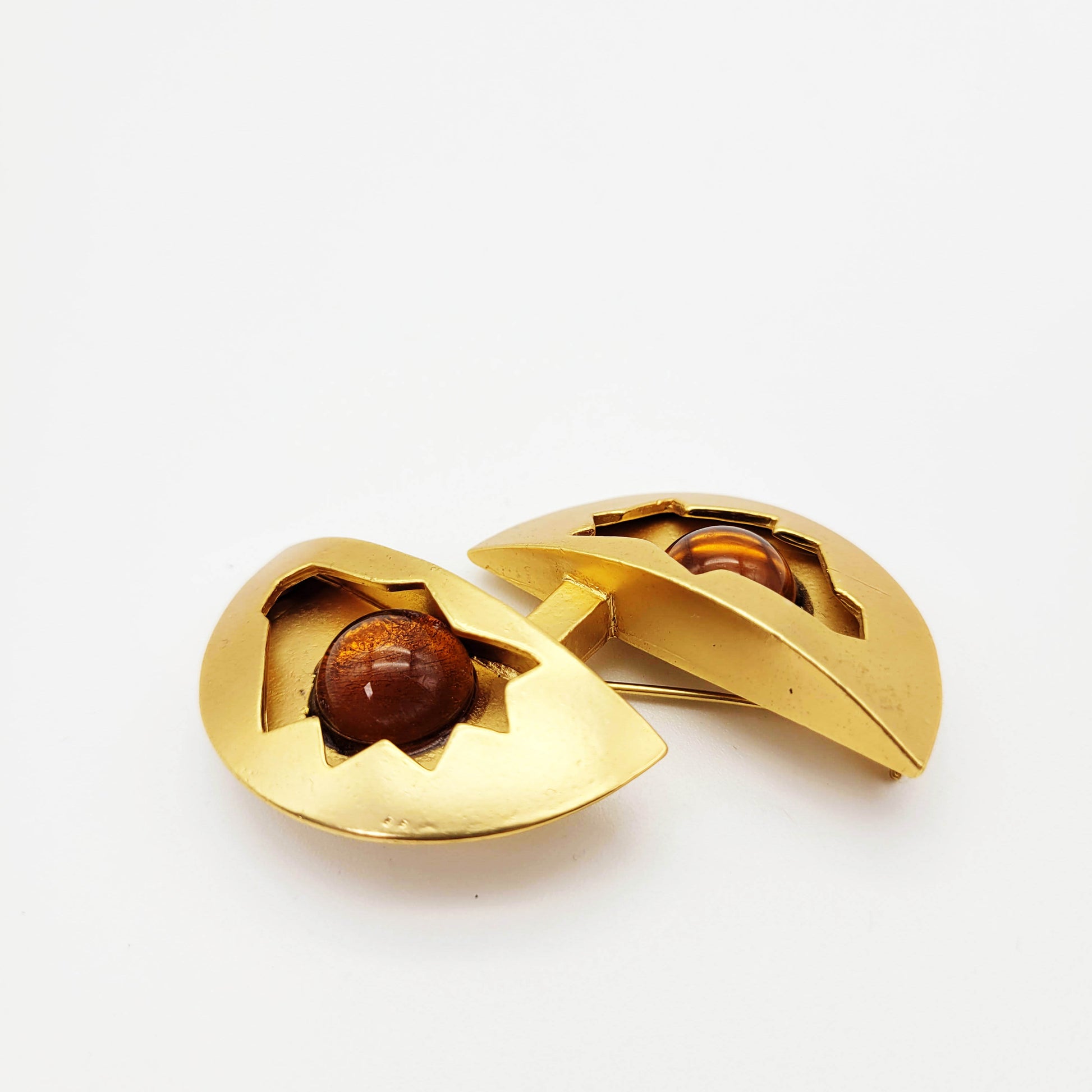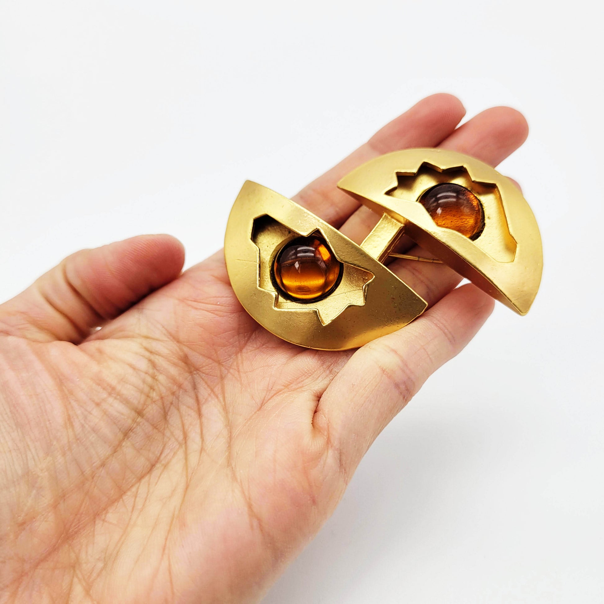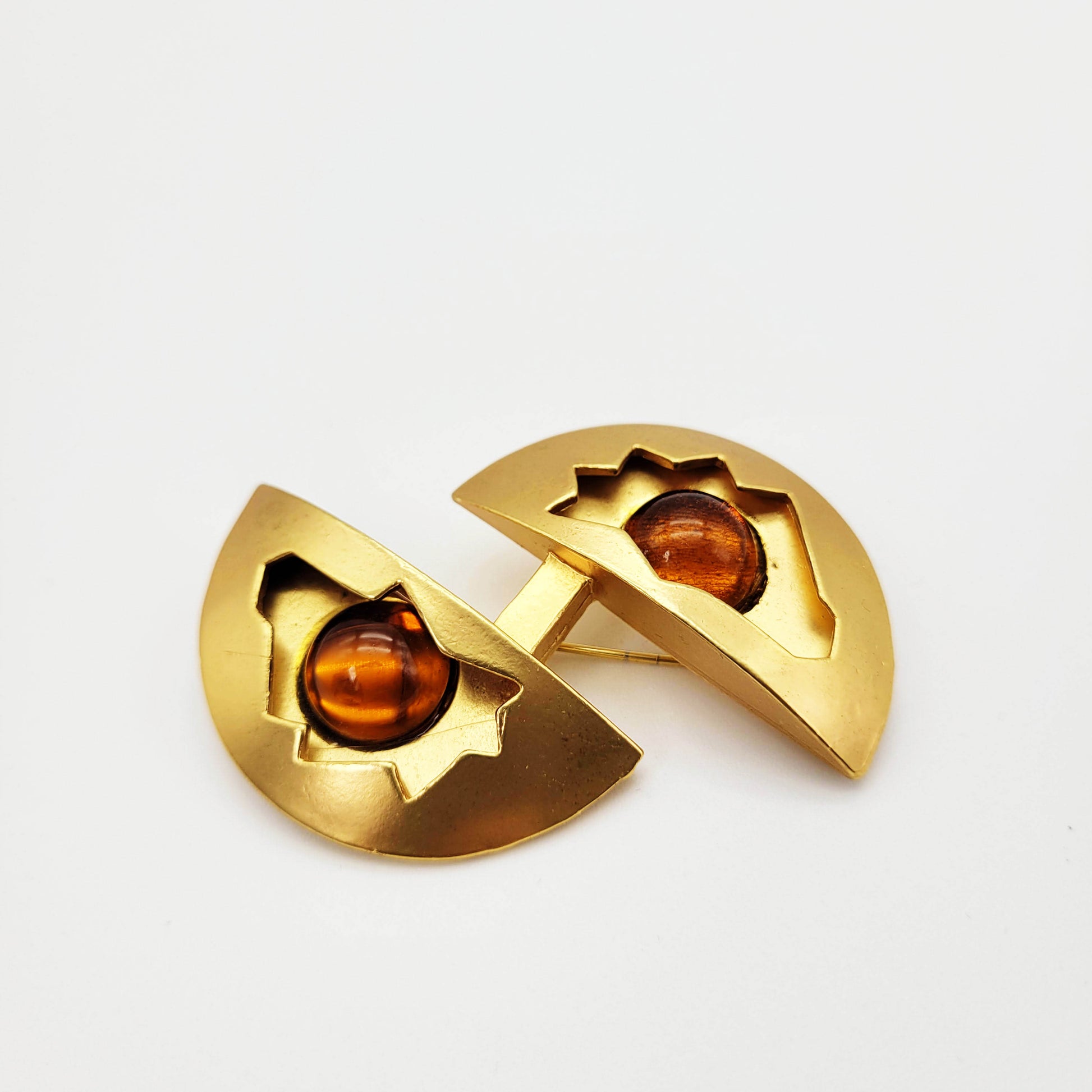 Make a statement and adorn your wardrobe with this vintage designer brooch from Dolce Vita. The interesting design features goldtone metal and amber glass cabochons, adding a luxurious touch to any outfit. Stand out from the crowd for special occasions with the stylish and timeless Dolce Vita brooch!