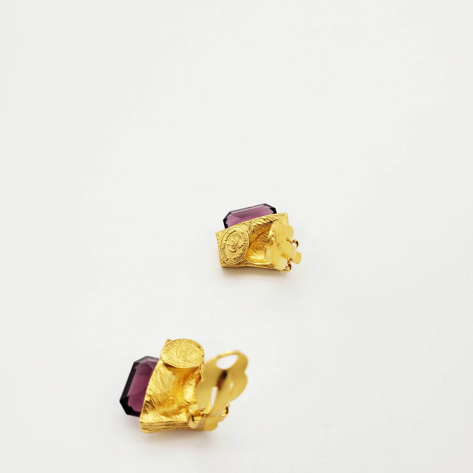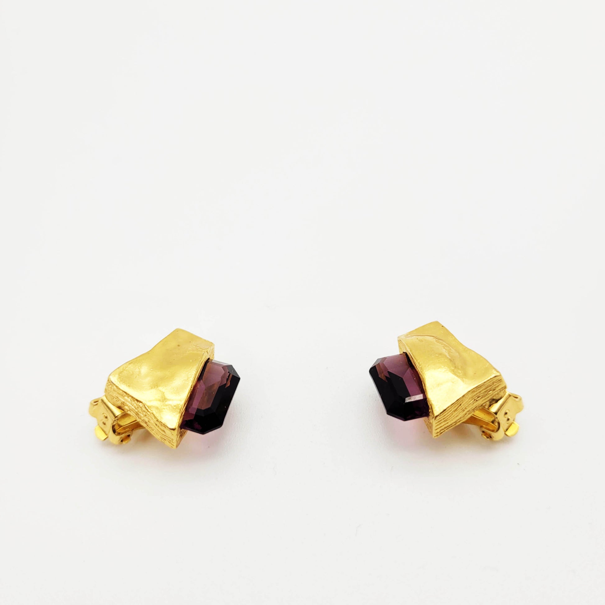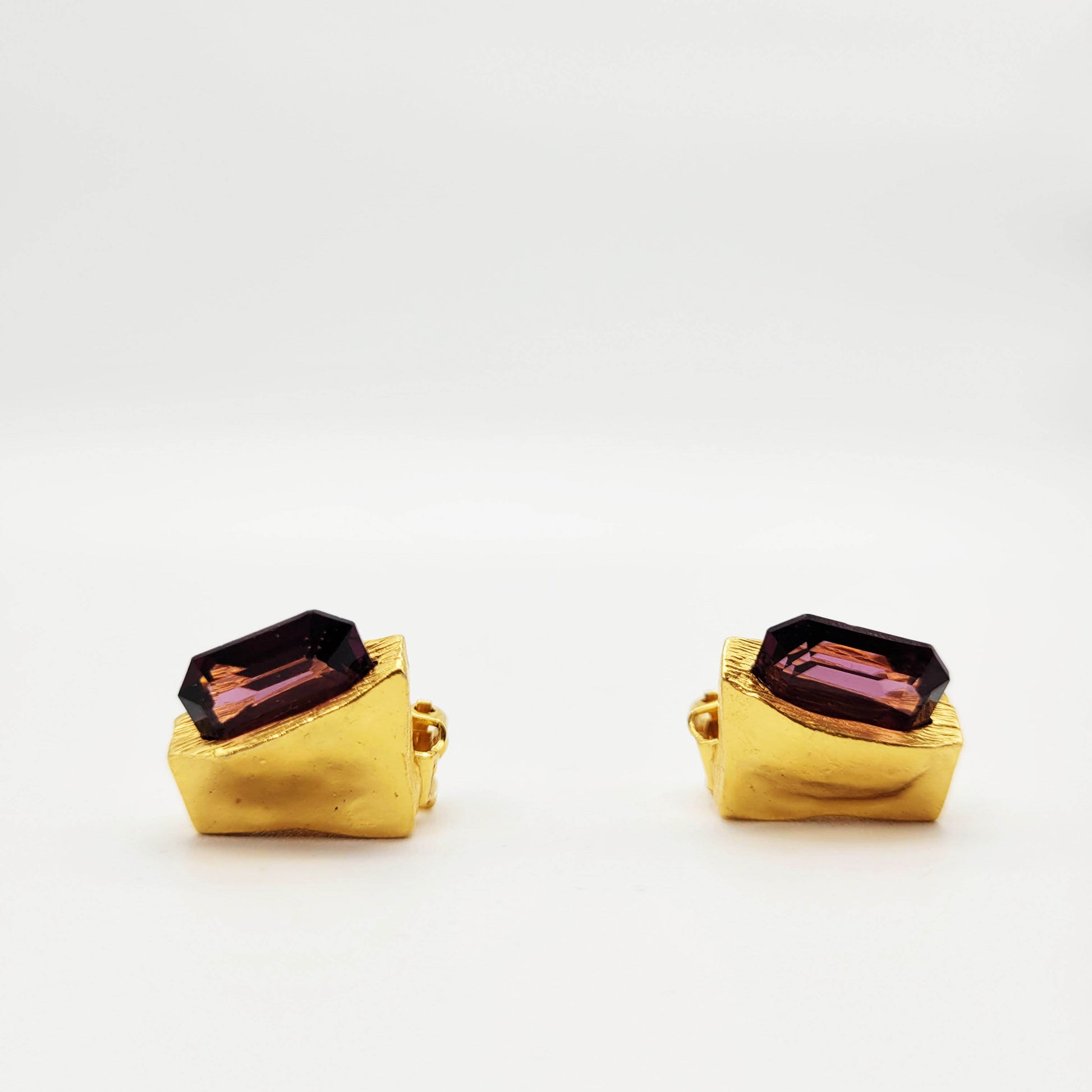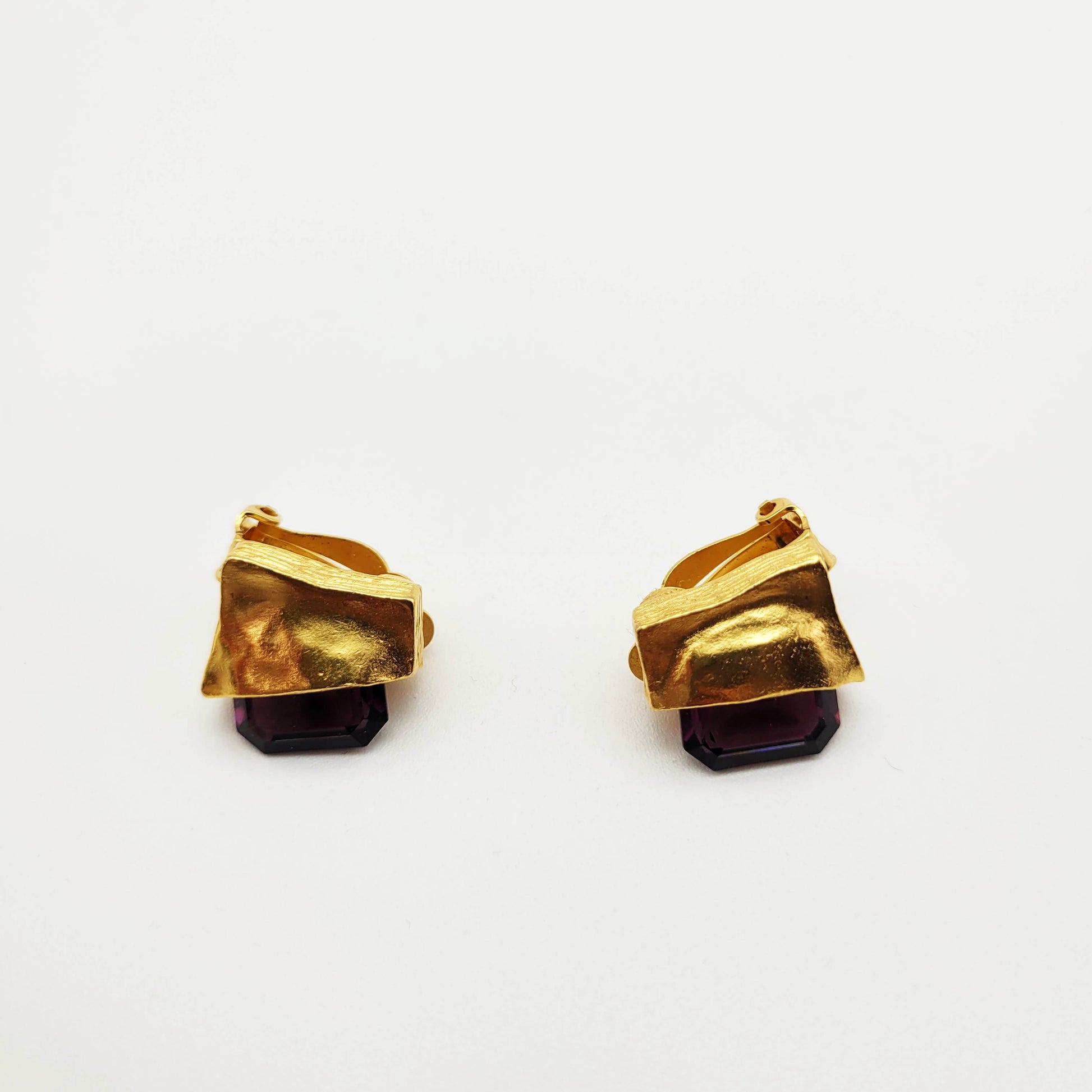 Timeless vintage clip on earrings from Christian Lacroix. These unique earrings feature a matte goldtone color with violet crystals. The design is minimalist and chic. These vintage Christian Lacroix earrings are perfect for any occasion. Add them now to your vintage jewelry collection before someone else gets them!