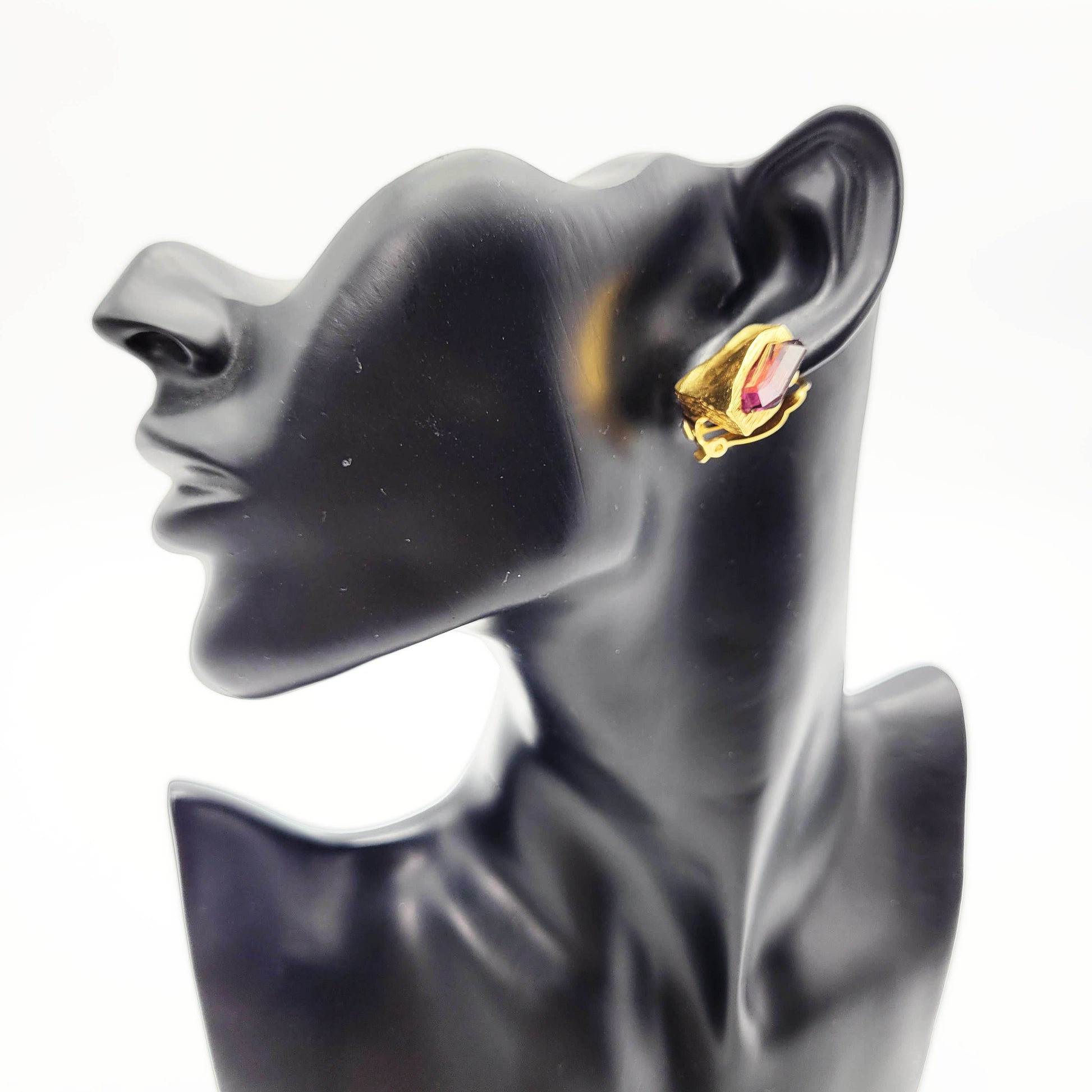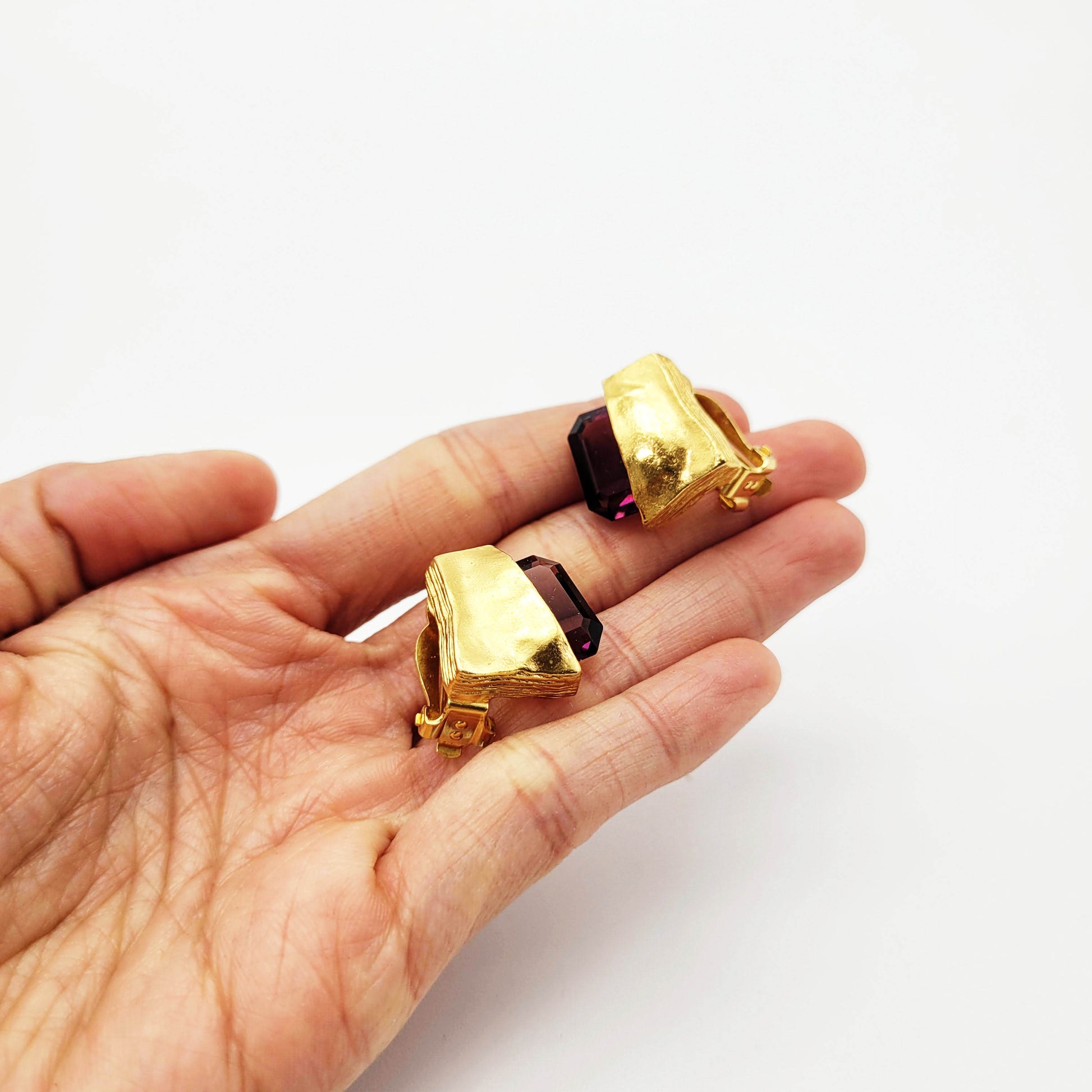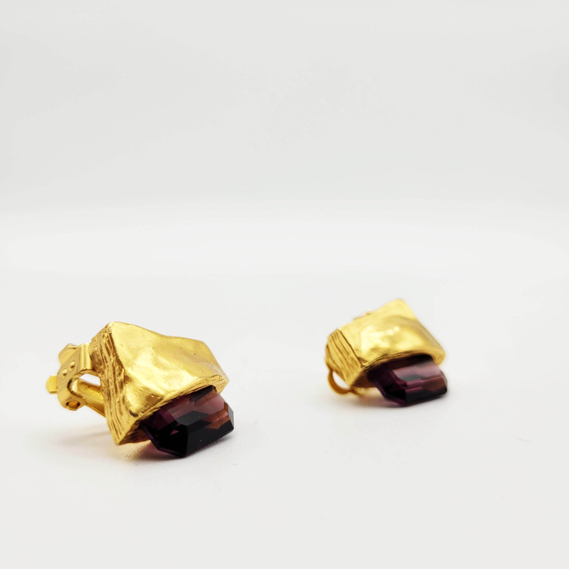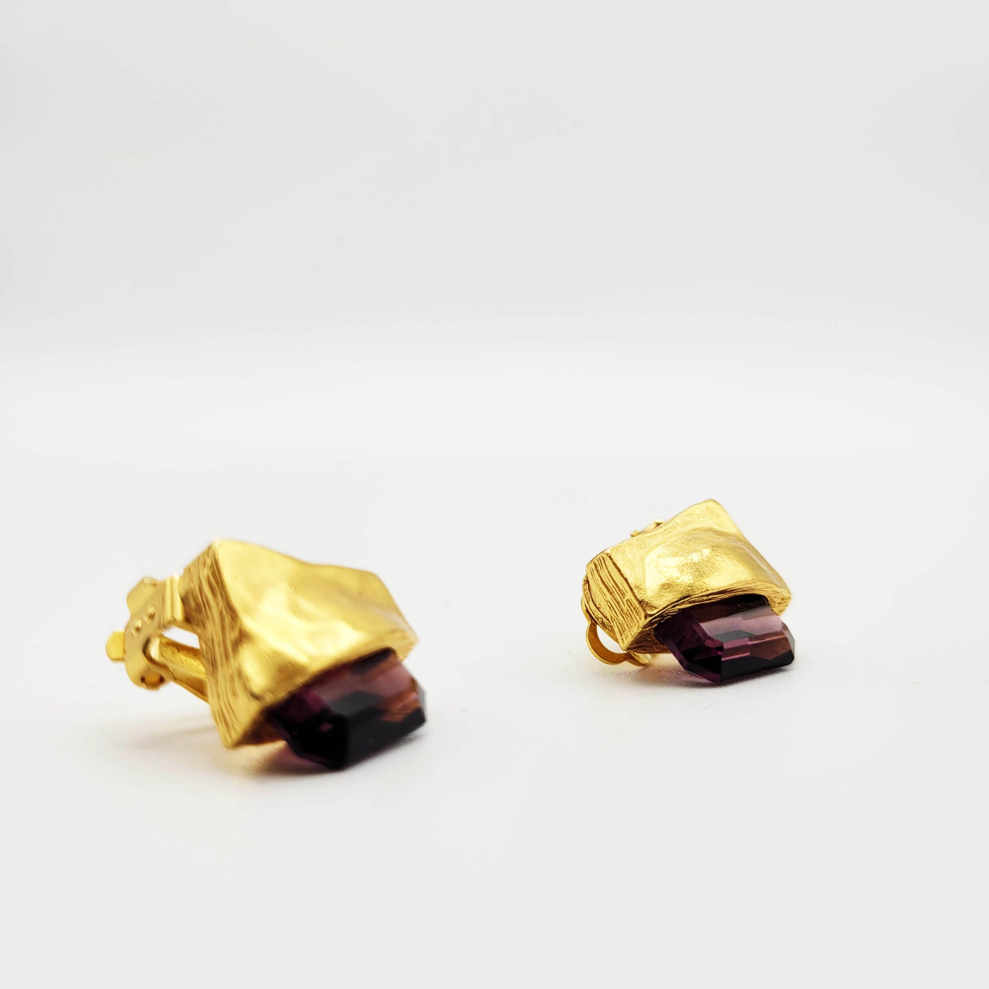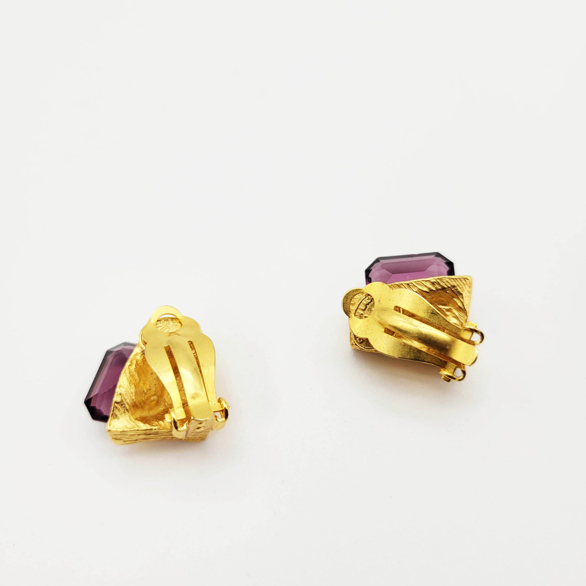 Timeless vintage clip on earrings from Christian Lacroix. These unique earrings feature a matte goldtone color with violet crystals. The design is minimalist and chic. These vintage Christian Lacroix earrings are perfect for any occasion. Add them now to your vintage jewelry collection before someone else gets them!