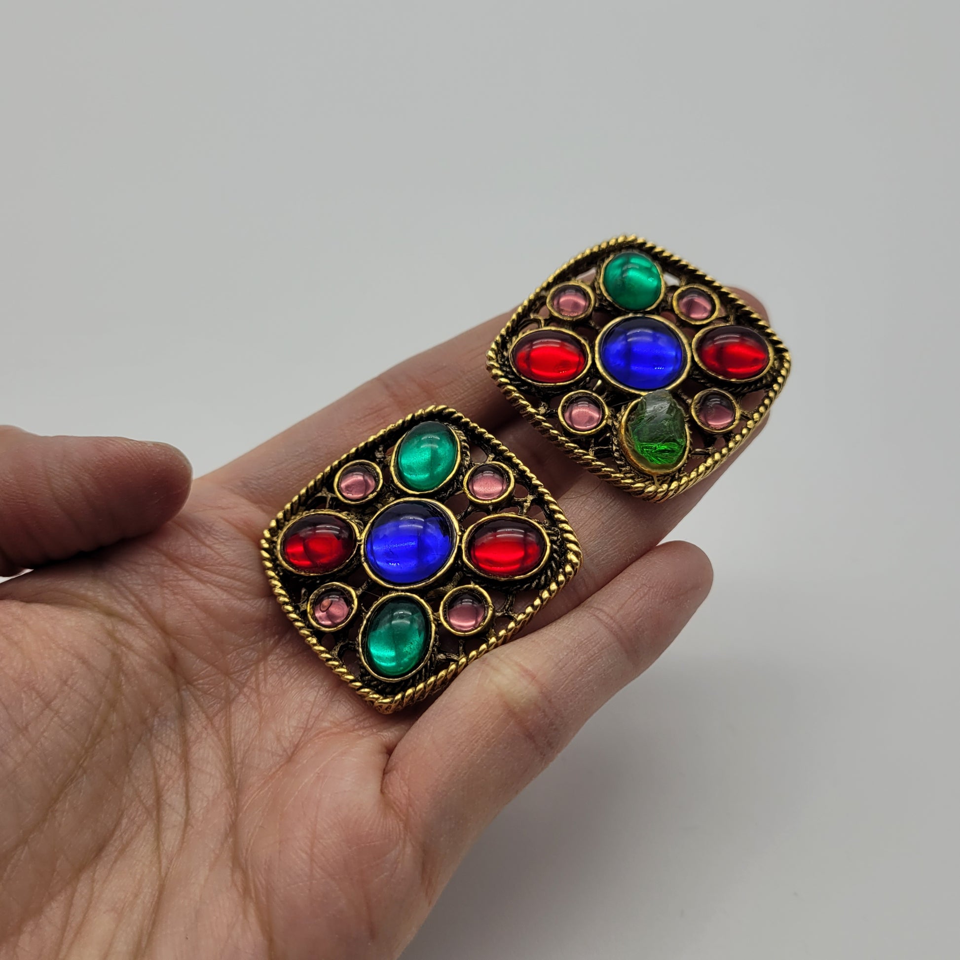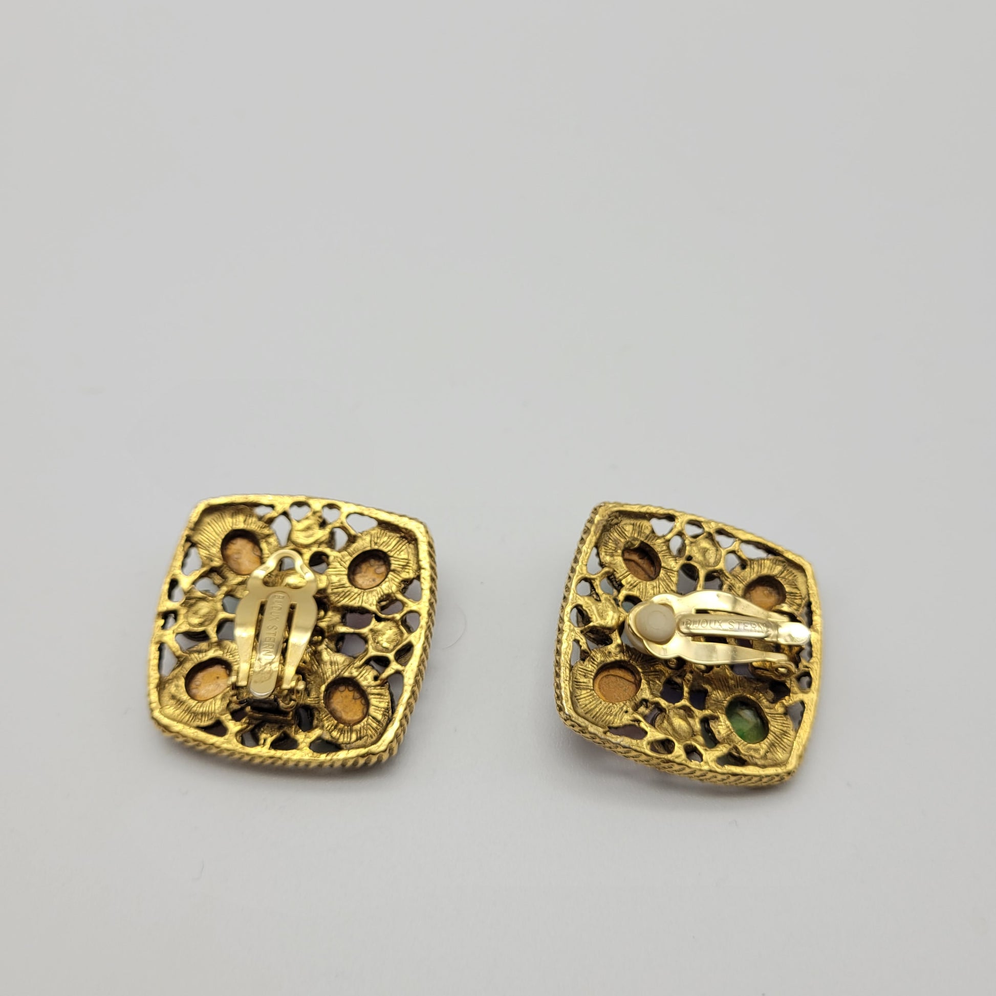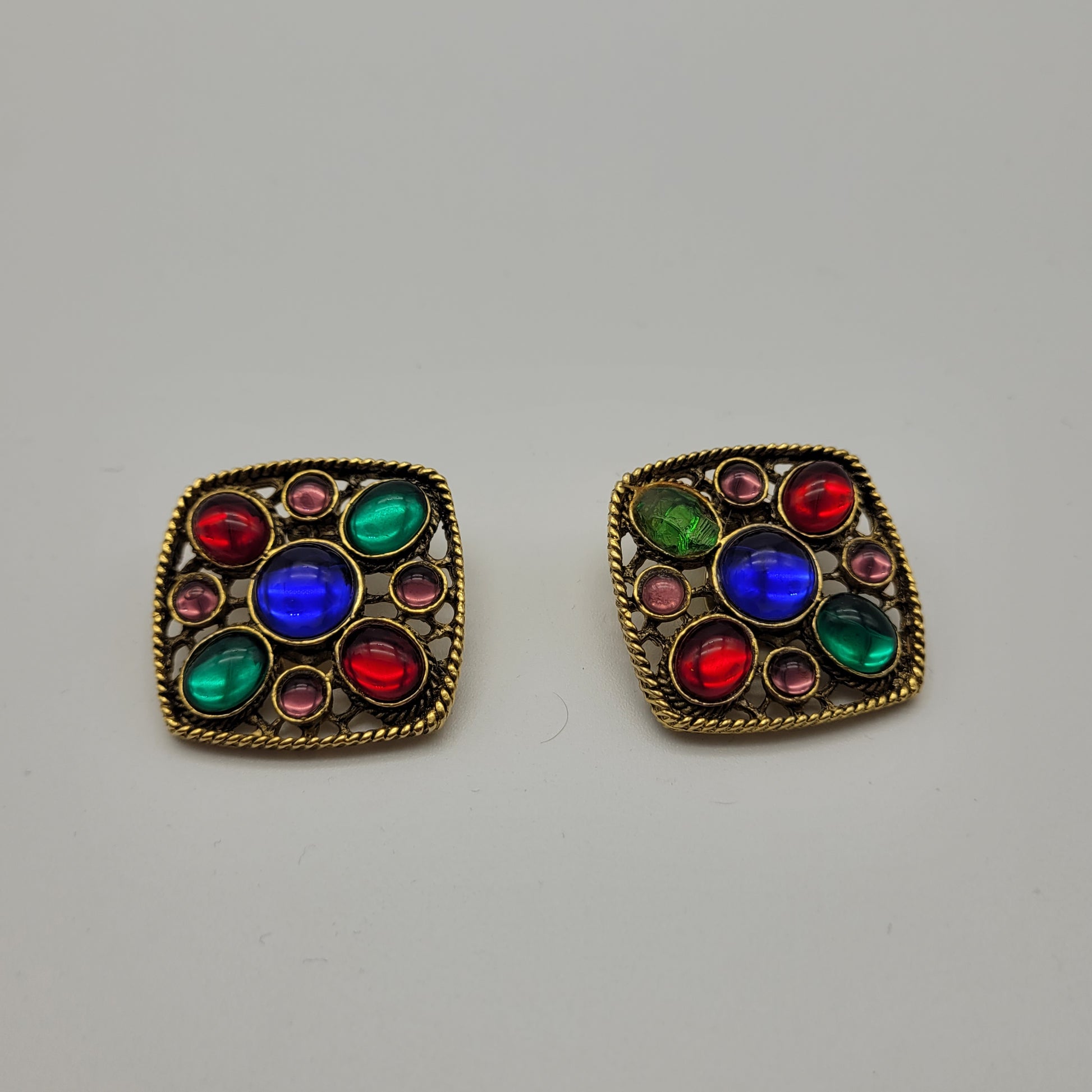 Introducing our stunning pair of vintage clip-on earrings with multi-colored glass beads, fashioned in a chic and elegant square shape. These earrings will be the perfect addition to any jewelry collection, whether you're dressing up for a formal night out or simply adding a touch of glamour to your everyday look.