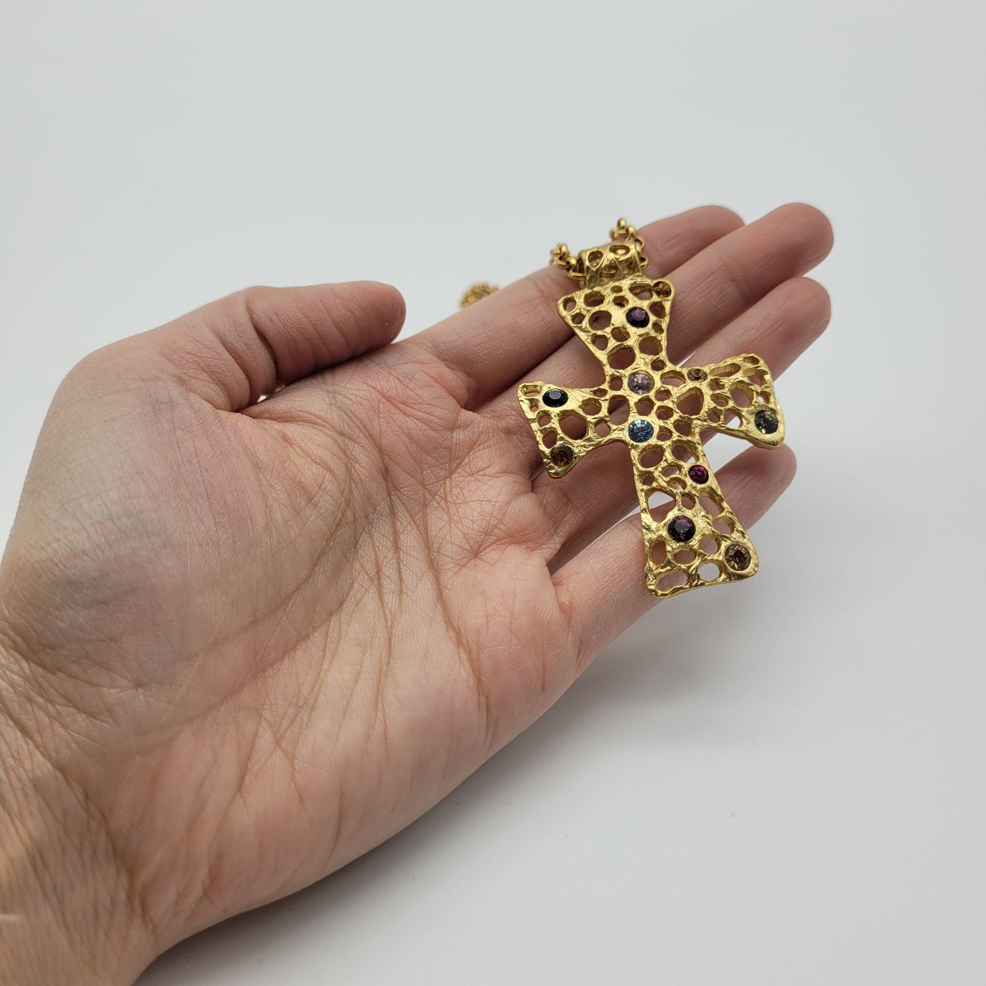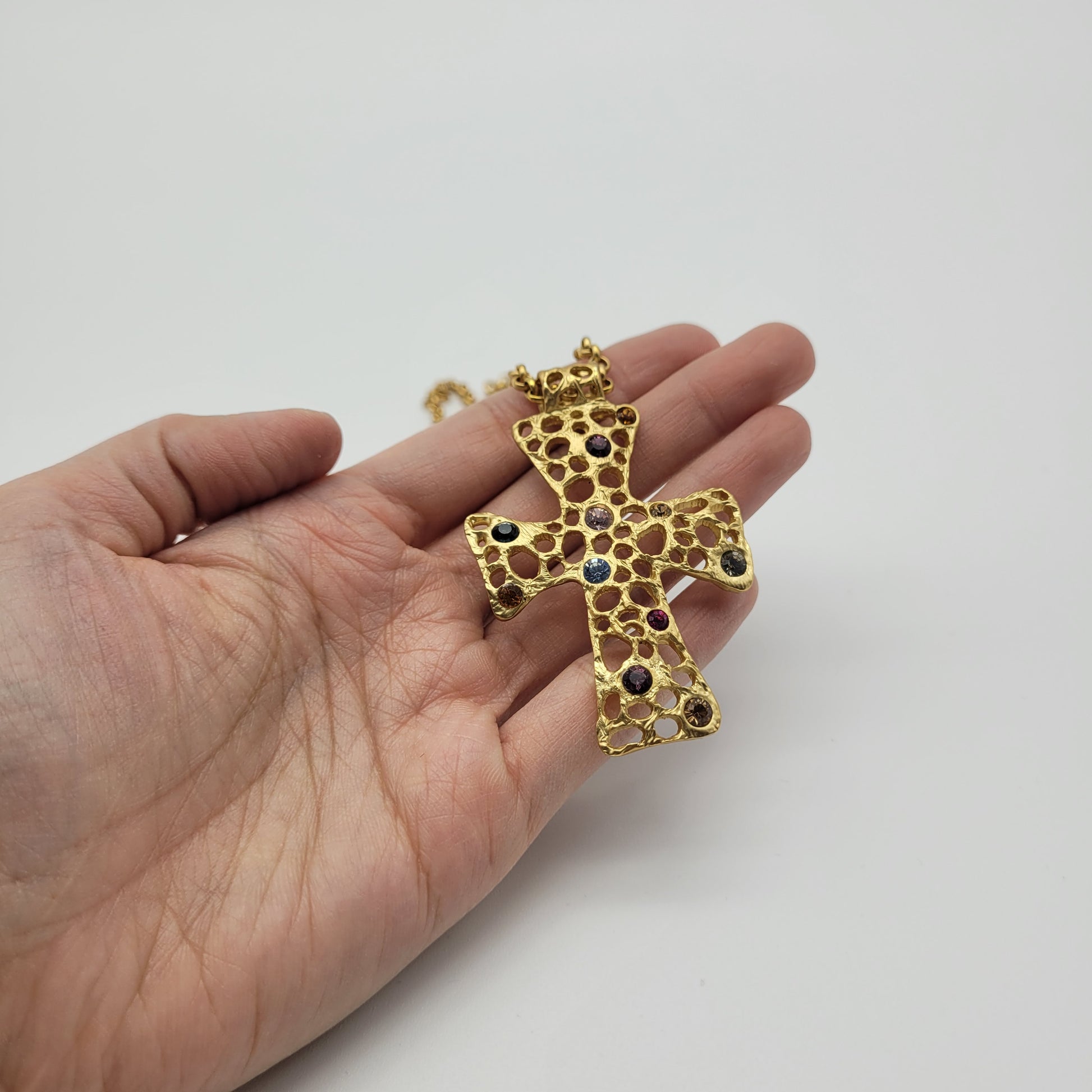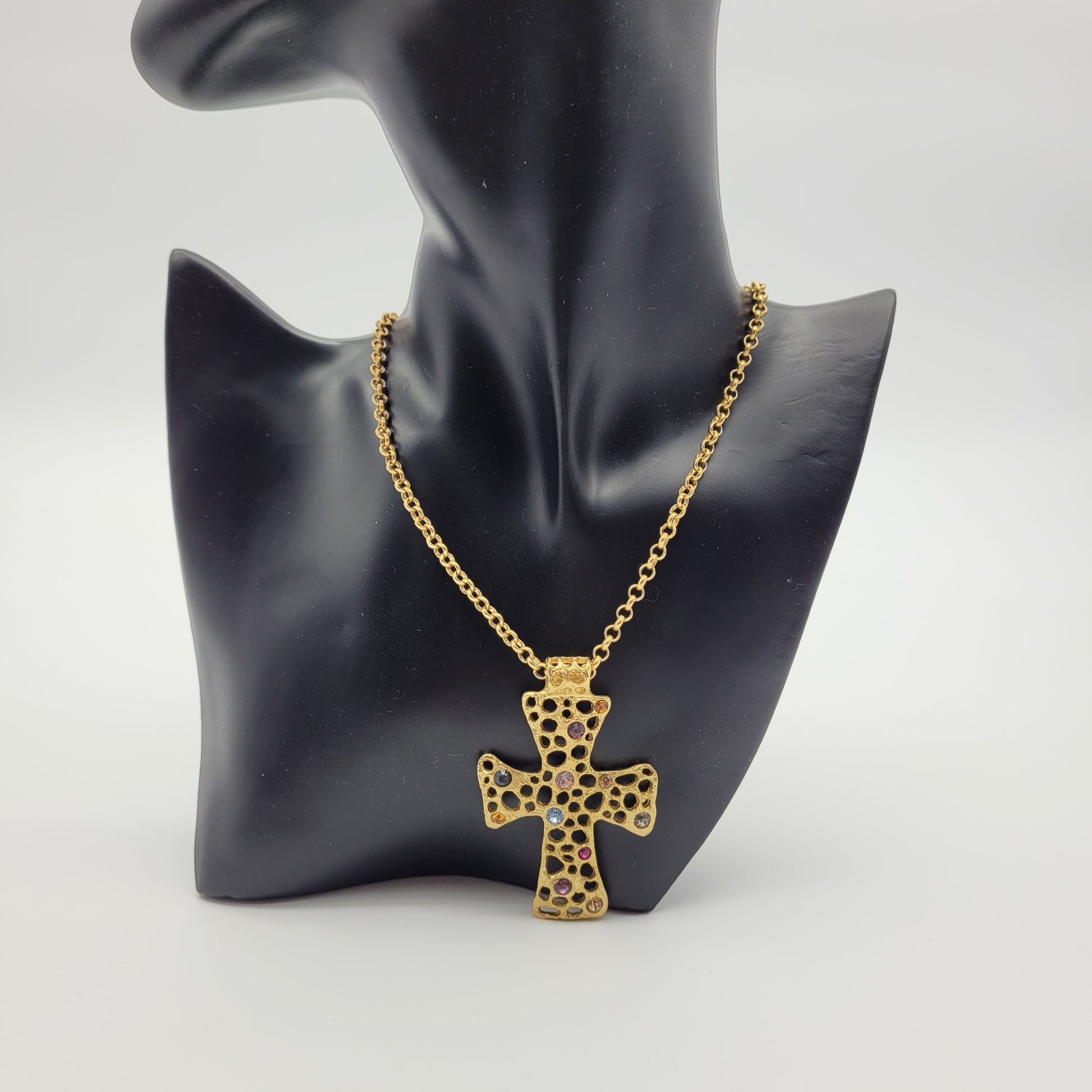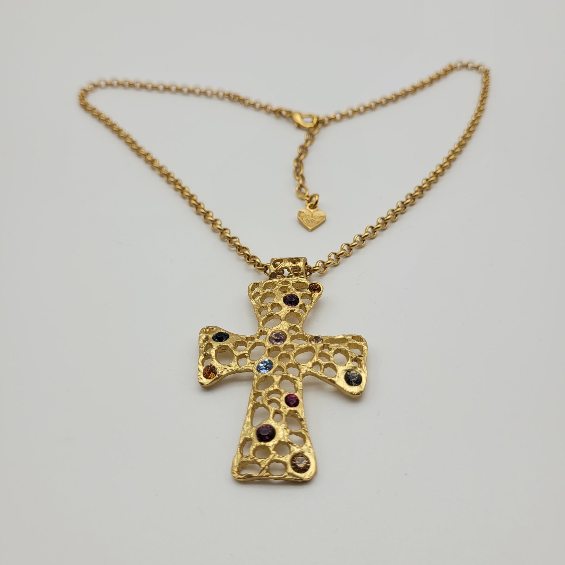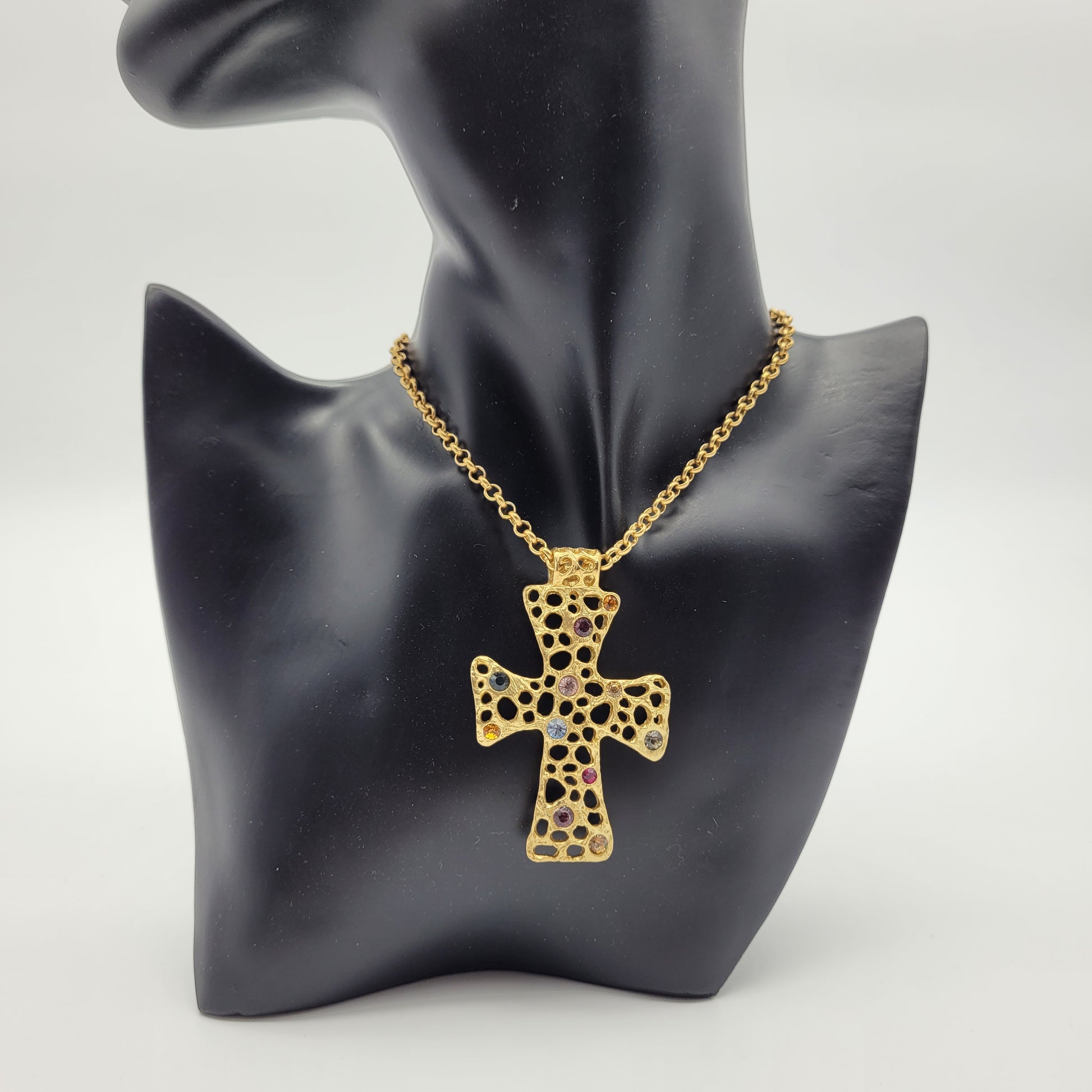 The cross pendant is adorned with colorful rhinestones, adding a touch of sparkle and vibrancy to this unique necklace. The combination of the interesting design and the beautiful rhinestones creates a unique and captivating design.