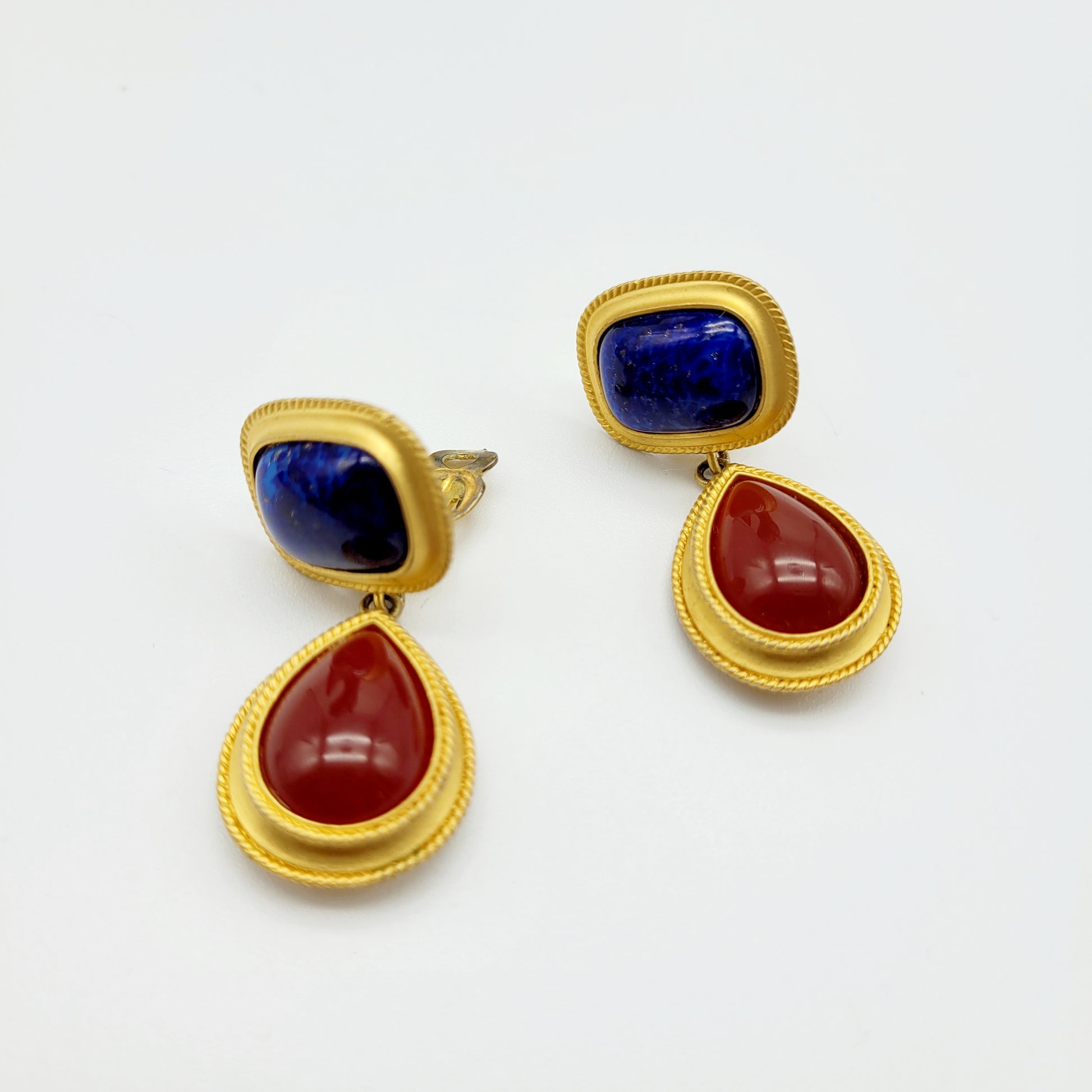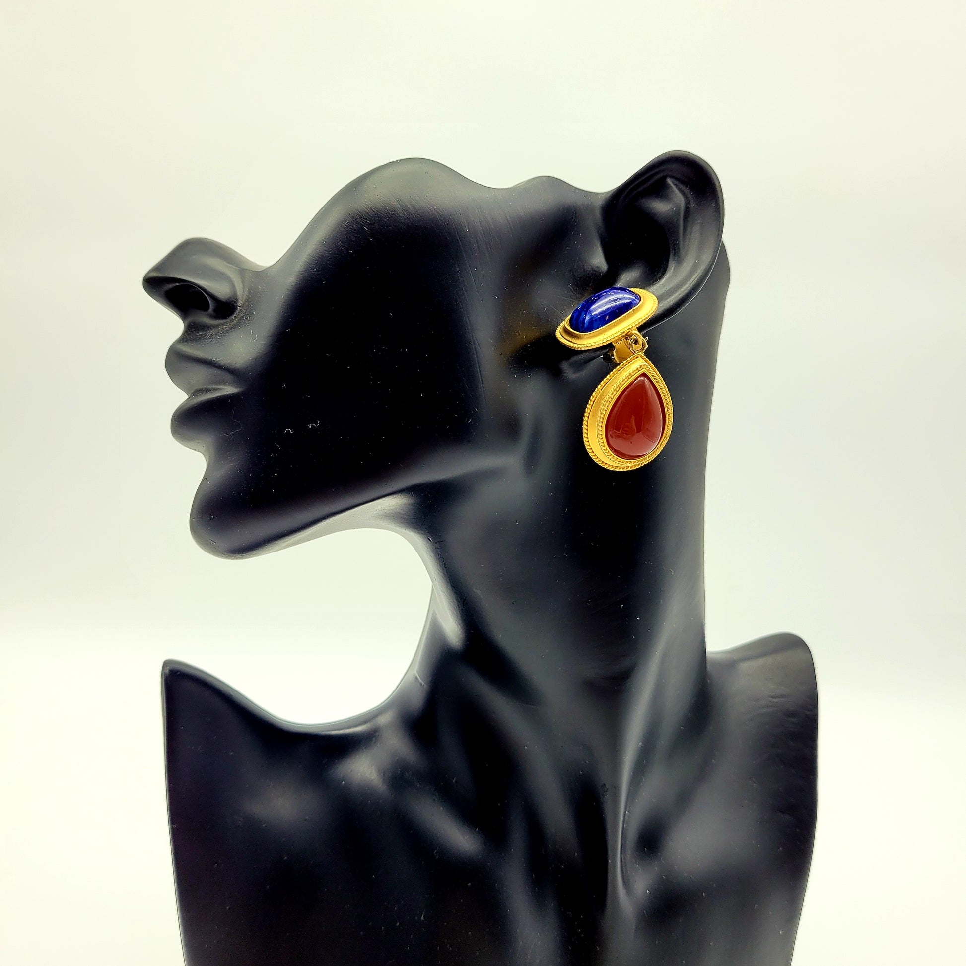 These unique earrings feature red and blue stones in the form of teardrops, which give them an eye-catching appearance.