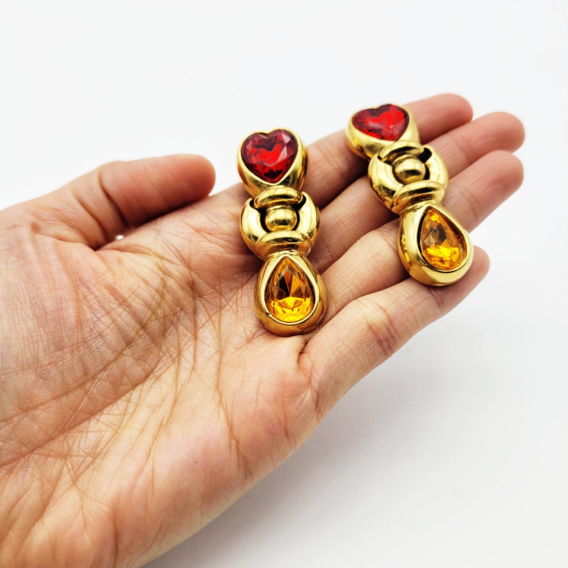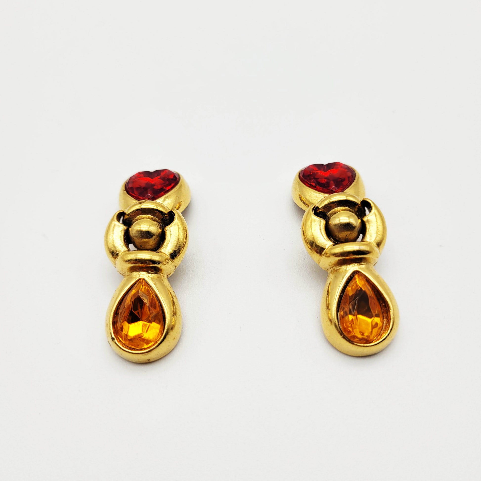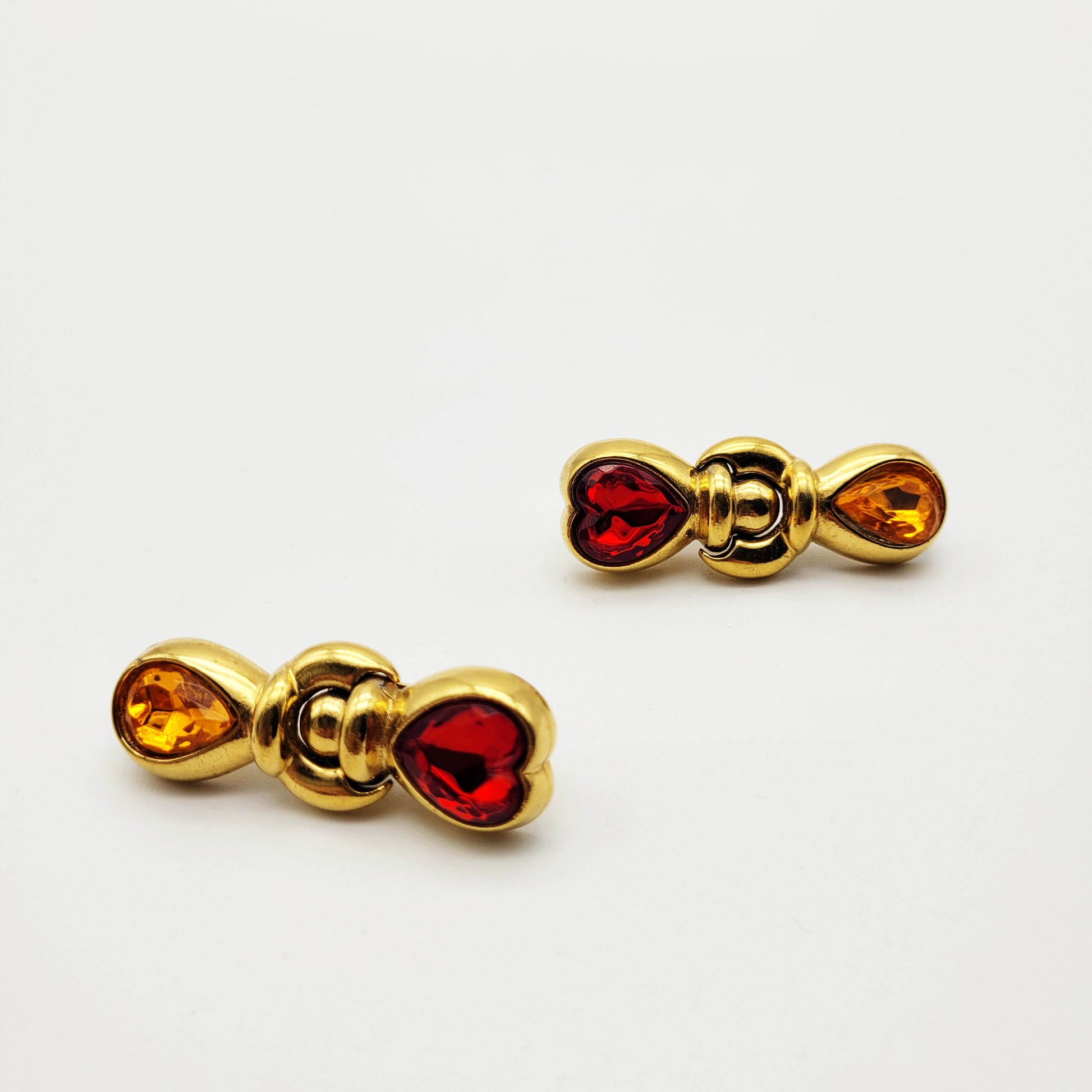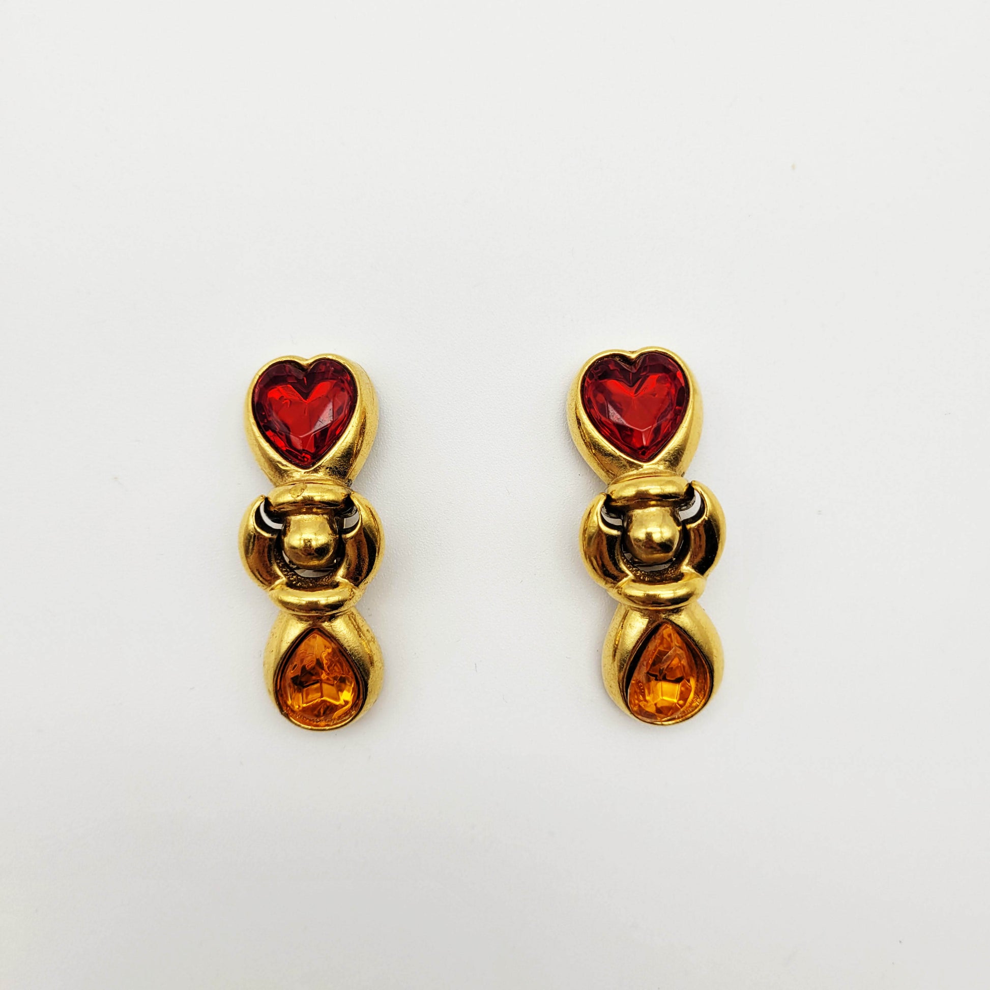 Stunning vintage dangle earrings from Agatha Paris. These unique earrings feature heart shapes in red crystals and teardrop shapes in orange crystals. The original design makes them stand out. These heart earrings are a must-have for any vintage jewelry lover.