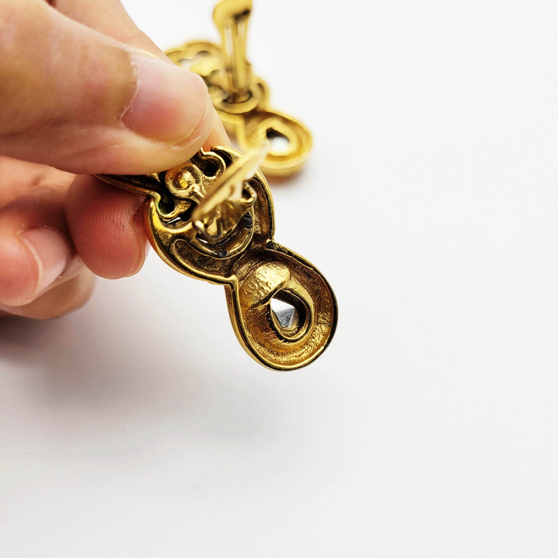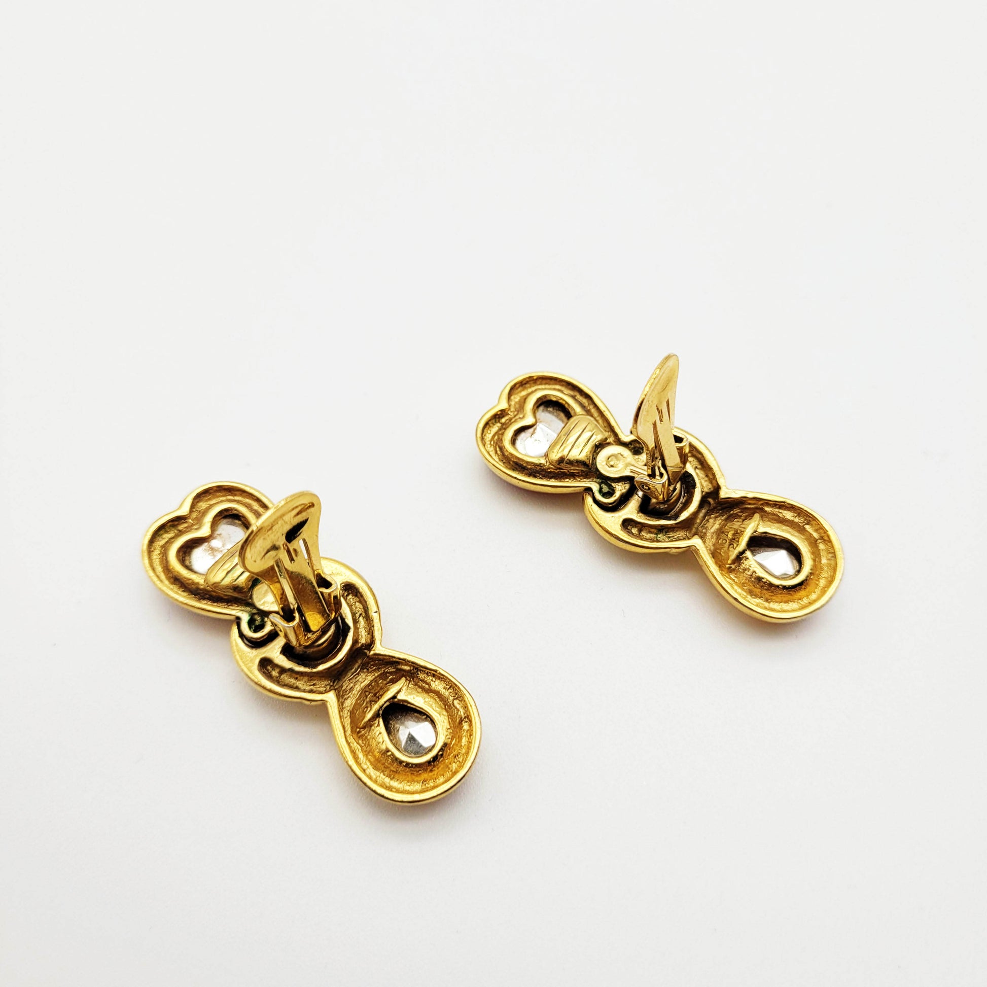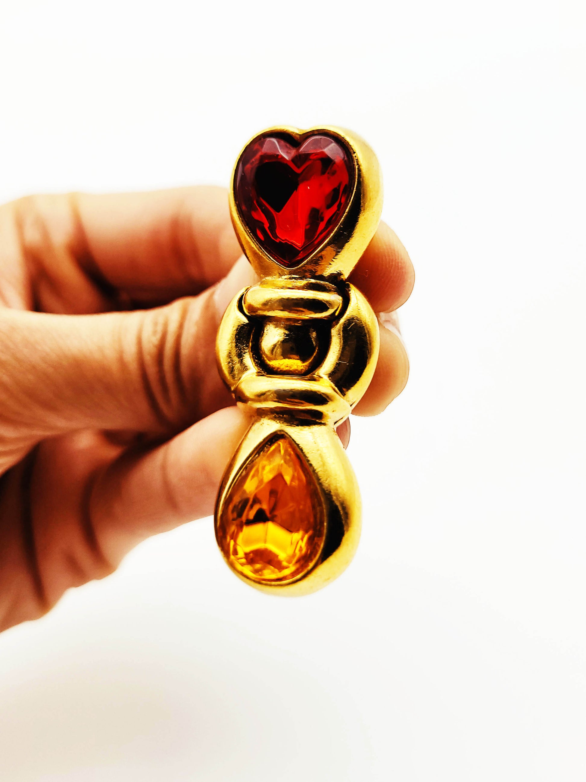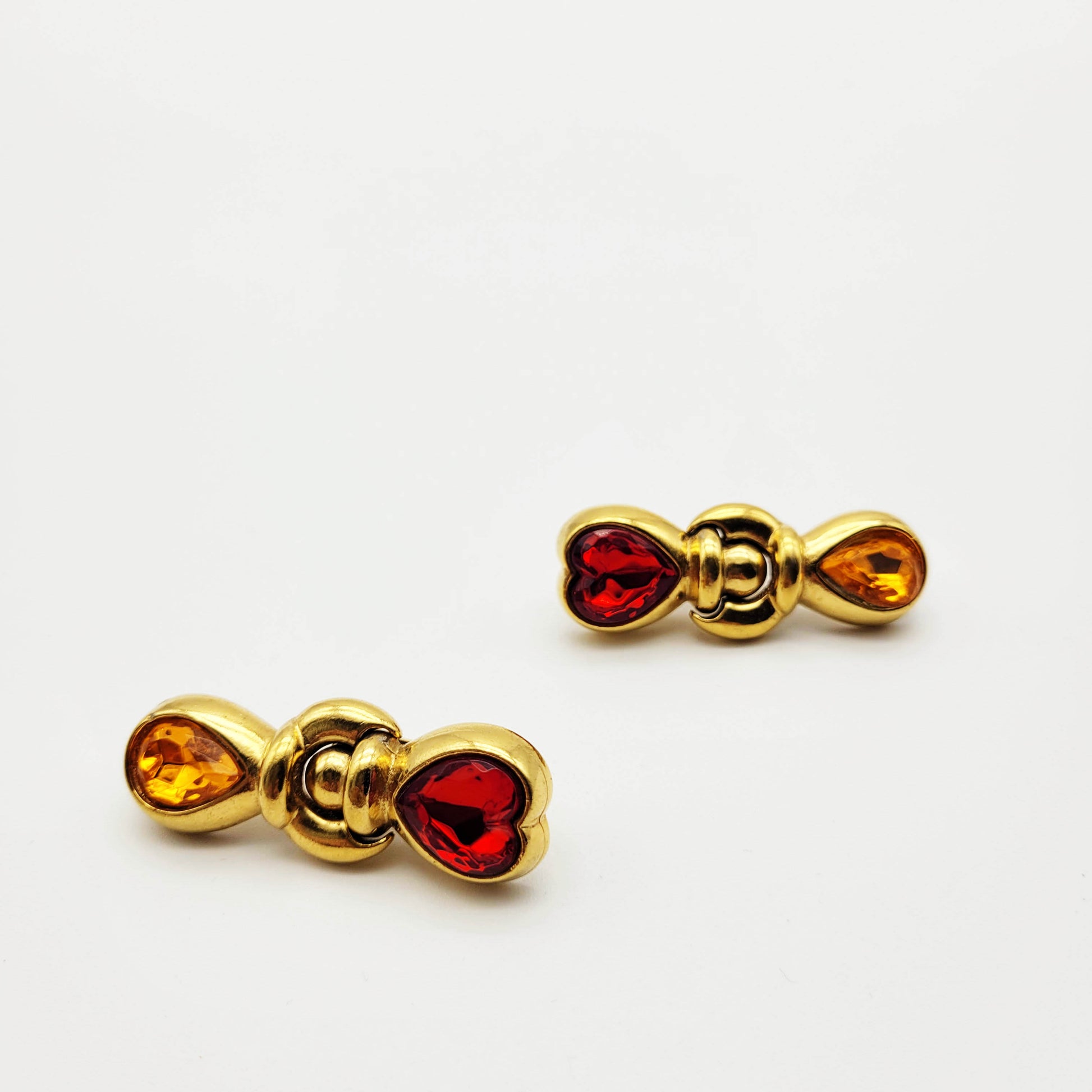 Stunning vintage dangle earrings from Agatha Paris. These unique earrings feature heart shapes in red crystals and teardrop shapes in orange crystals. The original design makes them stand out. These heart earrings are a must-have for any vintage jewelry lover.