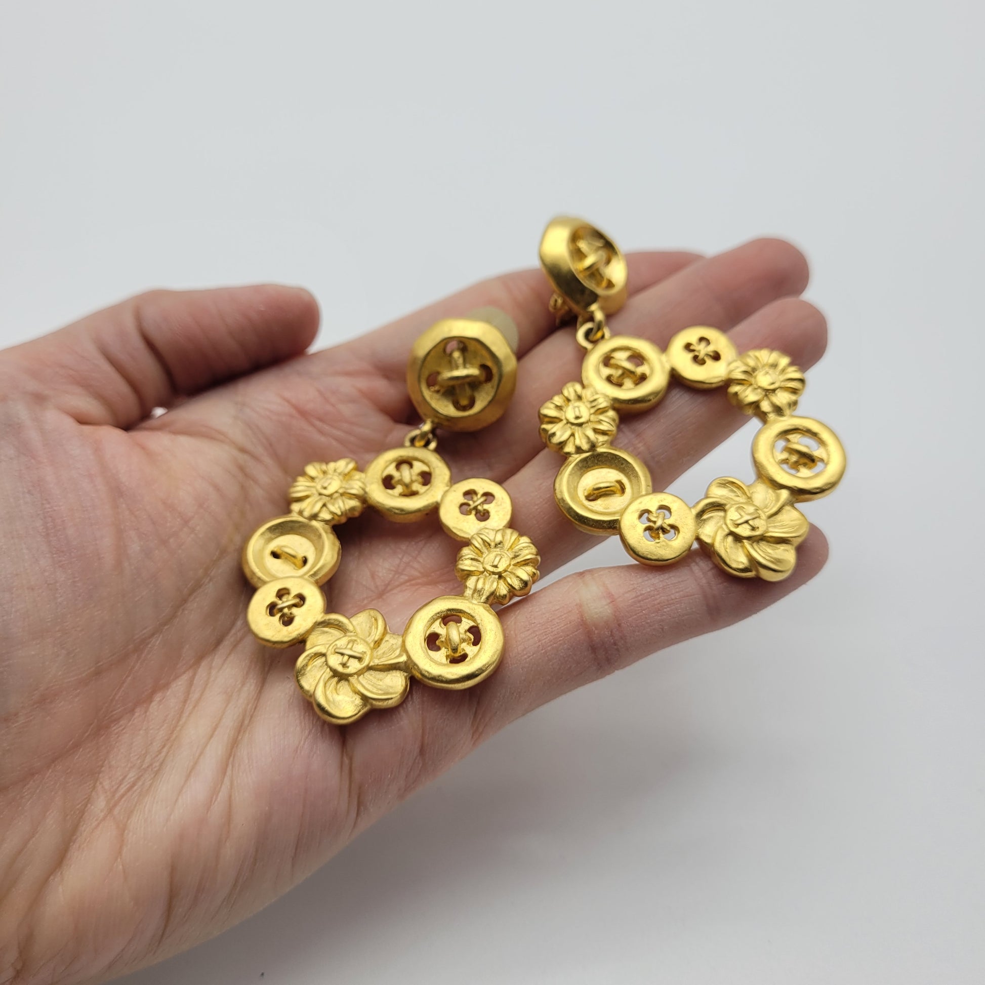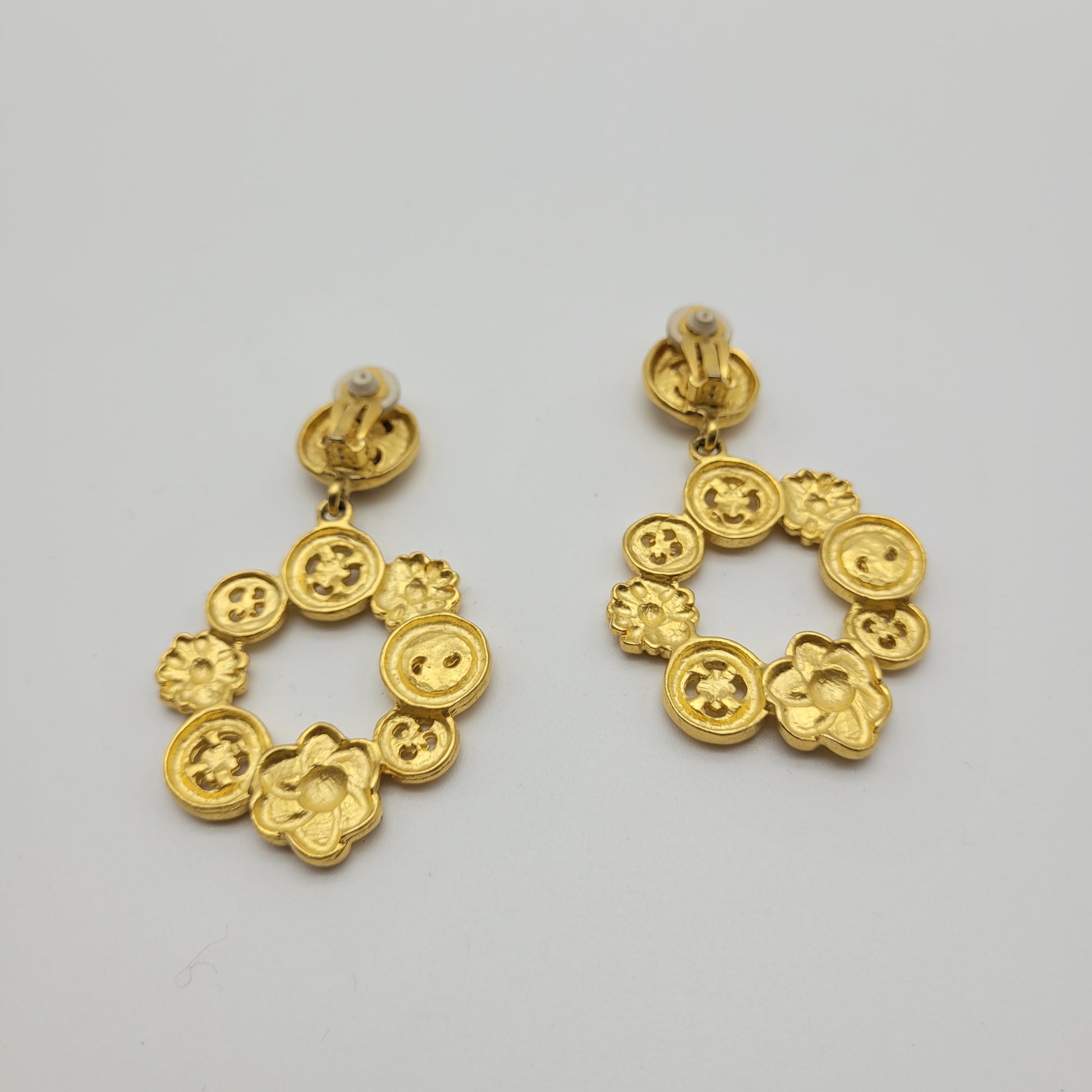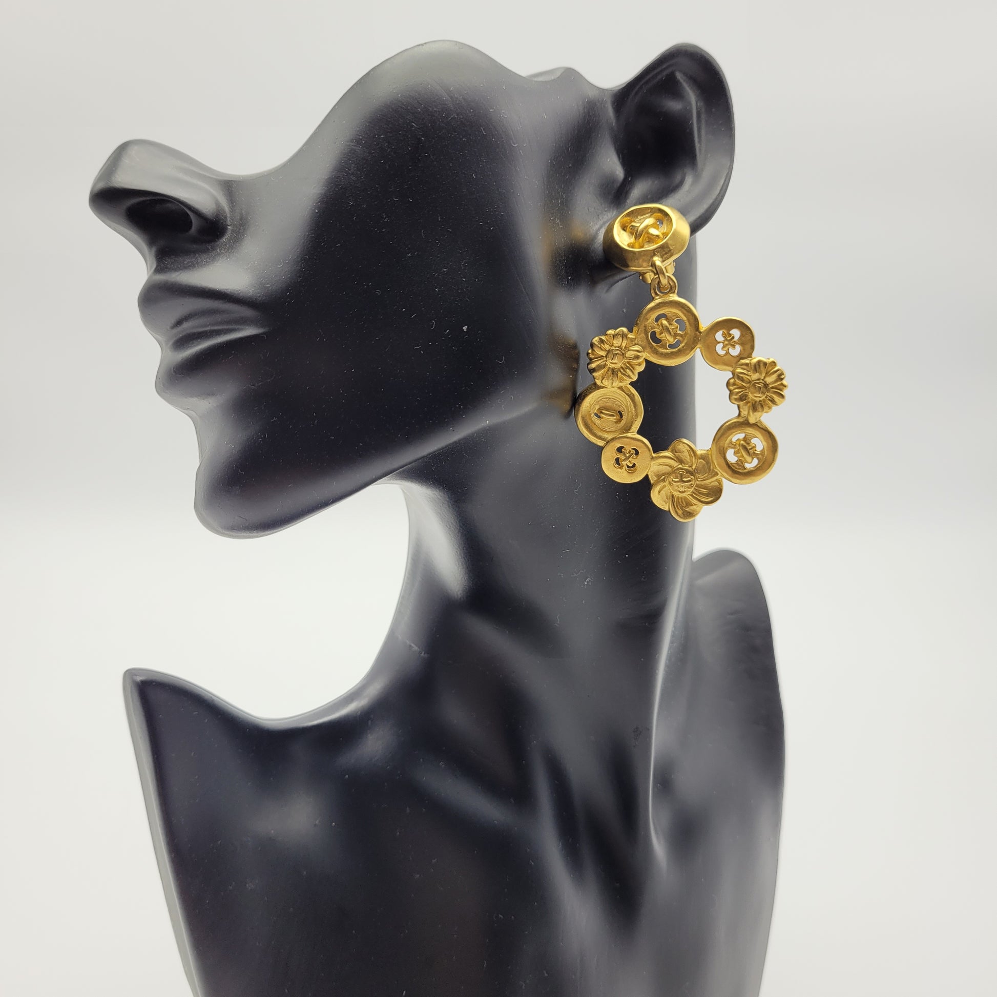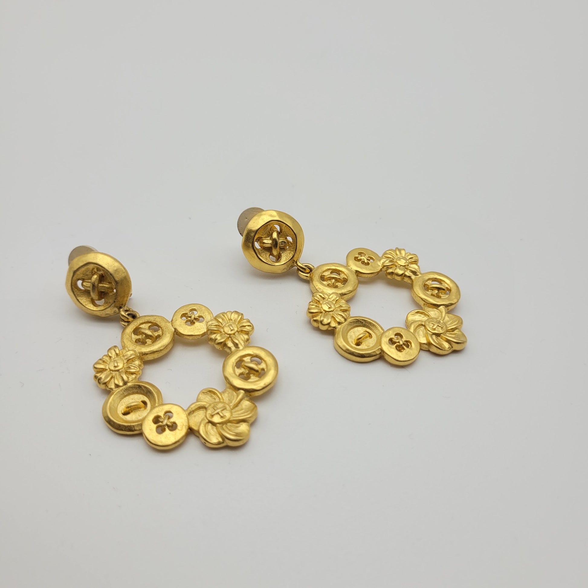 Featuring intricate flower and button motifs in matte goldtone metal, these vintage earrings are a perfect blend of sophistication and simplicity. The delicate floral design adds a touch of femininity, while the button accents bring a modern twist, making them suitable for both formal occasions and casual outings.