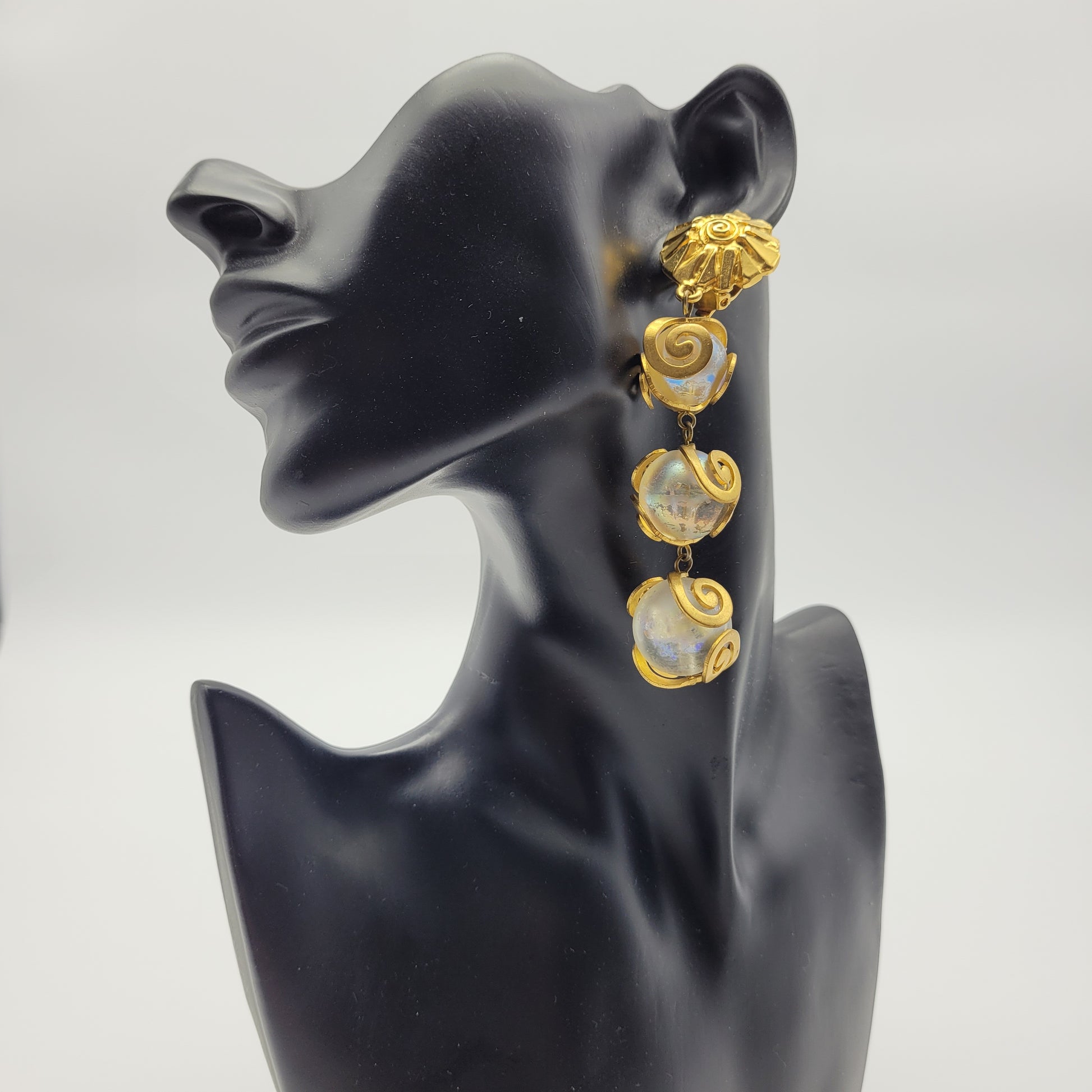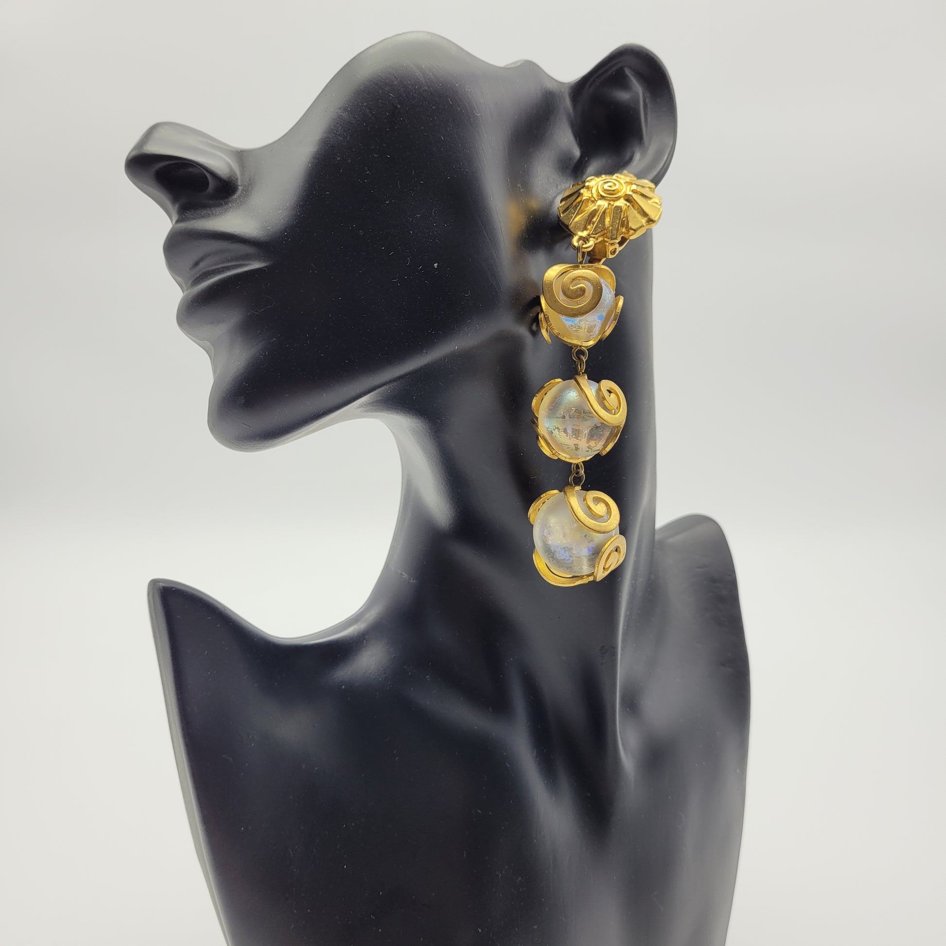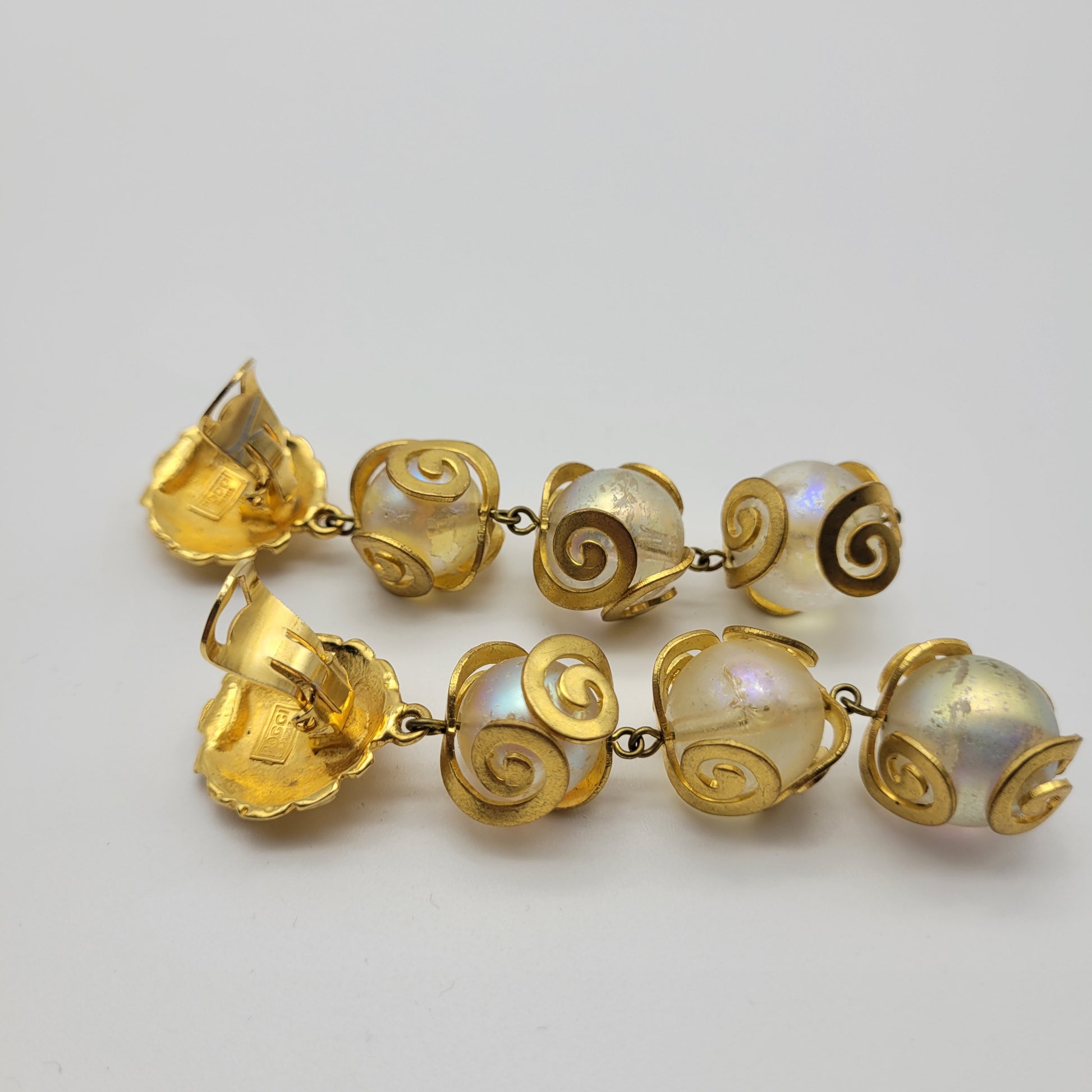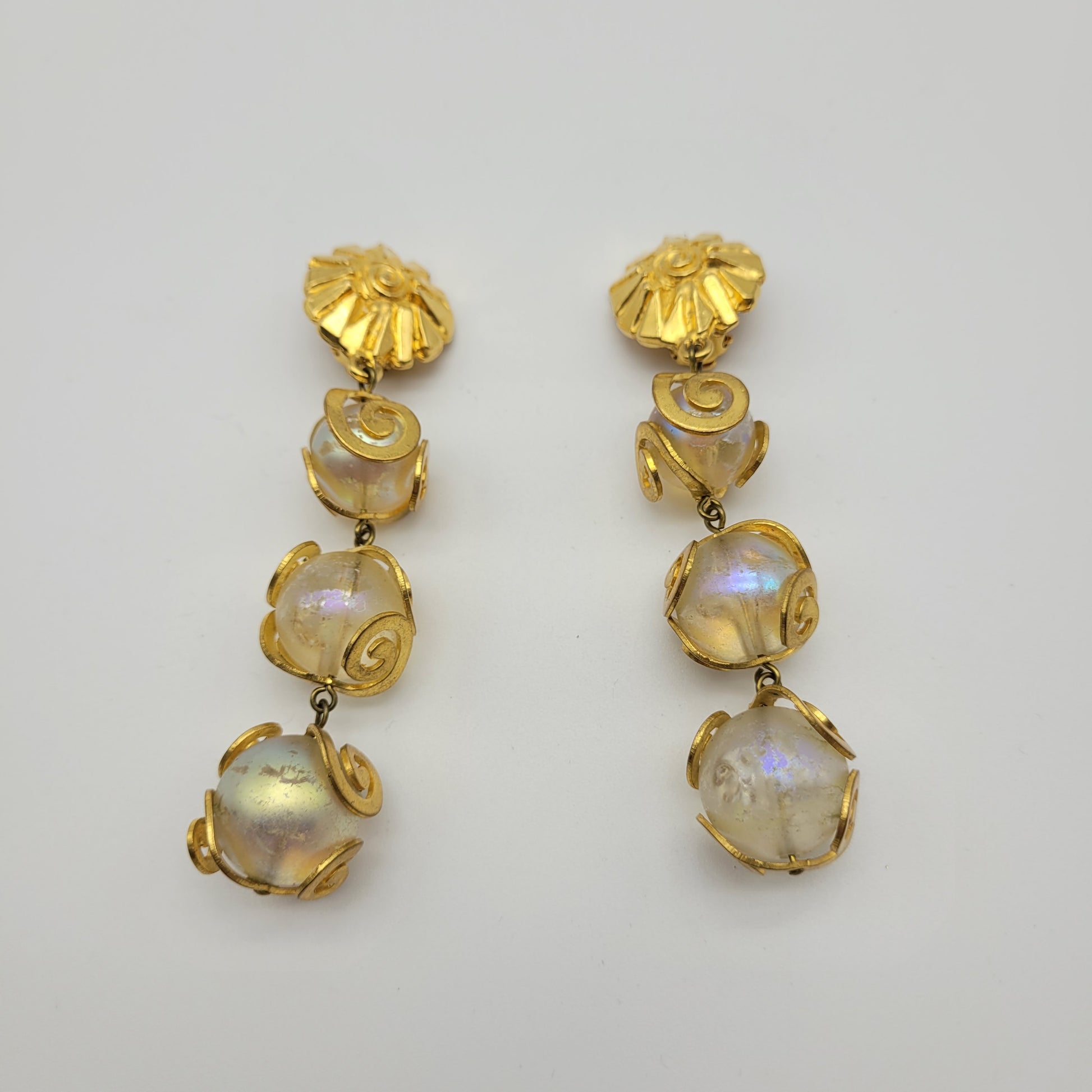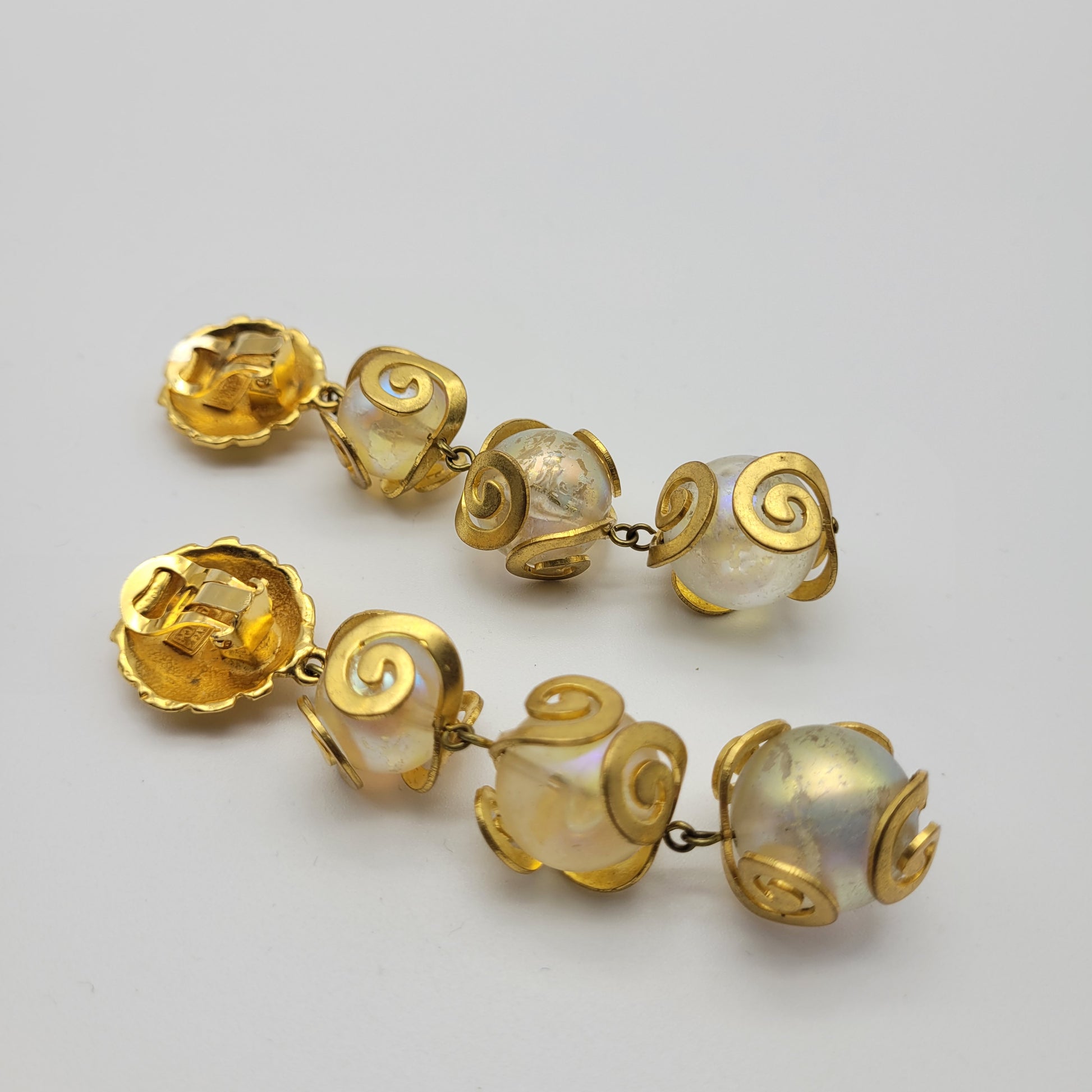 Treat yourself to a timeless beauty with these gorgeous vintage dangle earrings from Poggi. These vintage costume earrings feature goldtone and nacre colors. The haute couture design of these unique earrings will make you stand out in the crowd. They are the perfect addition to any special occasion. Delicately crafted with precision and attention to detail, these statement earrings are a great catch for any vintage lovers.