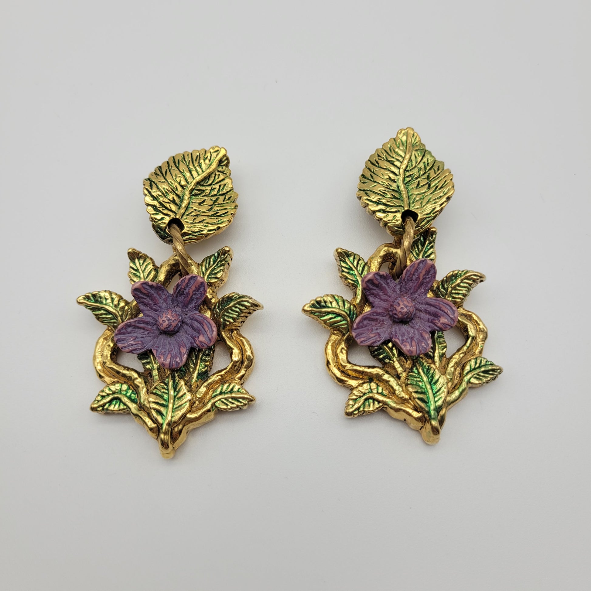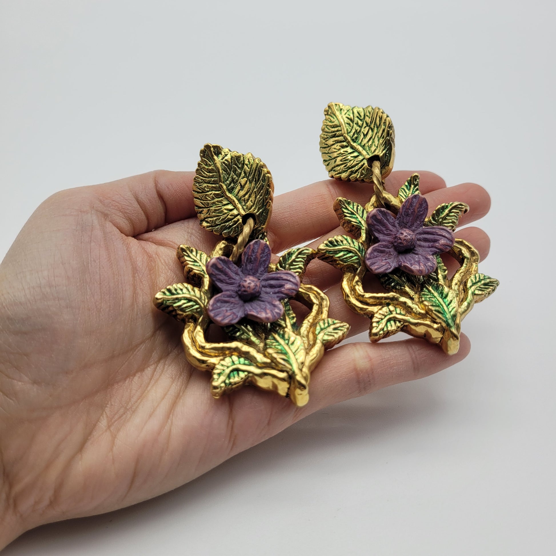 Check out this beautiful pair of vintage flower earrings. These earrings feature intricate violet flowers and green leaves, making them statement vintage earrings.