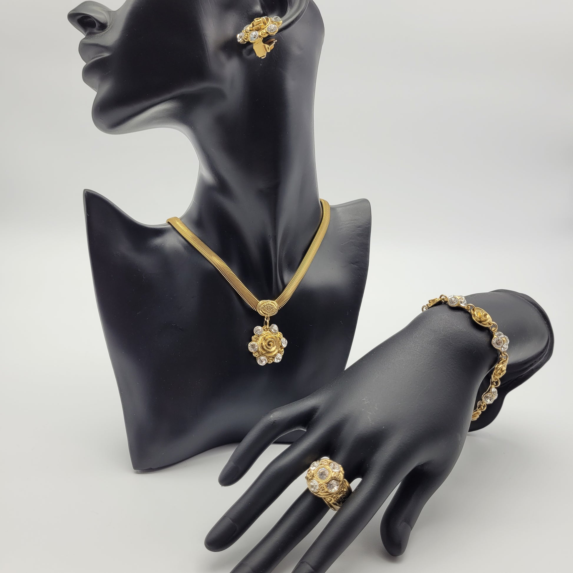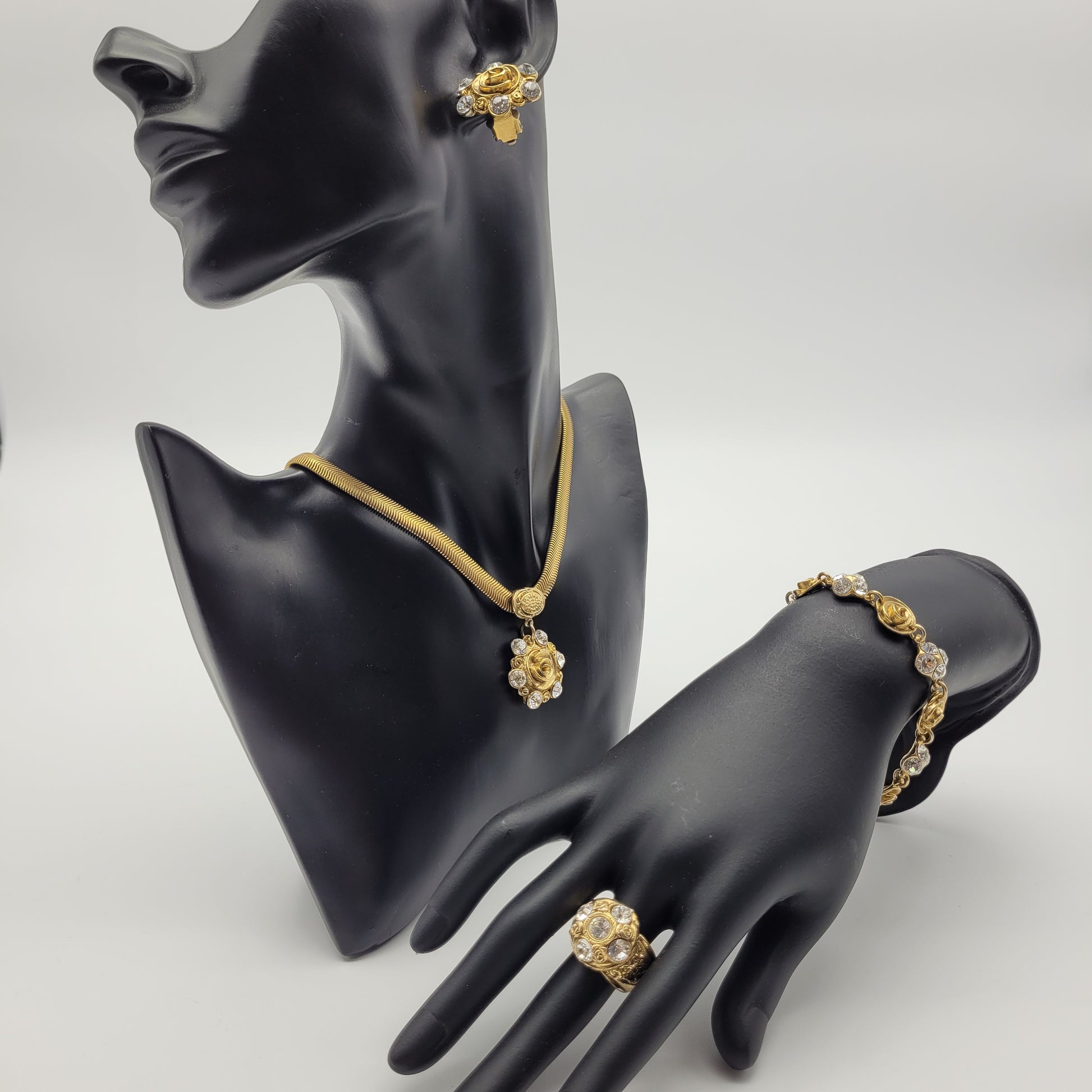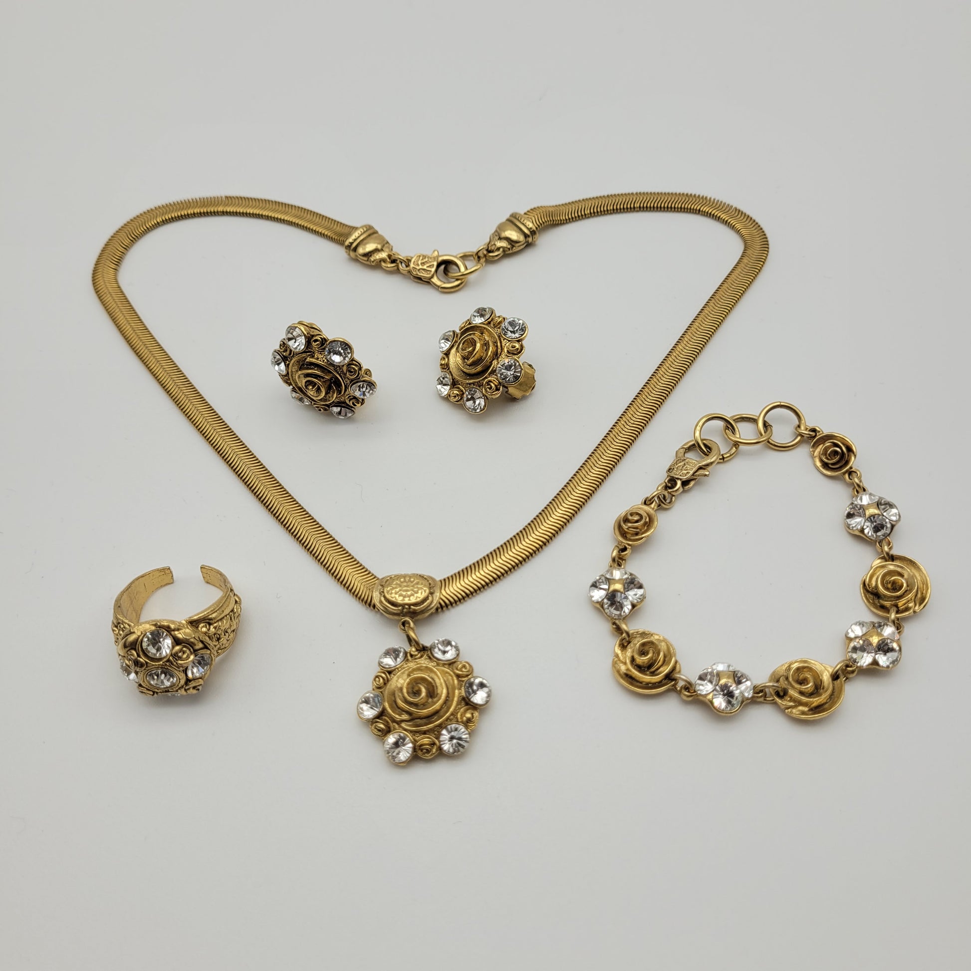 Completing the set is the adjustable rose ring, which is the perfect finishing touch to any look. The ring features 4 tiny bronze roses with clear rhinestones around, adding just the right amount of bling to your fingers.