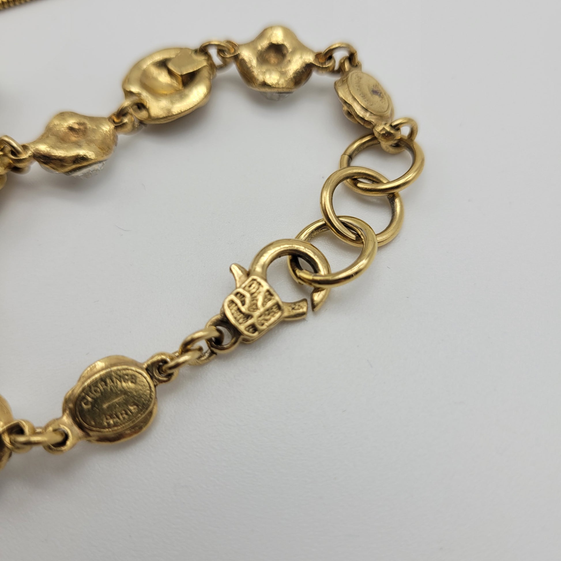 The bracelet is a true statement piece, featuring a stunning set of small bronze roses interspersed with sparkling rhinestones.