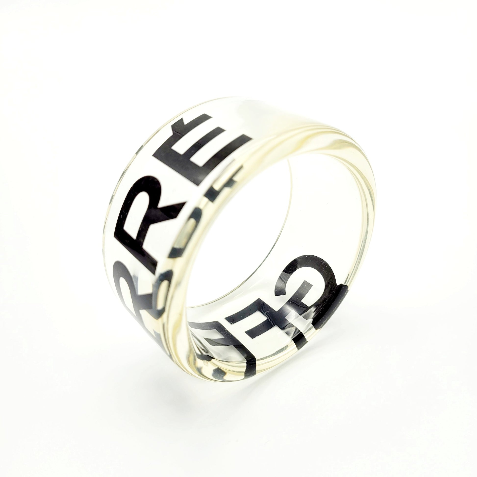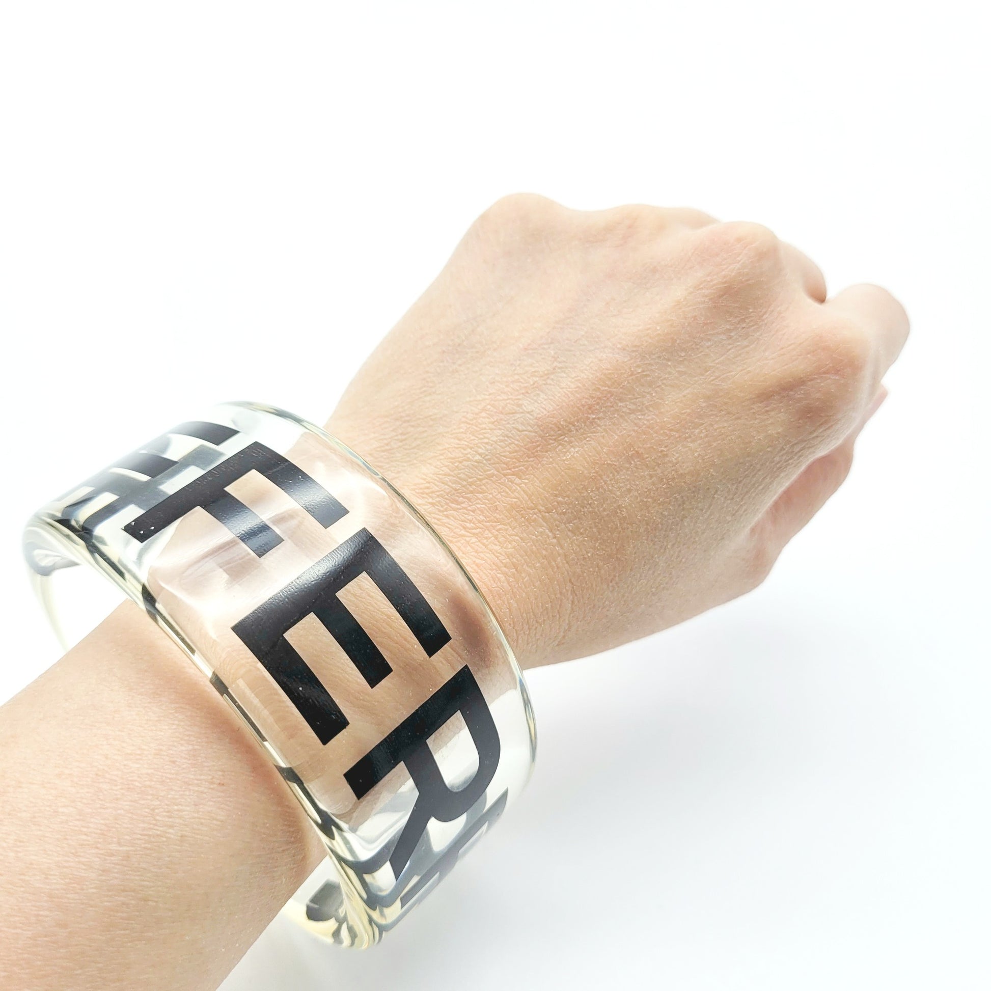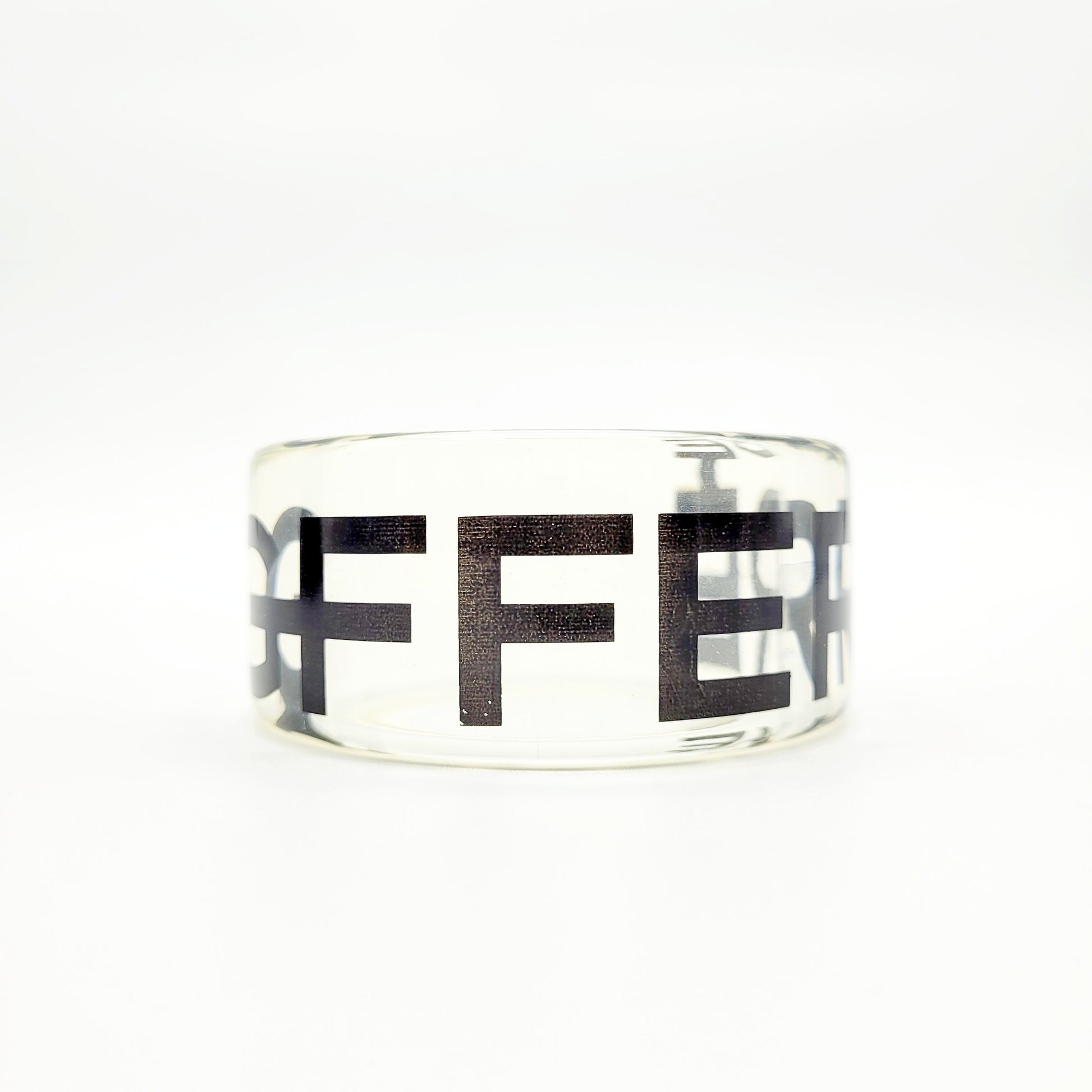 Make a statement and stand out from the crowd with this unique Gianfranco Ferre transparent bangle. With its bold black letters of the brand, this plastic bangle will add eye-catching detail to your style. Plus it's easy to wear, lightweight, and comfortable with a modern twist.