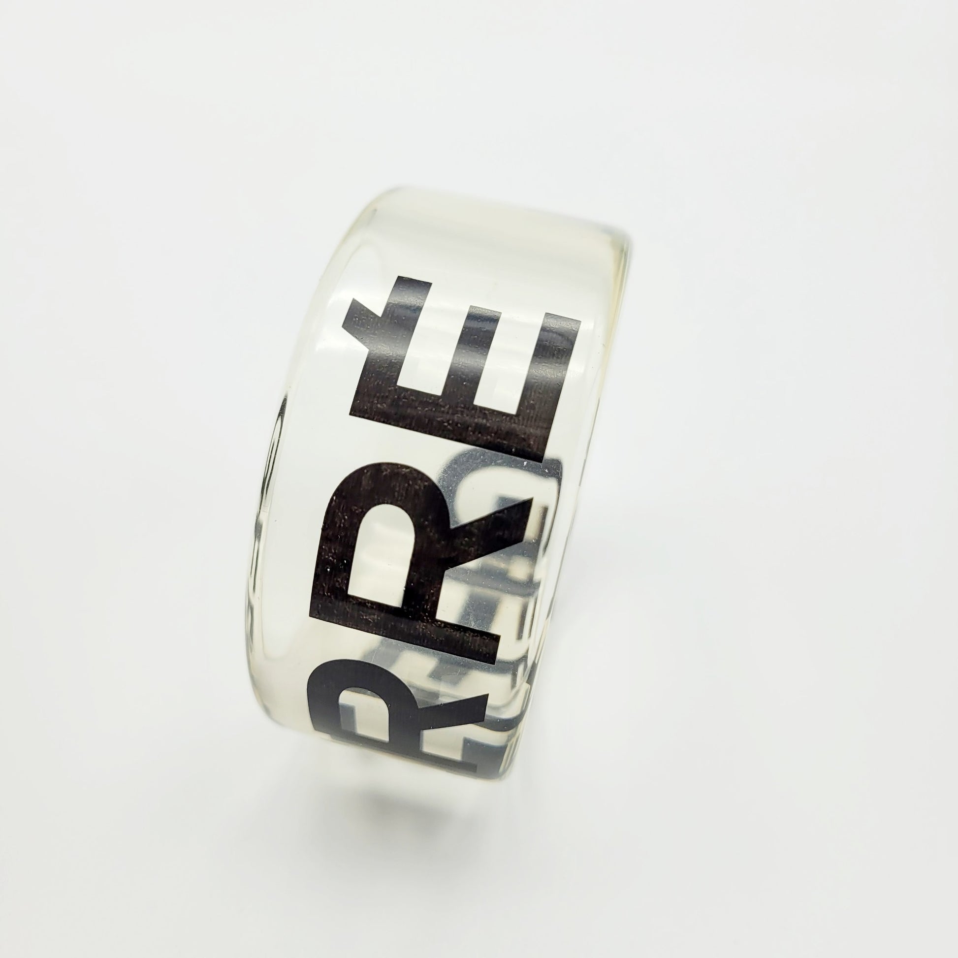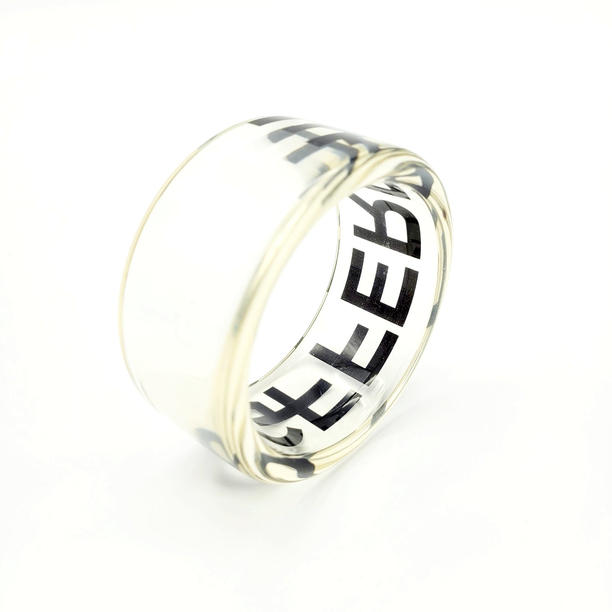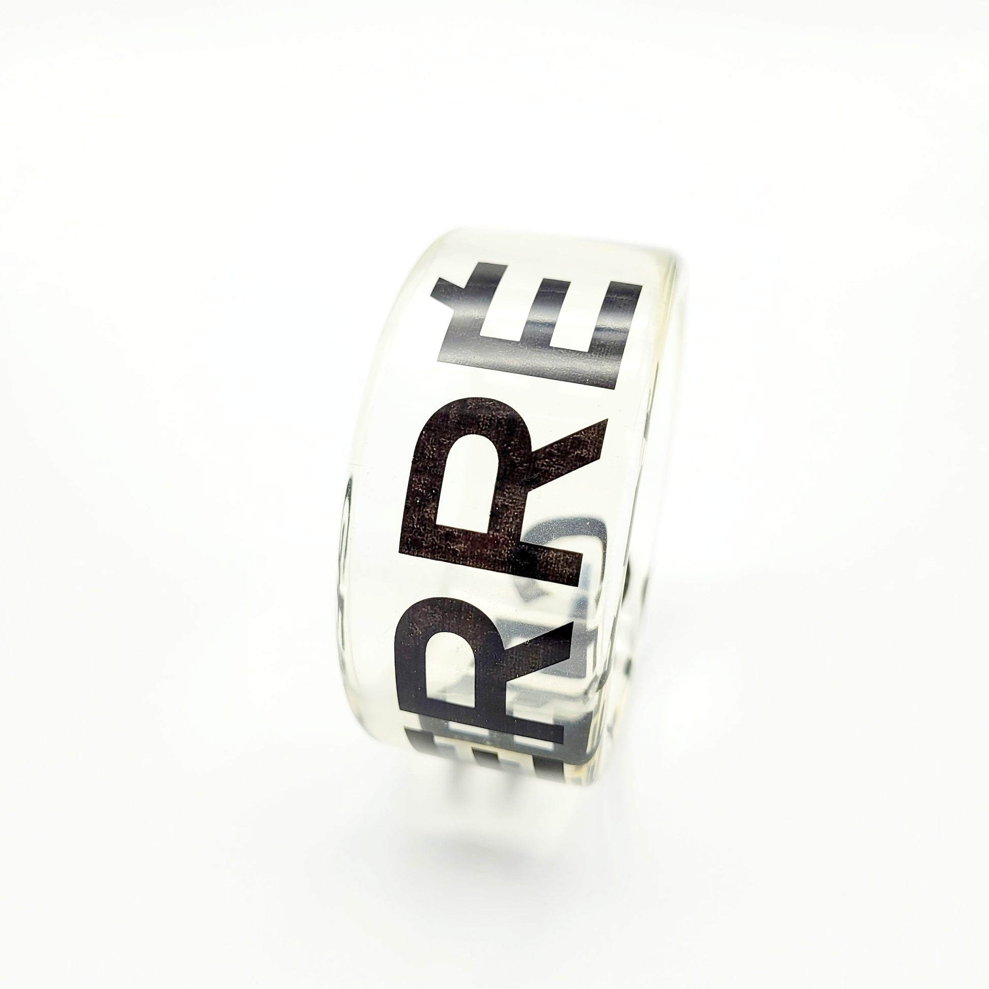 Make a statement and stand out from the crowd with this unique Gianfranco Ferre transparent bangle. With its bold black letters of the brand, this plastic bangle will add eye-catching detail to your style. Plus it's easy to wear, lightweight, and comfortable with a modern twist.