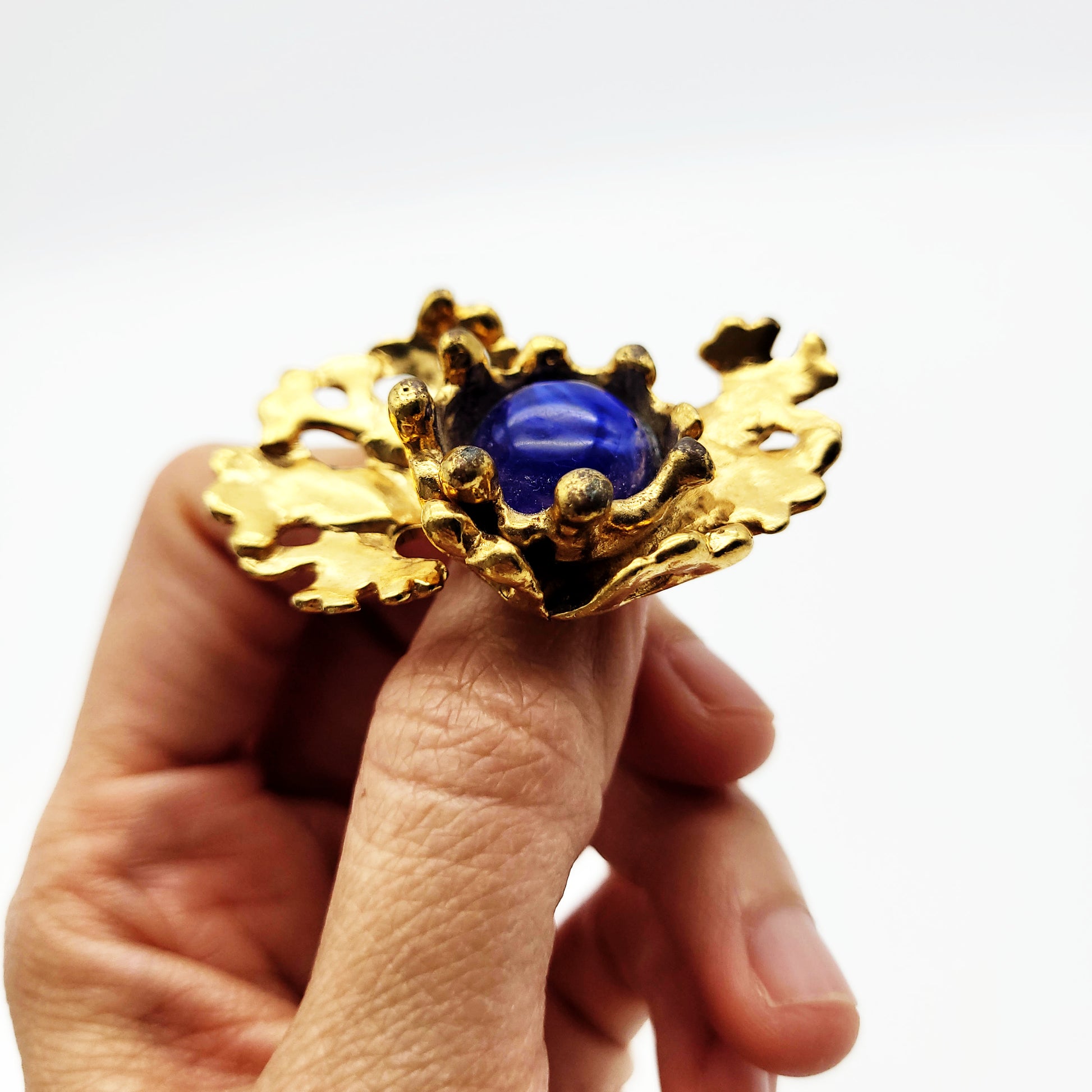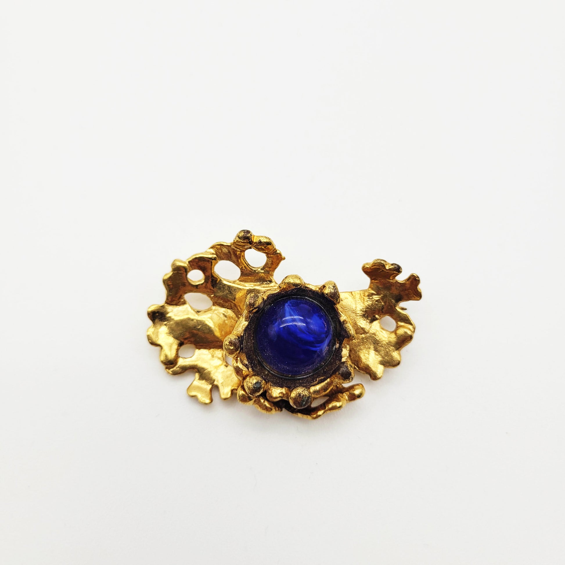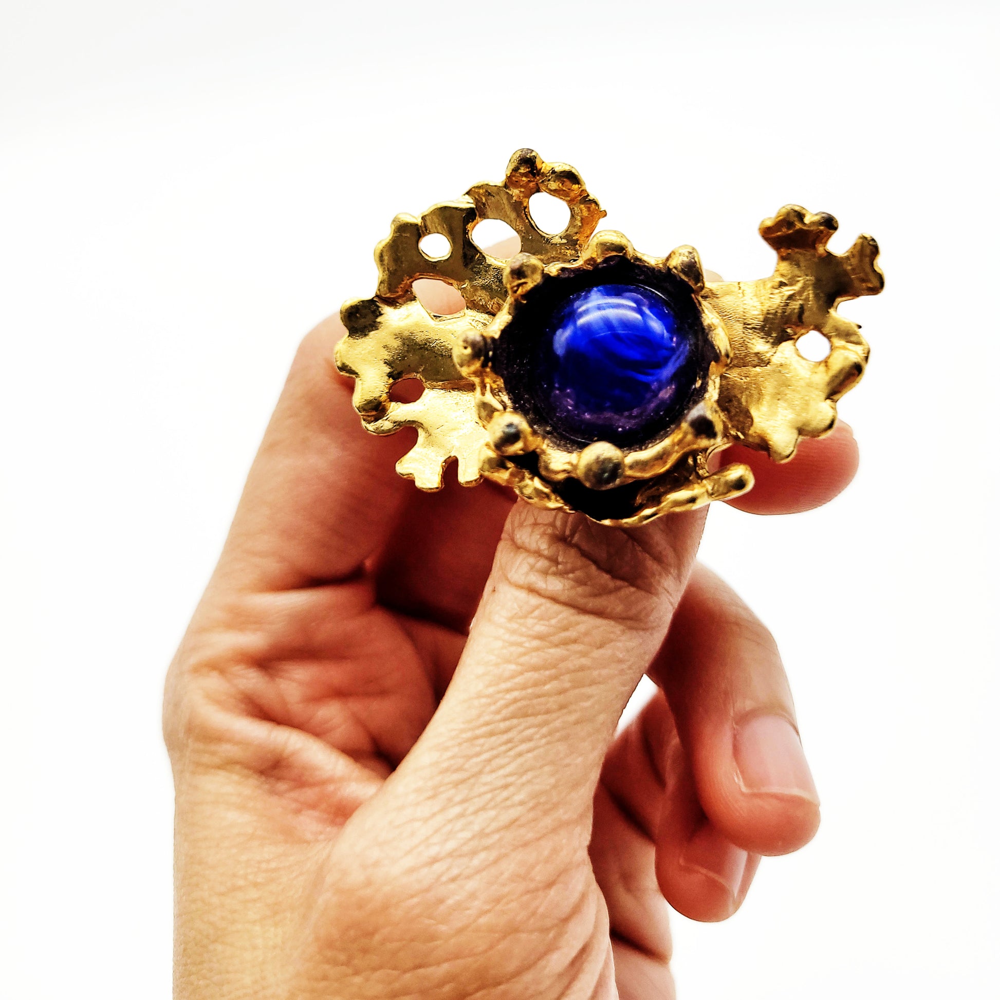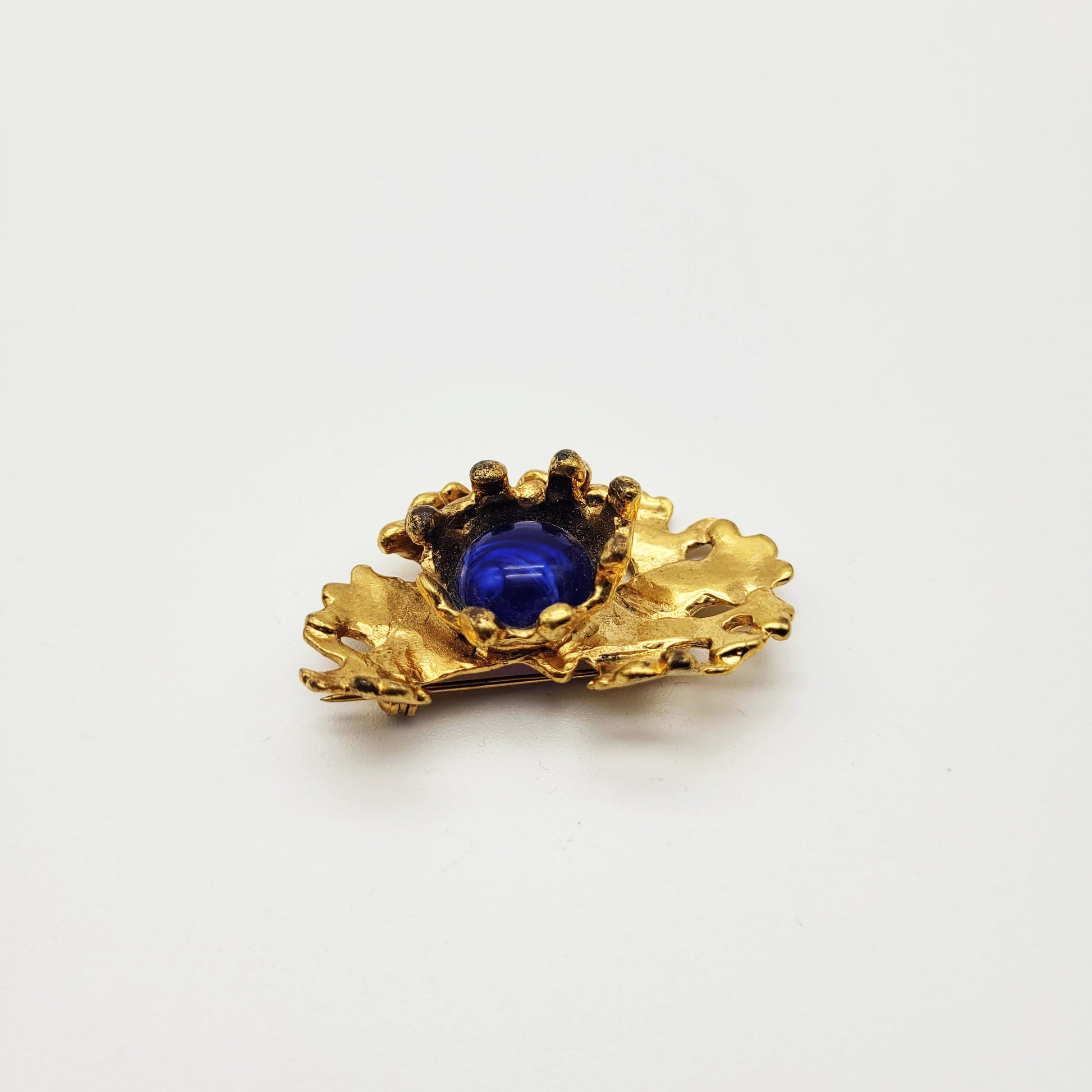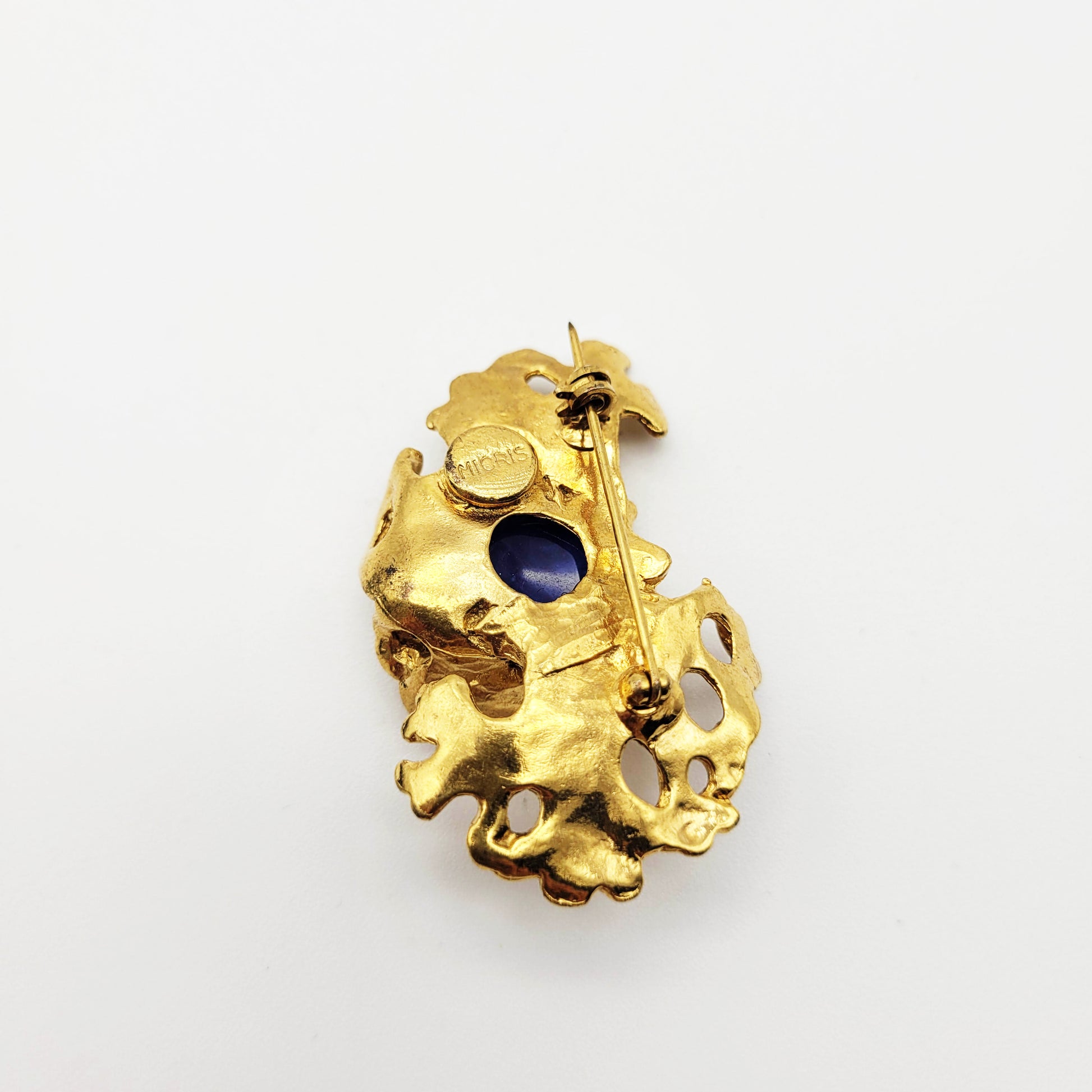 Embellishing the brooch is a large round glass bead in blue that demands attention. This vintage brooch from Micris is a fashion accessory and a timeless beauty. Whether worn on a lapel, fastened to a scarf, or adorning a hat, this brooch is a versatile piece that effortlessly elevates any outfit.