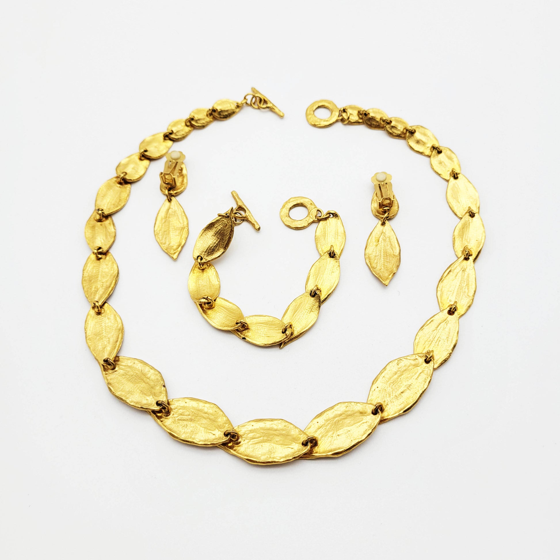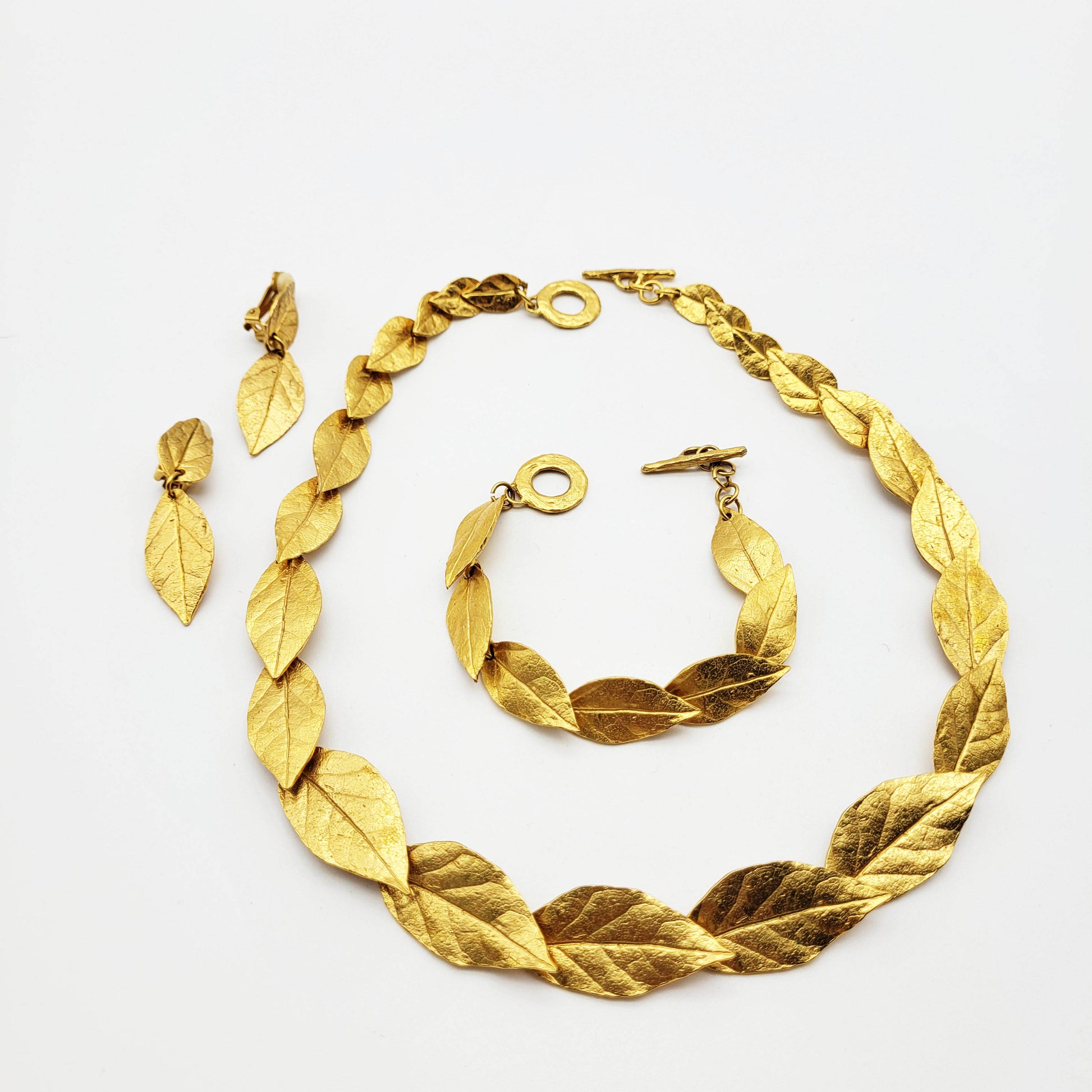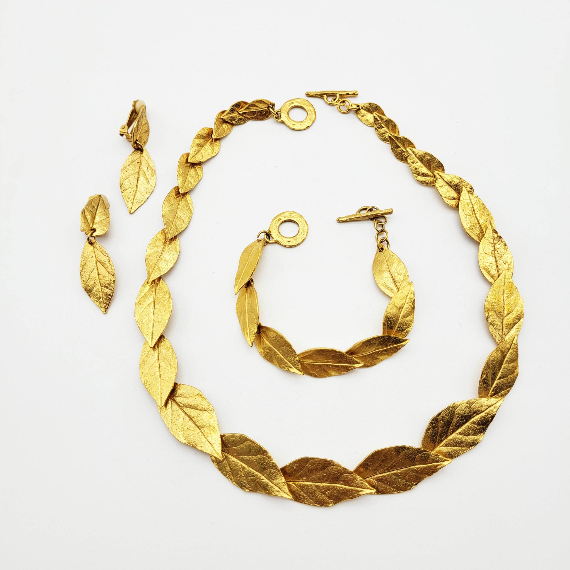 This unique vintage gold plated jewelry set is stunning. This vintage jewelry set composes a necklace, a pair of dangle earrings, and a bracelet. This gorgeous jewelry set features a leaf motif. This jewelry set is perfect for special occasions.