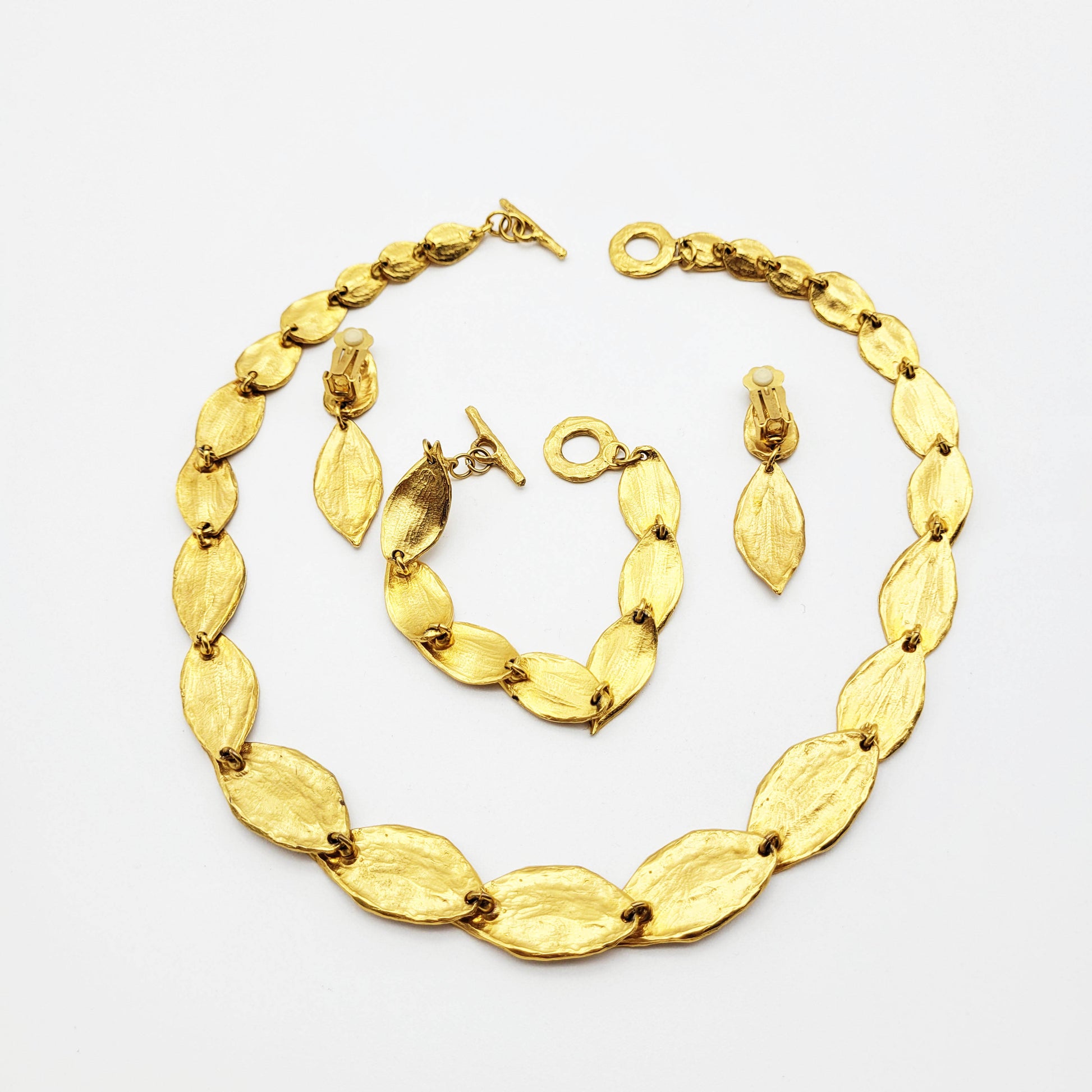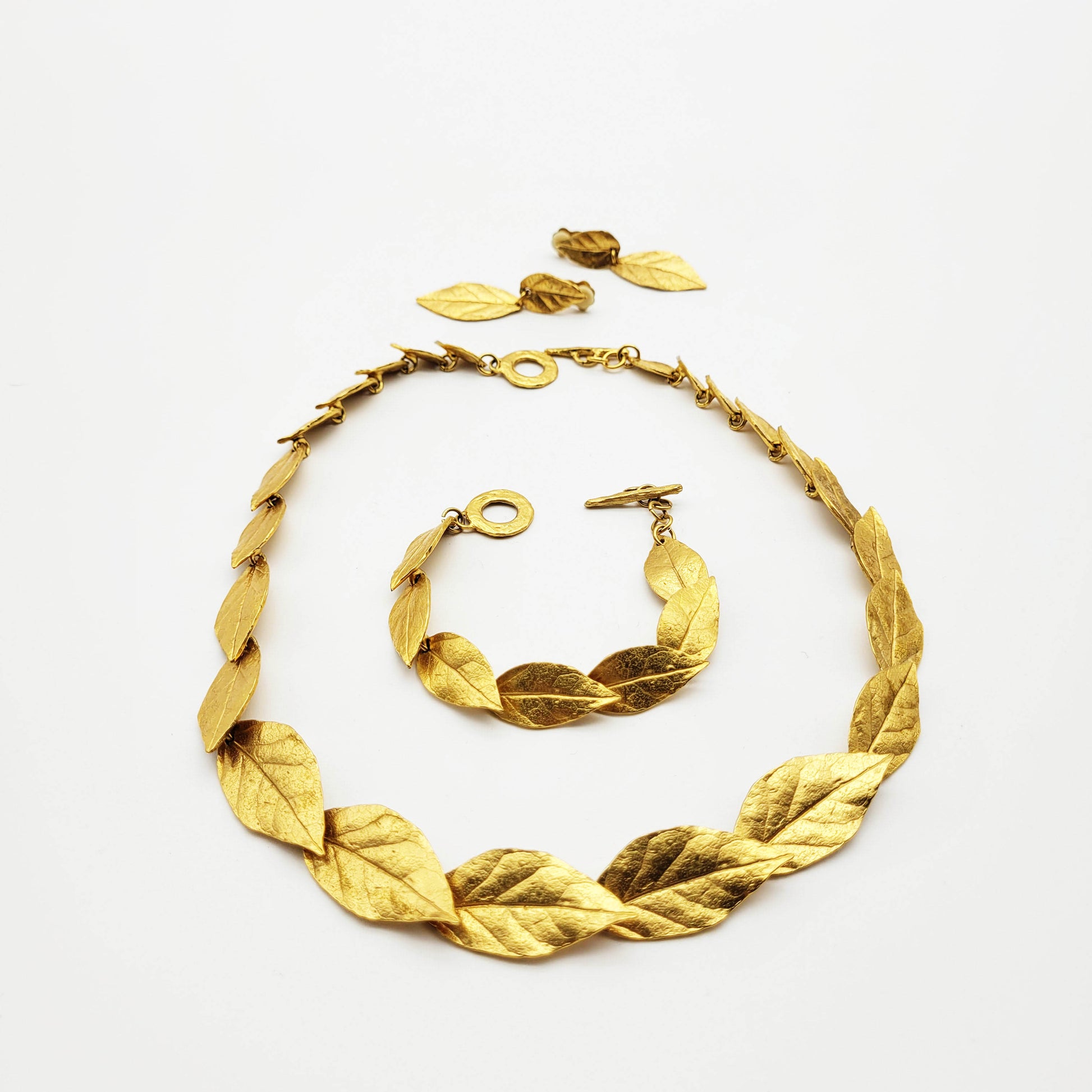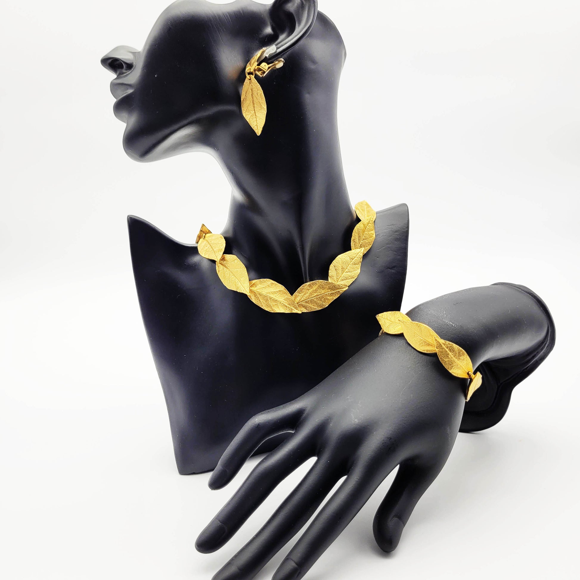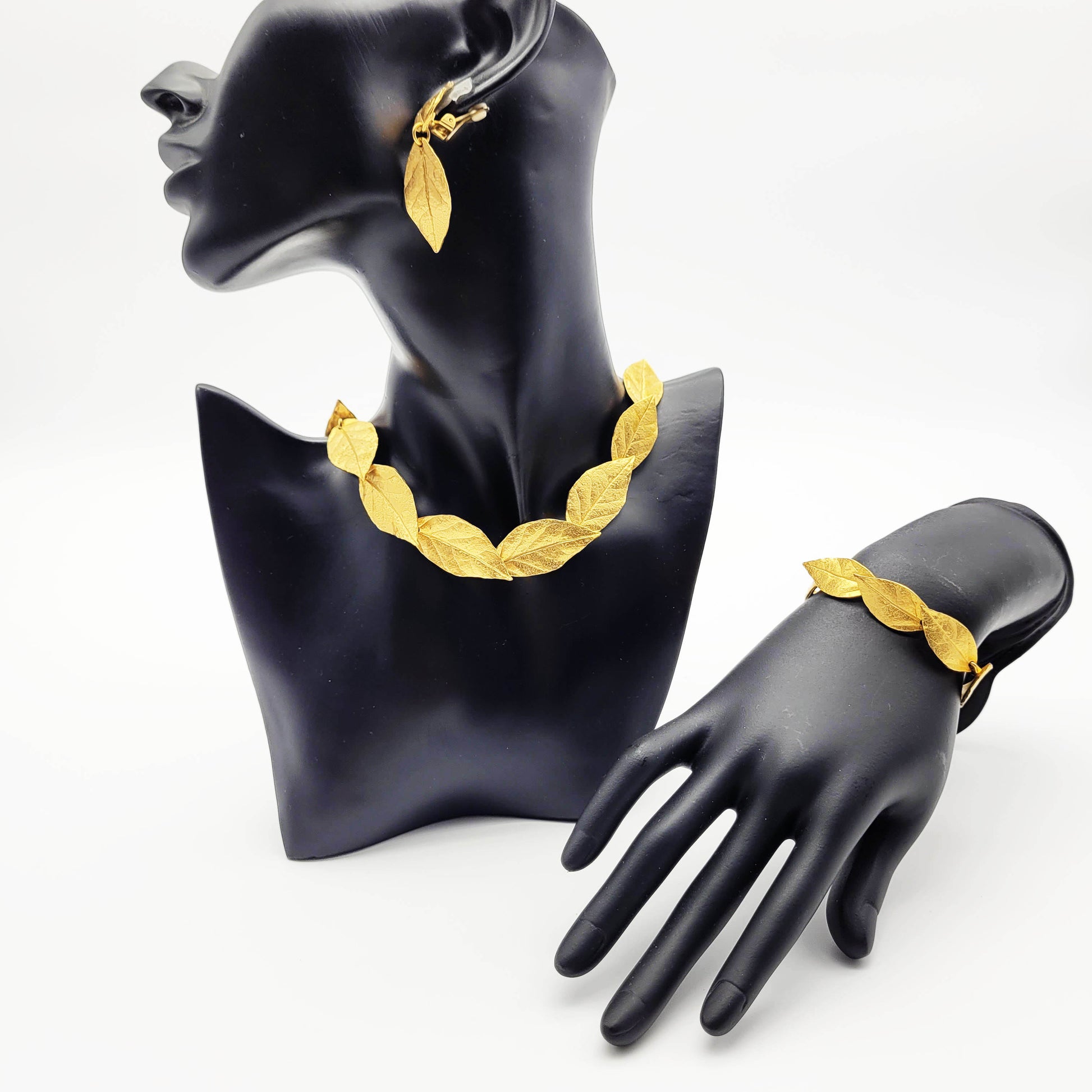 This unique vintage gold plated jewelry set is stunning. This vintage jewelry set composes a necklace, a pair of dangle earrings, and a bracelet. This gorgeous jewelry set features a leaf motif. This jewelry set is perfect for special occasions.