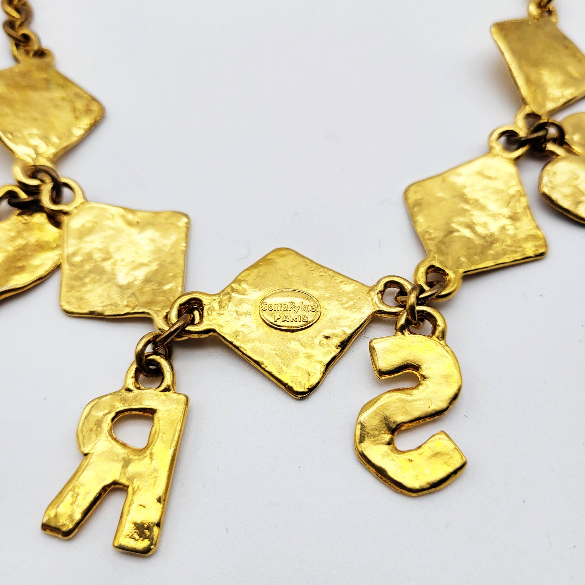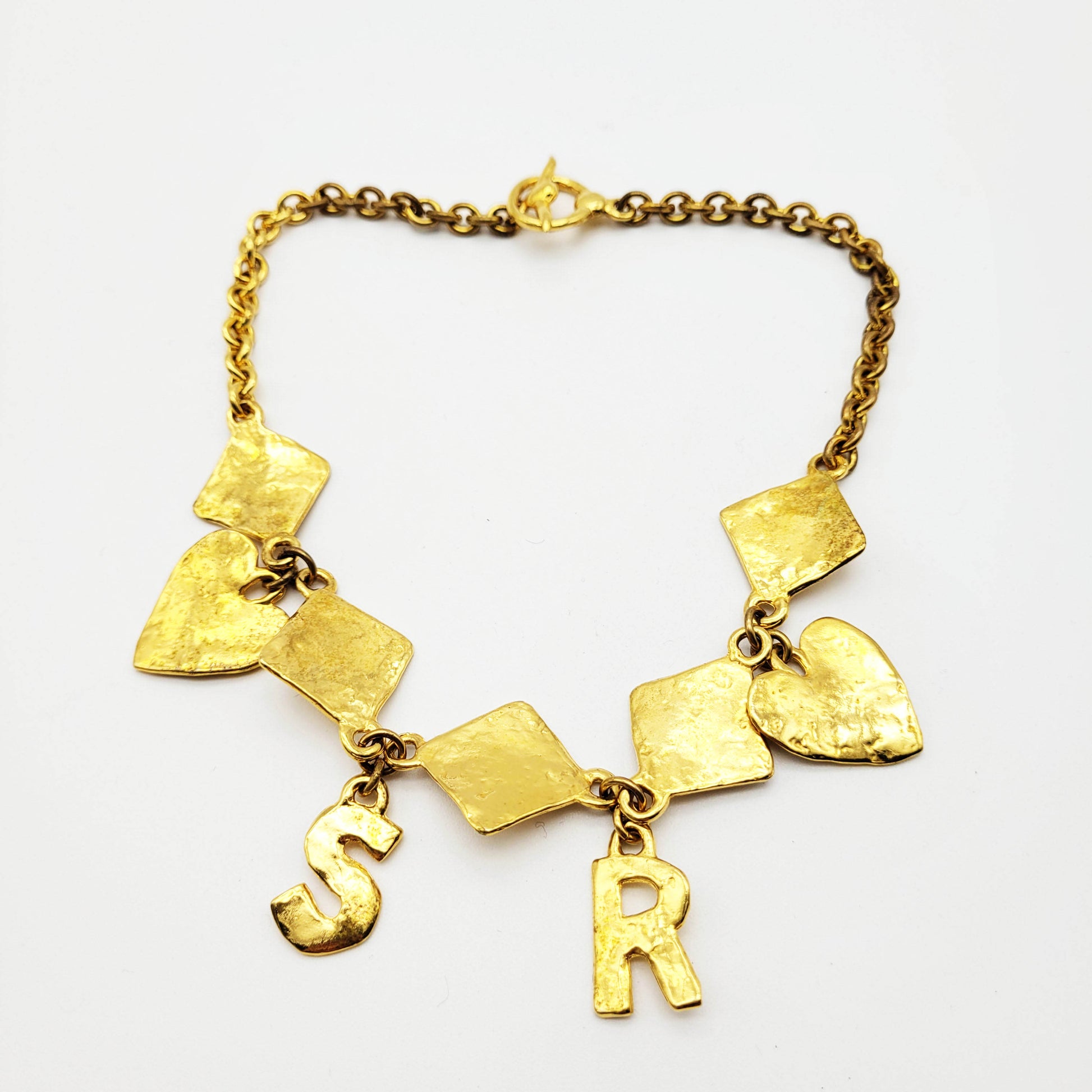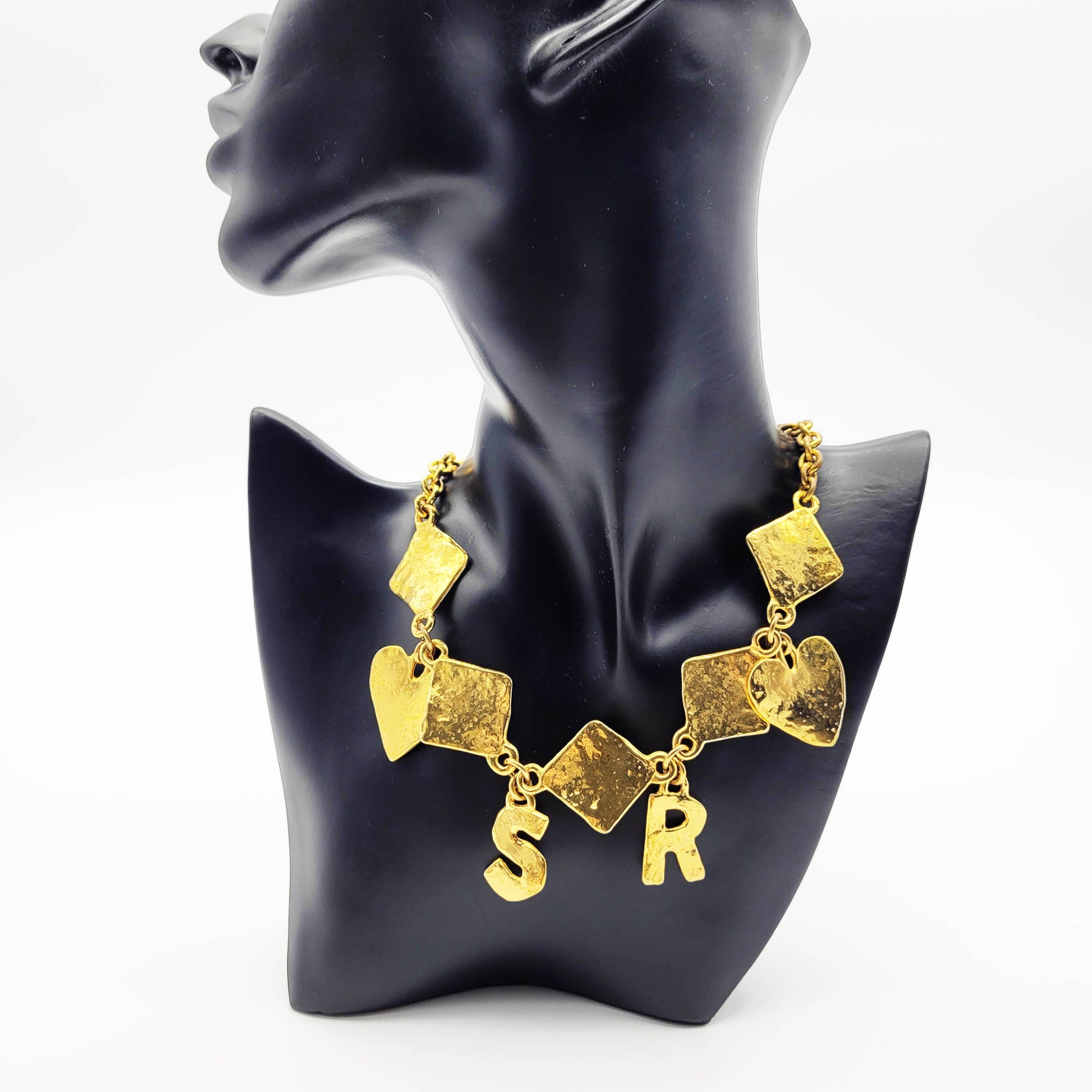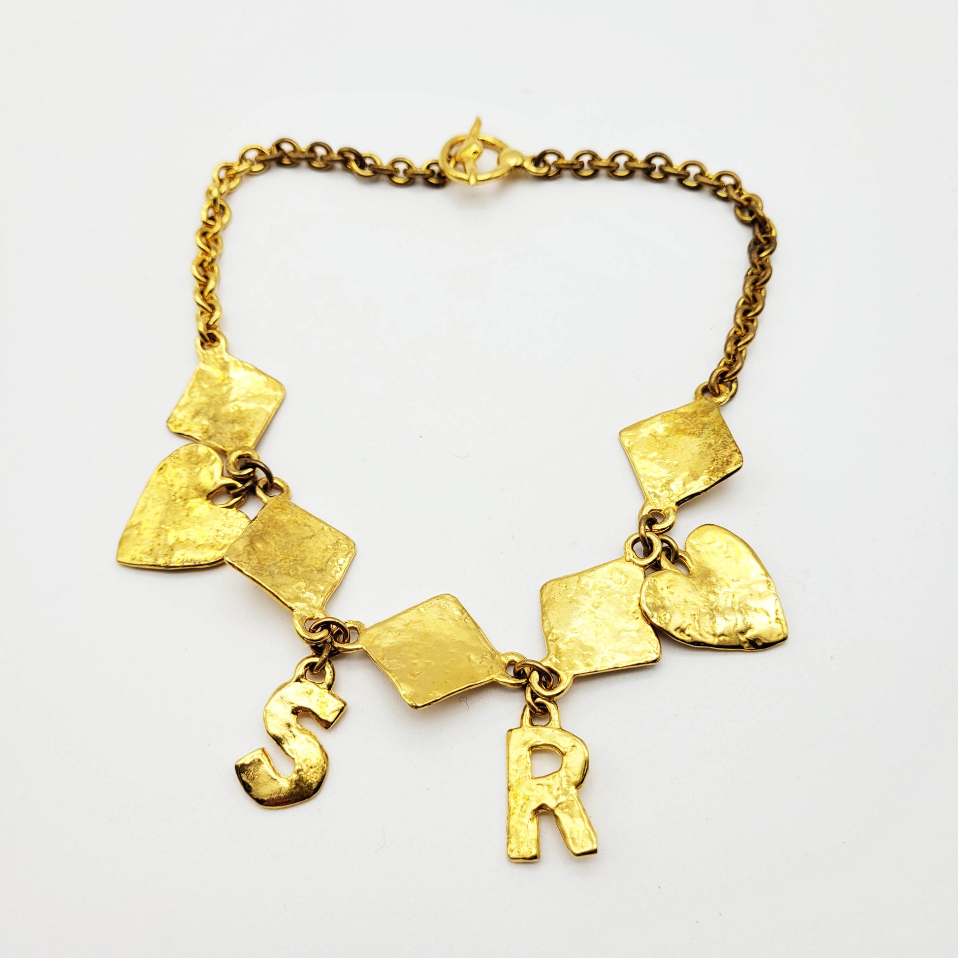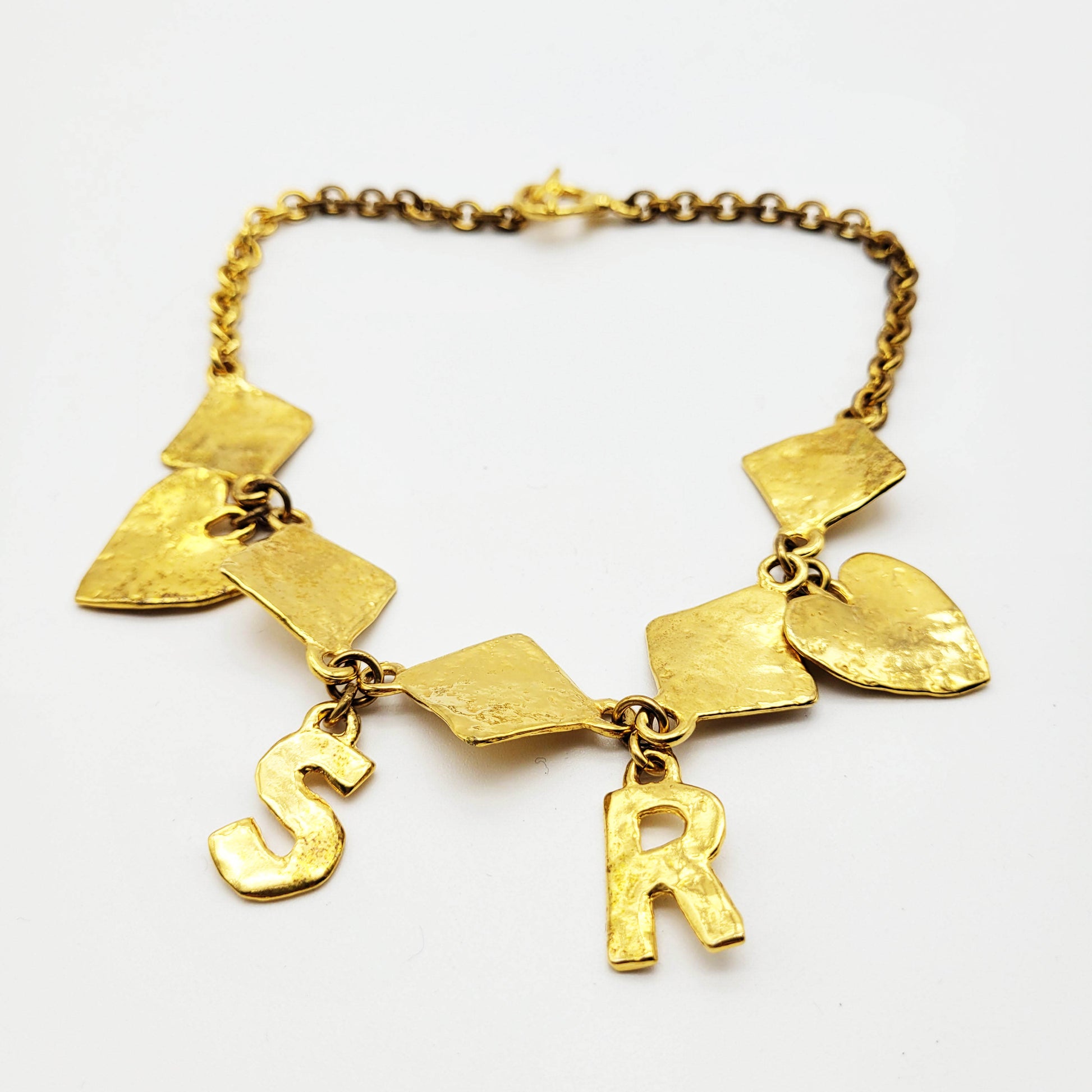 Bold vintage goldtone necklace from Sonia Rykiel. This unique necklace features the initial letters from the brand with heart and diamond shapes.