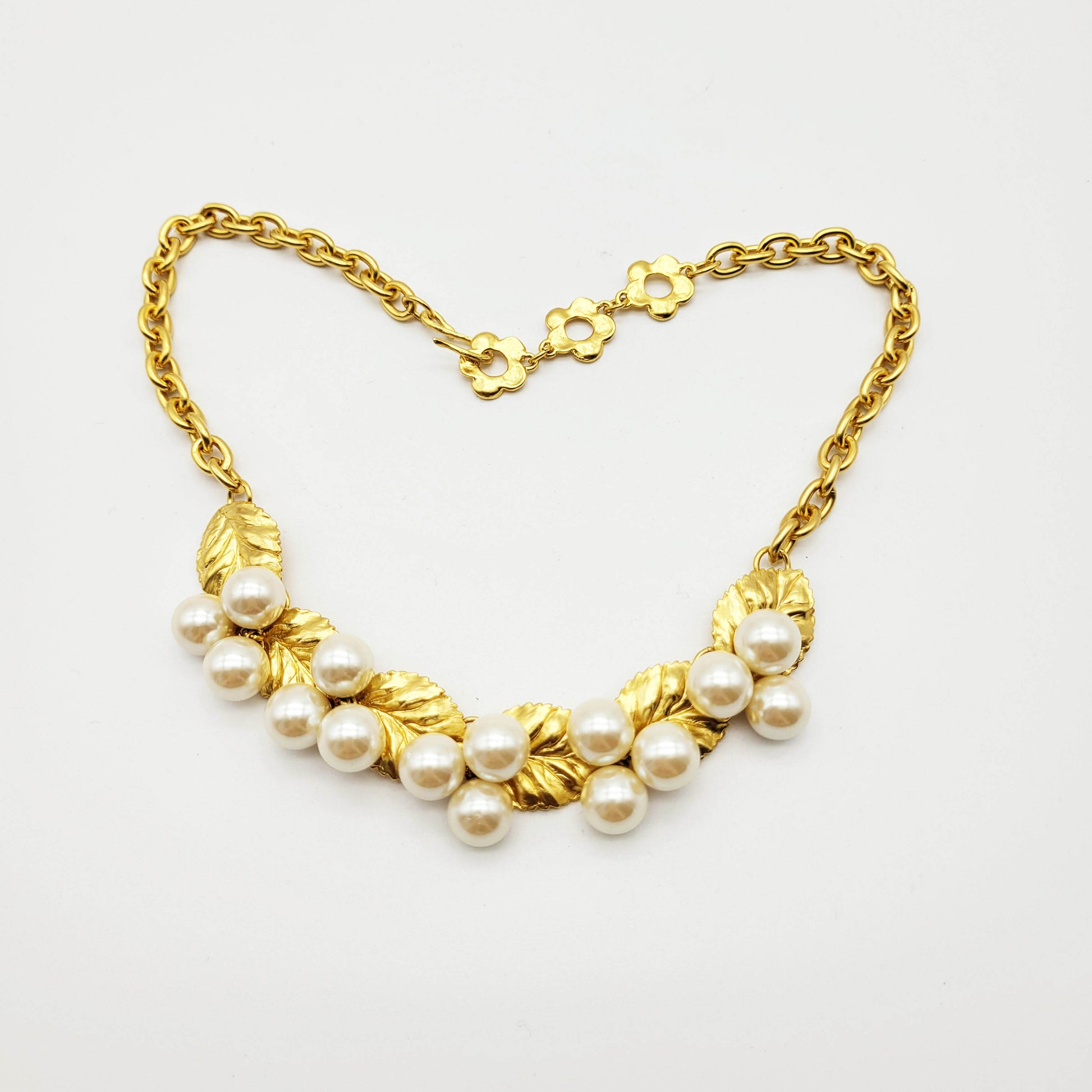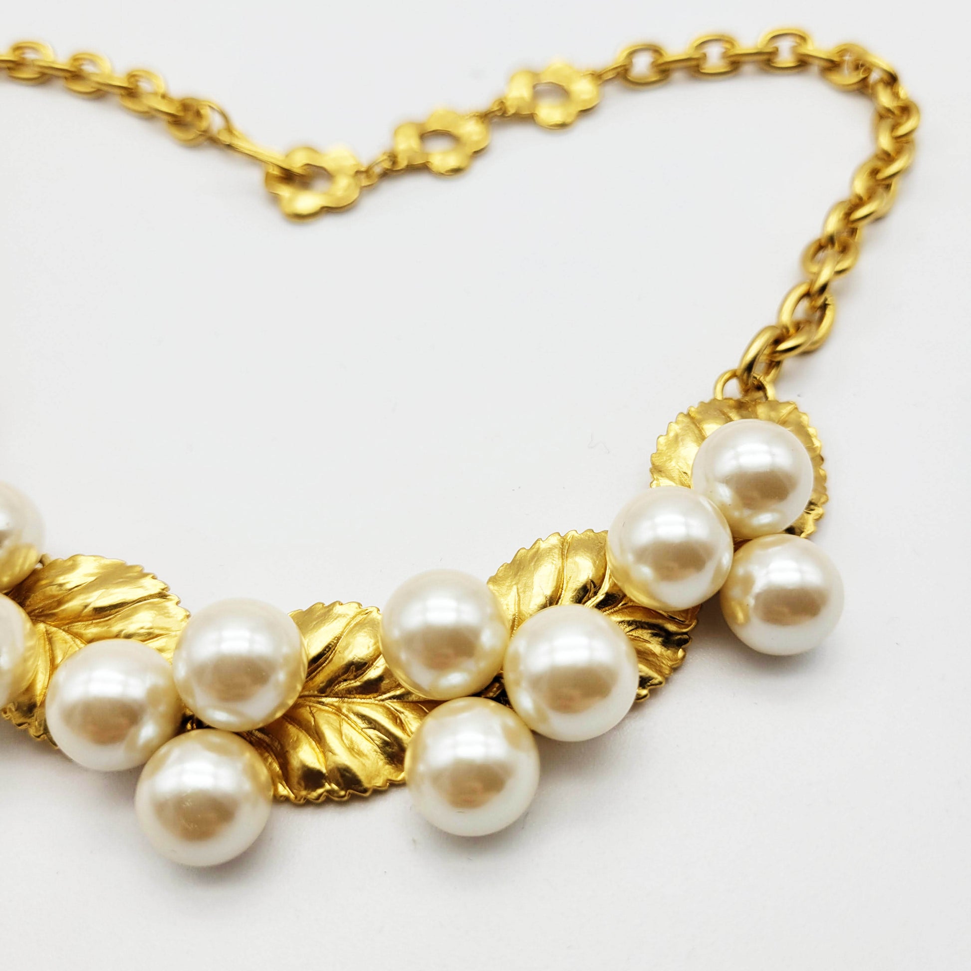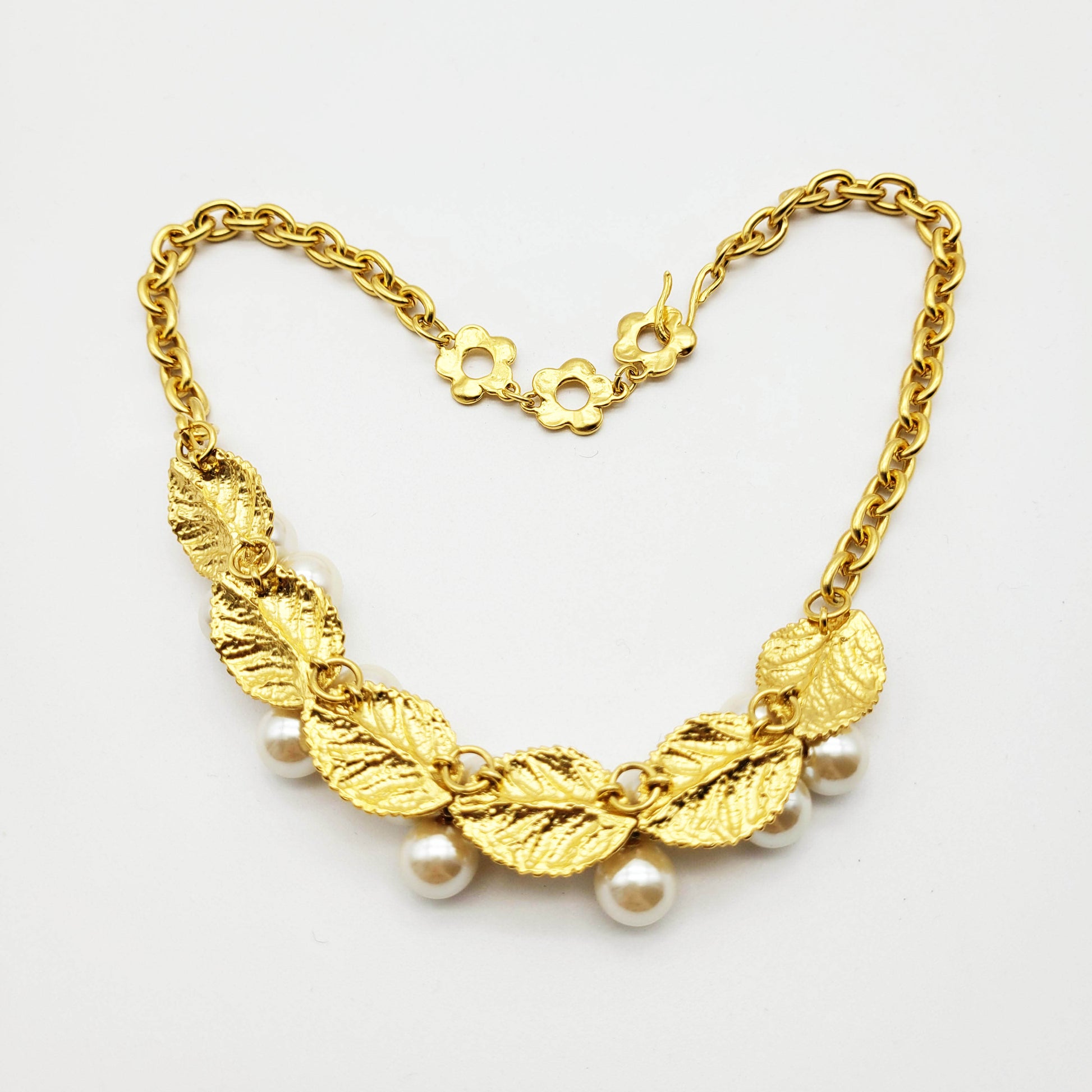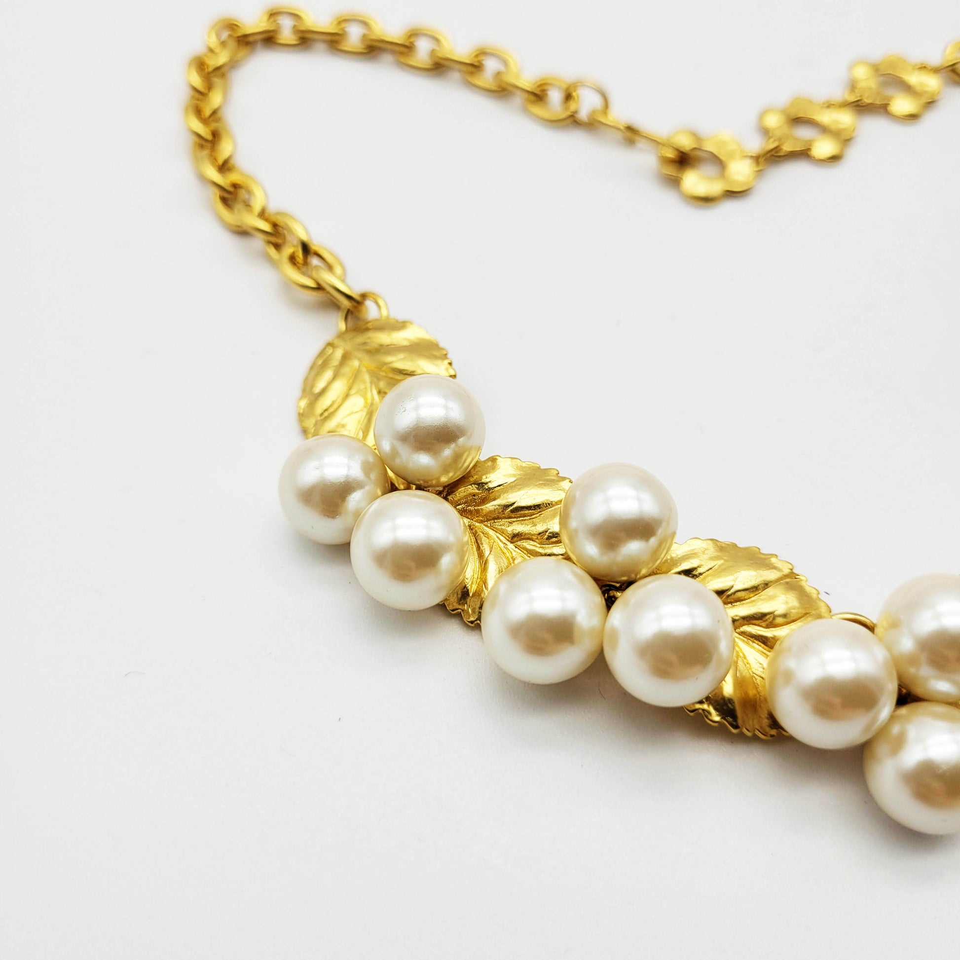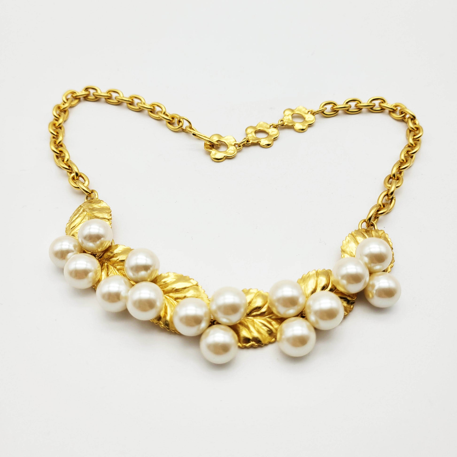 Gorgeous vintage necklace from Kenzo with leaf motif and faux pearls. This unique necklace has a timeless and classic design that is suitable for special occasions.