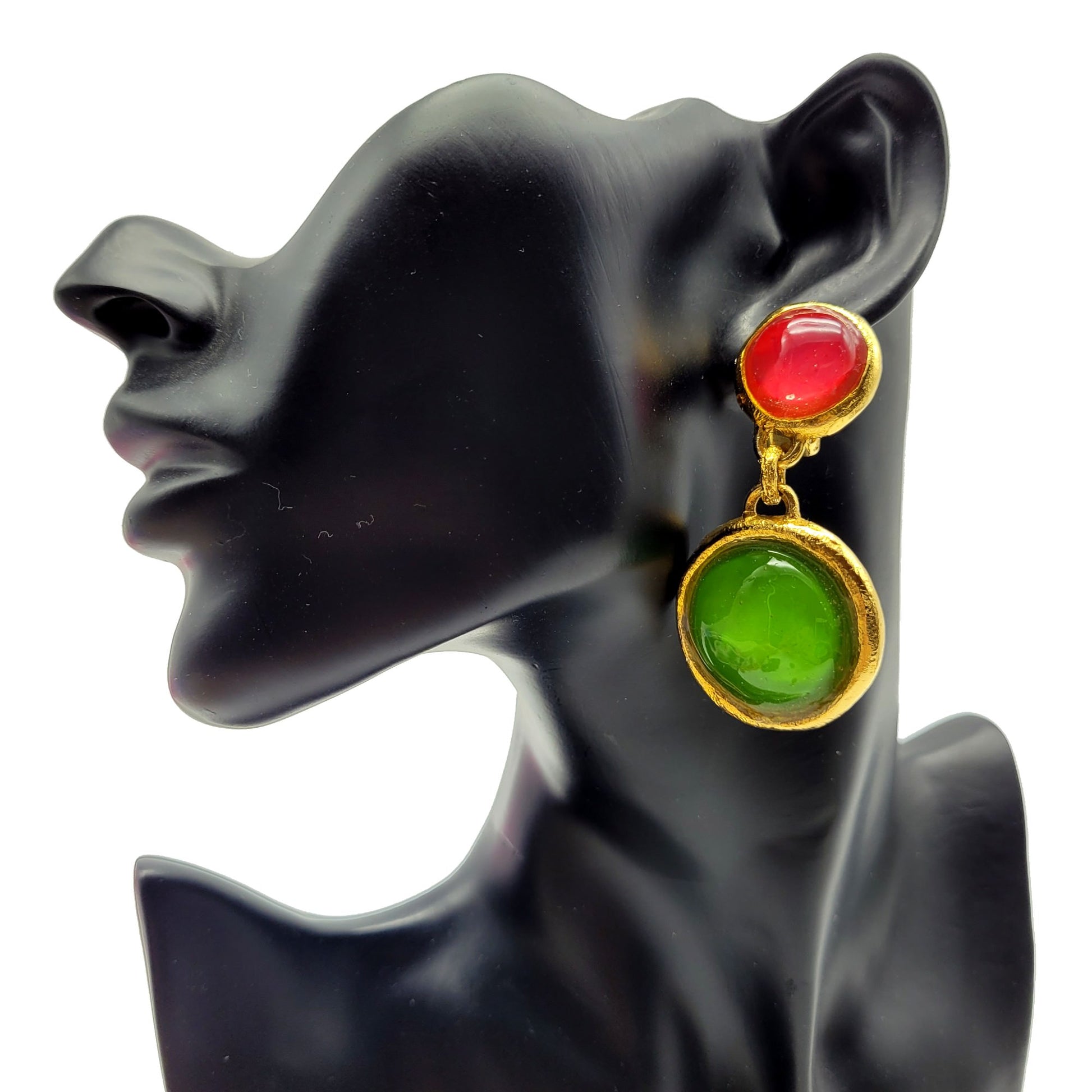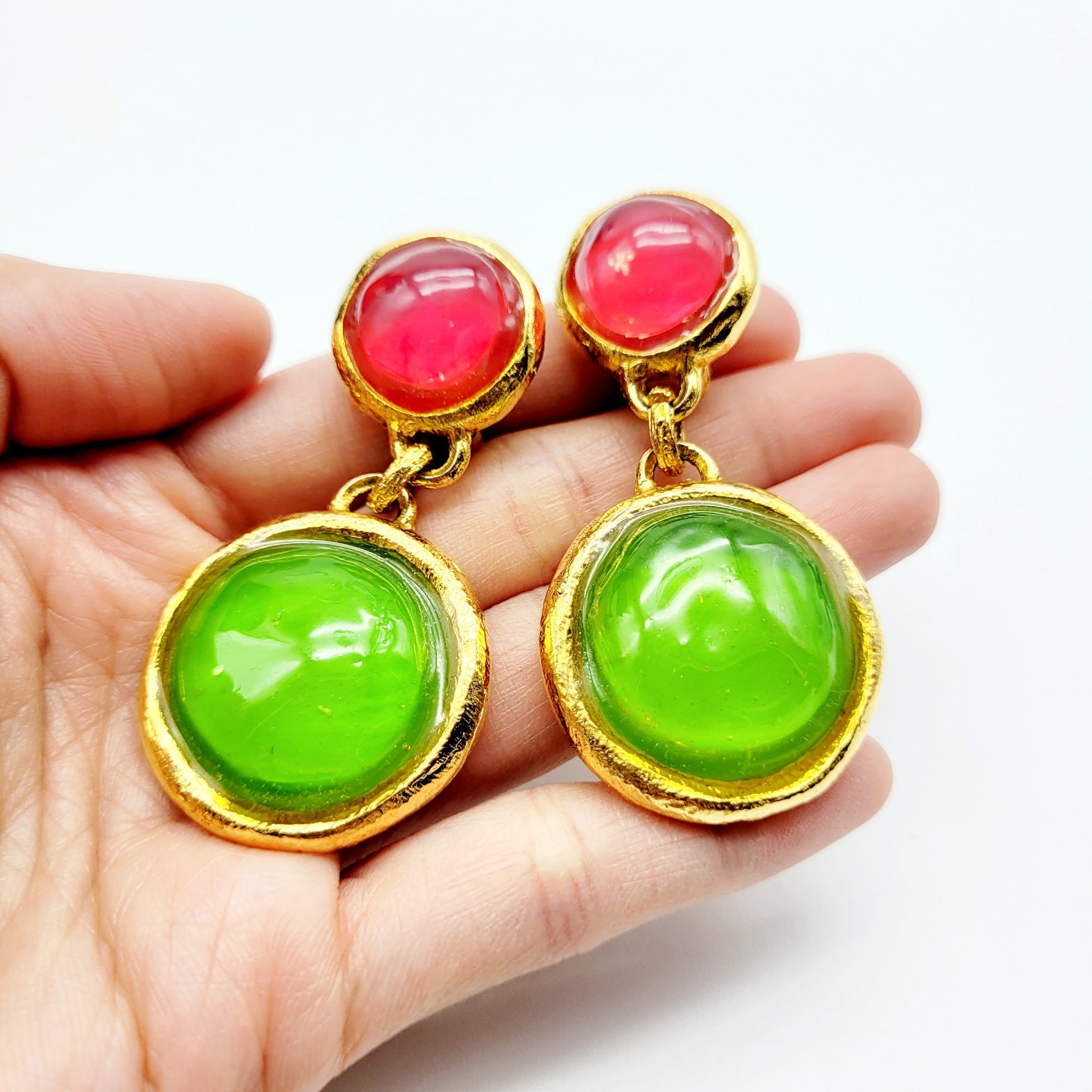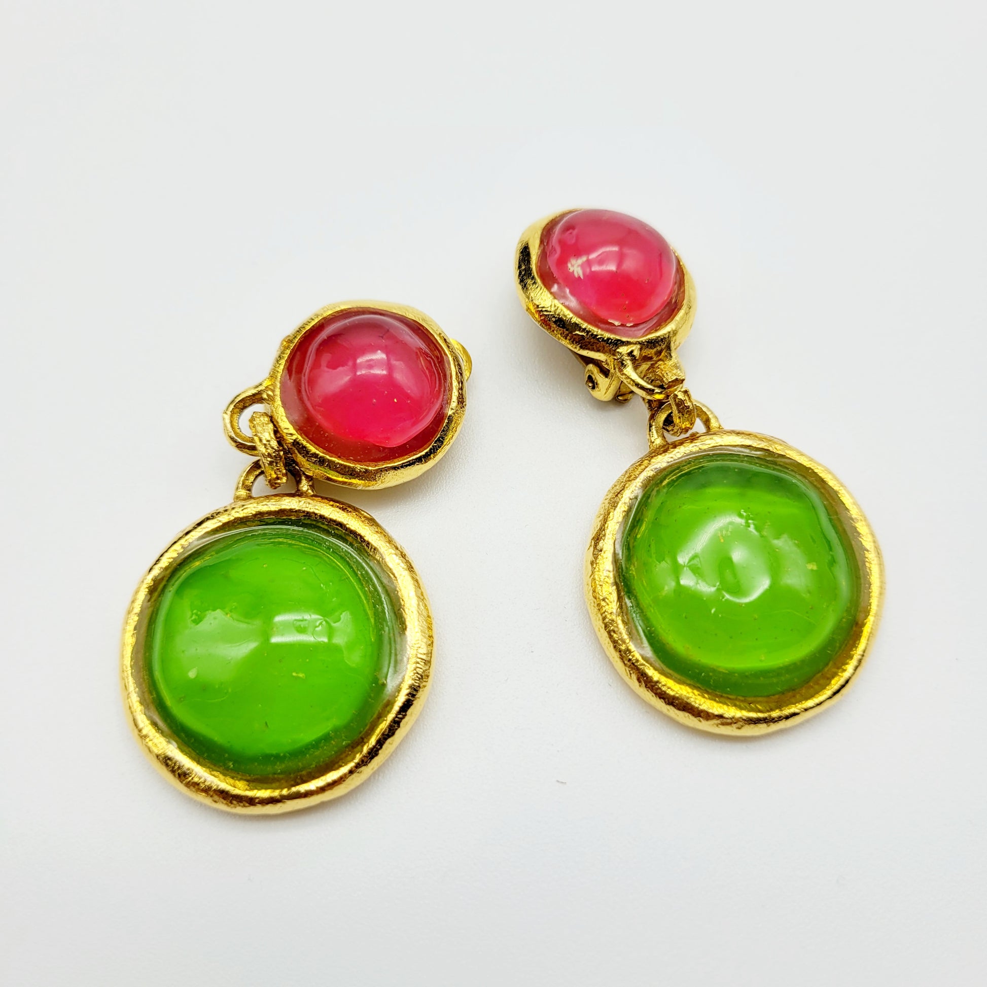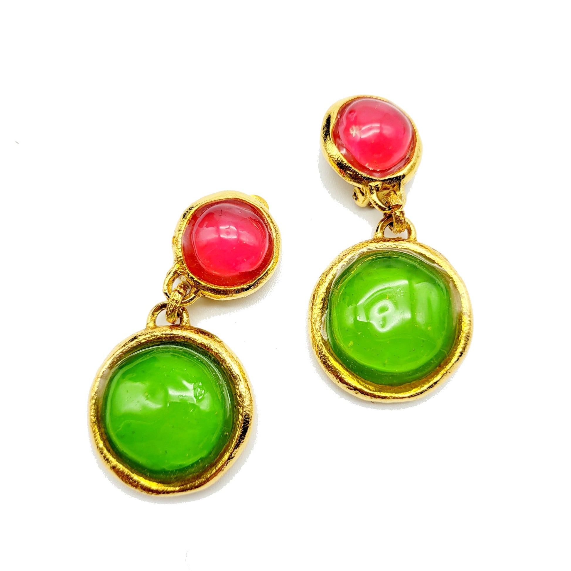 These vintage dangle earrings feature poured glass cabochons in shades of pink and green. The vibrant colors add a playful touch to the classic design, making them a perfect accessory to brighten up any outfit.